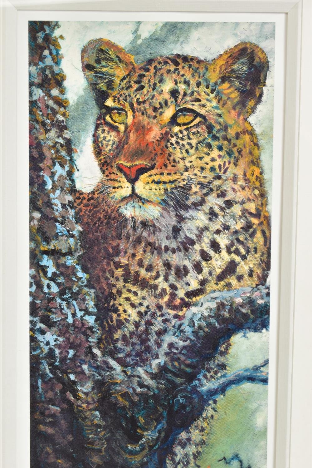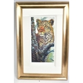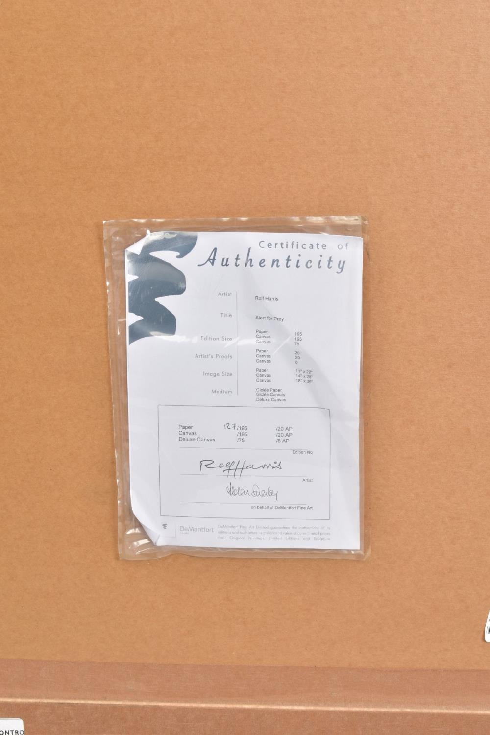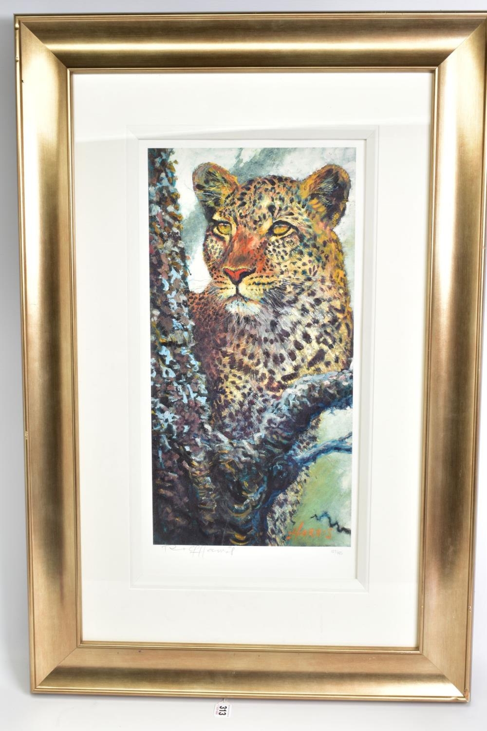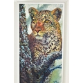 ROLF HARRIS (AUSTRIALIA 1930) 'ALERT FOR PREY', a limited edition print 127/195, a leopard in a tree, signed to lower margin, with certificate, mounted, framed and glazed, approximate sizes: image 60cm x 30cm, frame 93cm x 61cm (condition: frame damaged) (A)