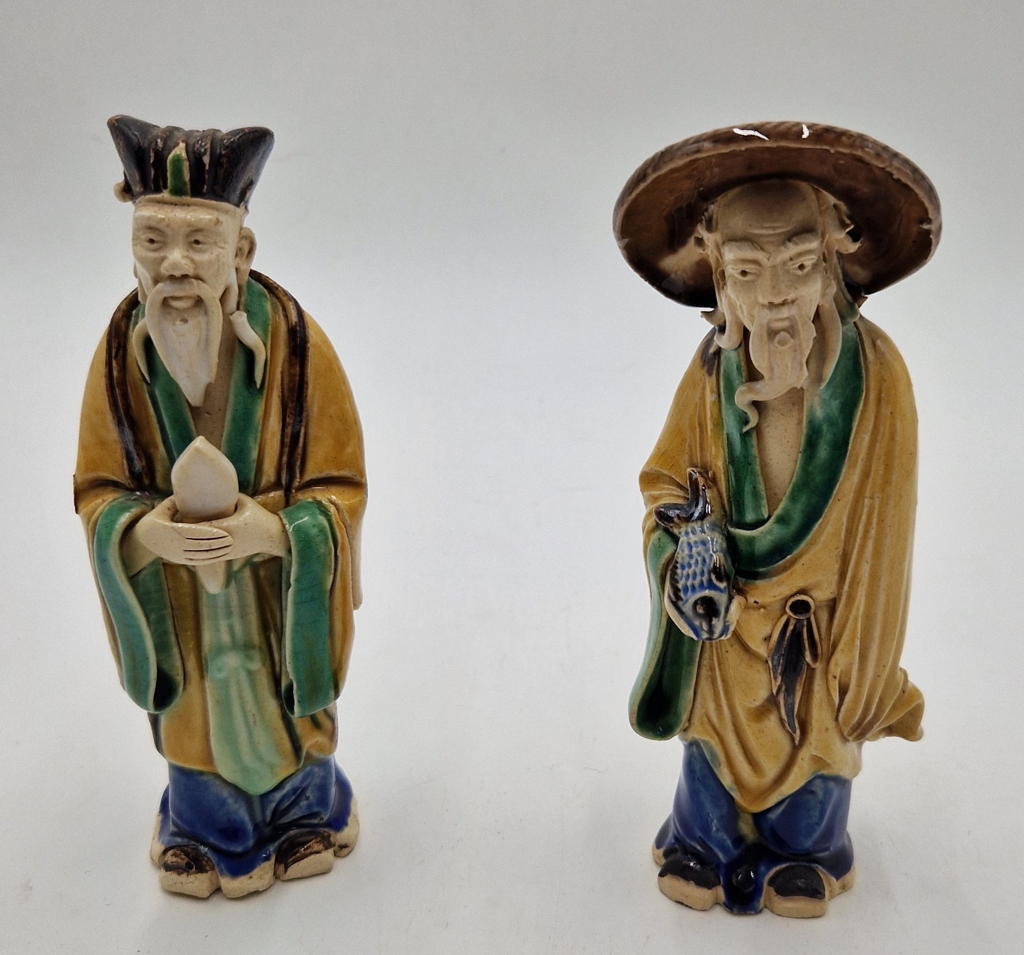 CHINESE MUD/CLAY CHARACTER FIGURINES (2) "FISHERMAN" (Head Restuck) And "SAGE"