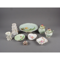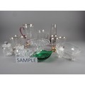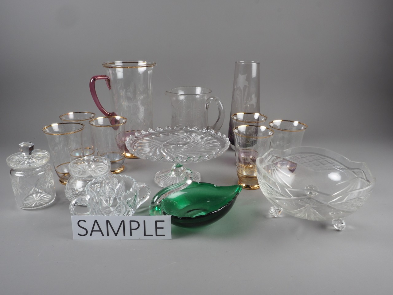A glass lemonade jug and six glasses with gilt decoration and assorted glass tableware, etc