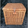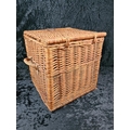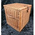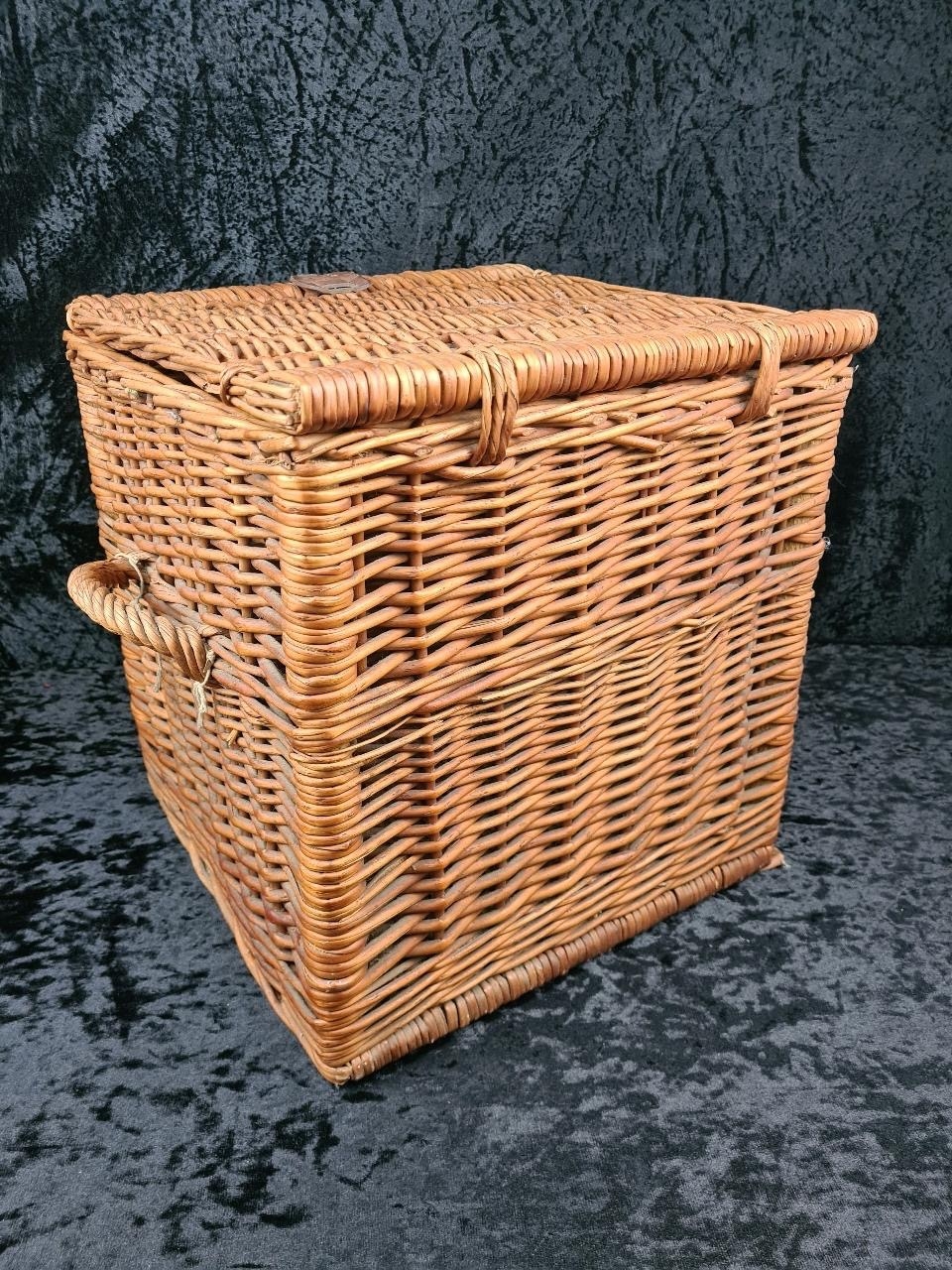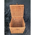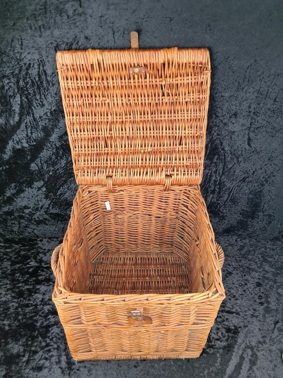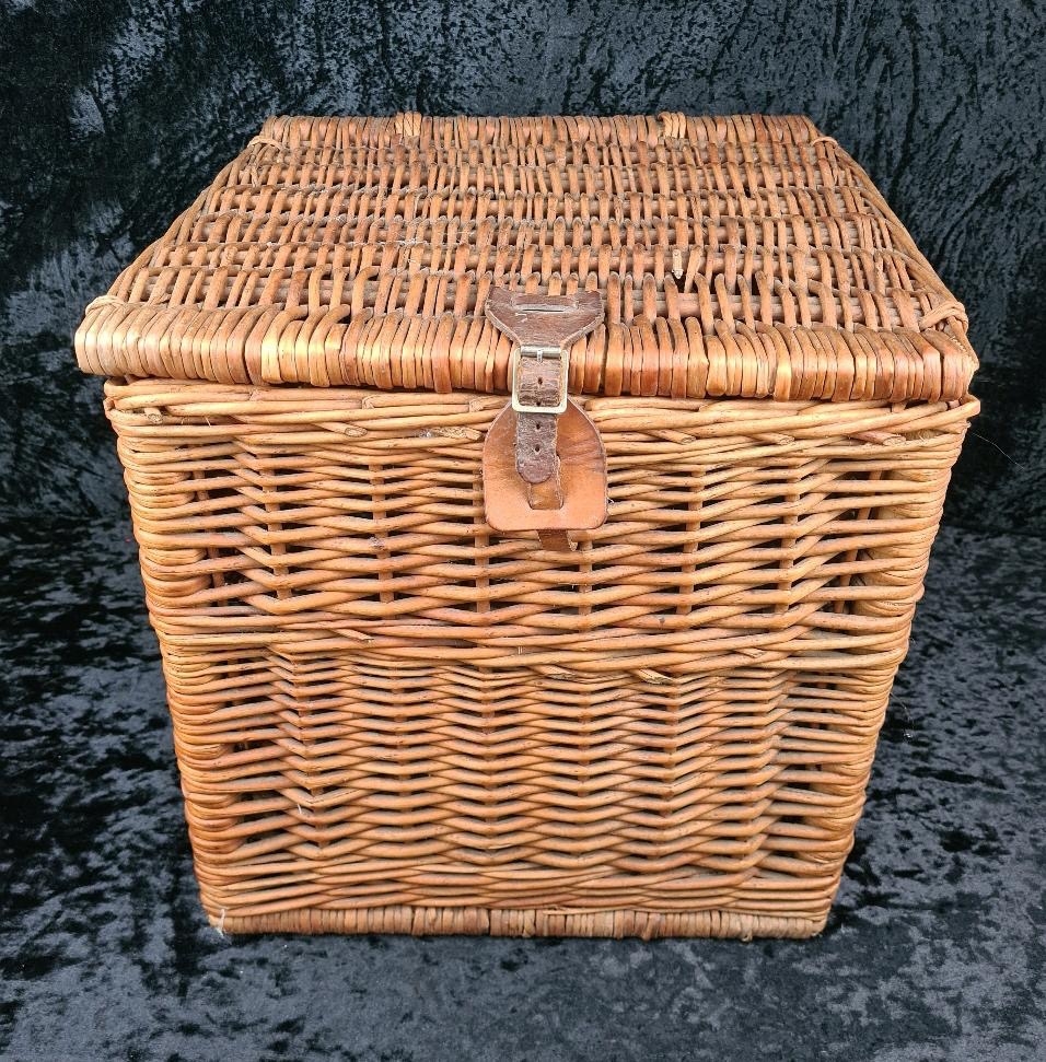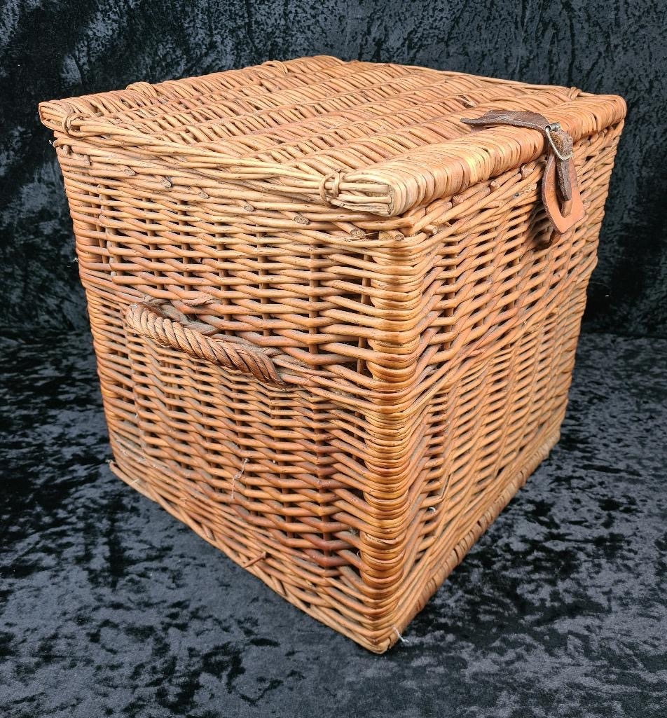 Square wicker storage basket with handles and leather fastening. Approx H39 x W37 x D37cm.