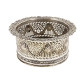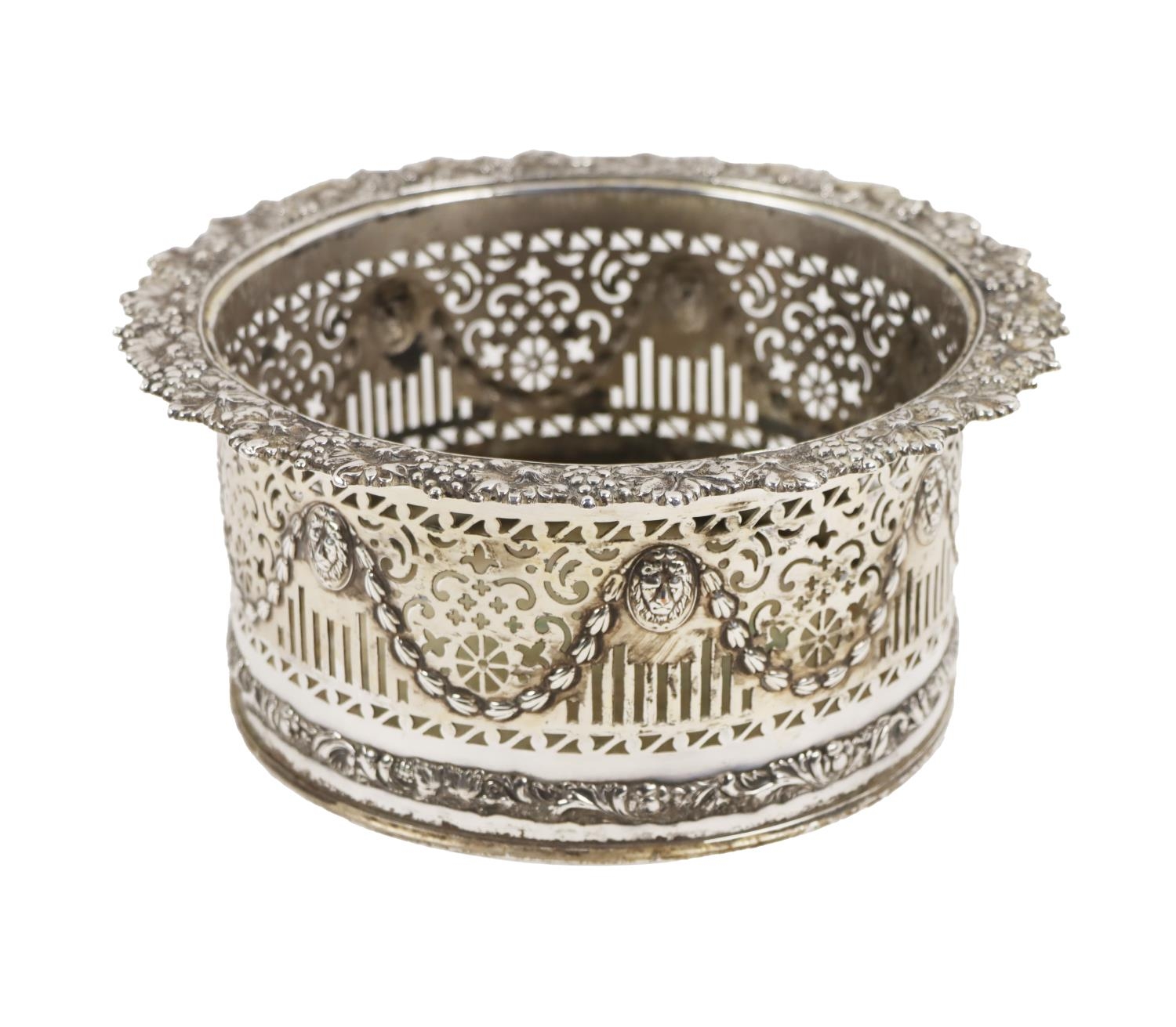 A large silver plated pierced and decorated Coaster or Flower Holder, designed with vine leaf and grape border rim, and lion face pattern, approx. 26cms diameter, 12cms high. (1)