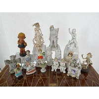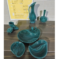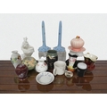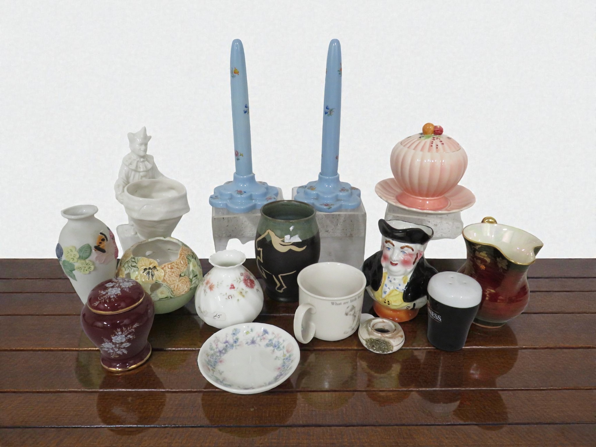 Mixed collection of pottery including Brentleigh, Wedgwood, Crown Devon, and others. Varied lot comprising pair of blue spatter-glazed candlesticks with gilt floral decoration (approximately 8 inches tall), pink ribbed preserve pot with lid and matching underplate, Toby jug character mug, assorted novelty pieces including monk or friar figures, Art Deco-style geometric vases in brown and cream glazes, small decorative jugs and vases with transfer-printed and hand-painted decoration, Crown Devon examples, miniature oil lamp, saucer with transfer-printed floral border, plus additional mixed pottery. Eclectic group from various 20th century makers showing range of decorative styles. General household and collectables lot.