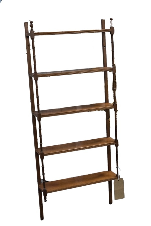 MAHOGANY FIVE TIER OPEN WALL SHELVES, with reeded fronts and slender turned front supports, 41” (104.1cm) high, 17” x 4 ½” (43.1cm x 11.4cm)