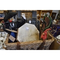 Large wicker basket containing fire guard, decorative carved wood and painted rooster, musical instrument etc.