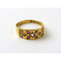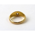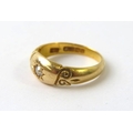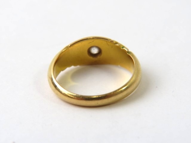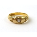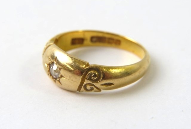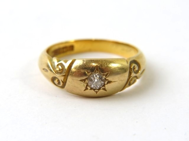 An antique 18ct yellow gold and diamond gypsy set ring with an old cut diamond estimated 0.12cts and scroll engraved shoulders, hallmarked for 1900, 5.3g approx ring size M 1/2.