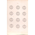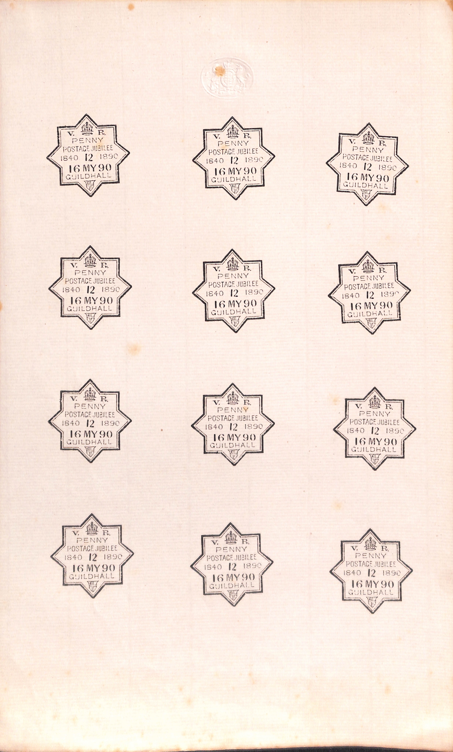 1890 Penny Postage Jubilee. Sheet of paper with royal arms embossed at top bearing twelve proof impressions of the Guildhall star cancel dated 16 MY 90 with code "12", all in black, fine and unusual.