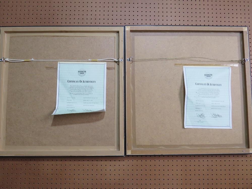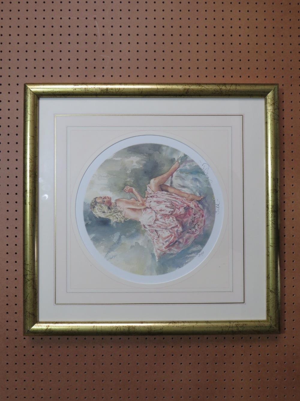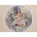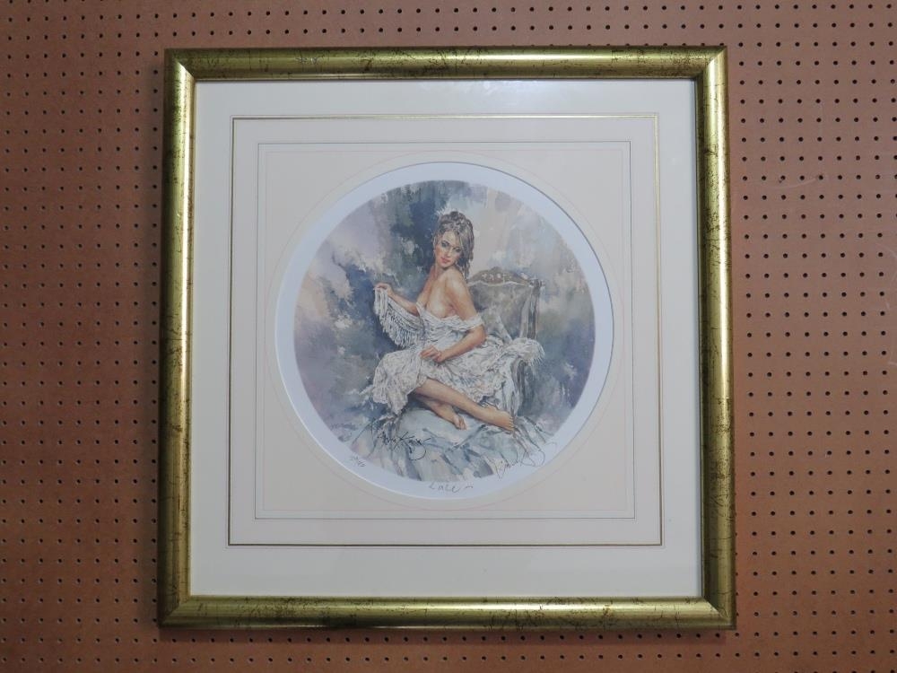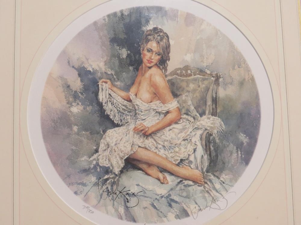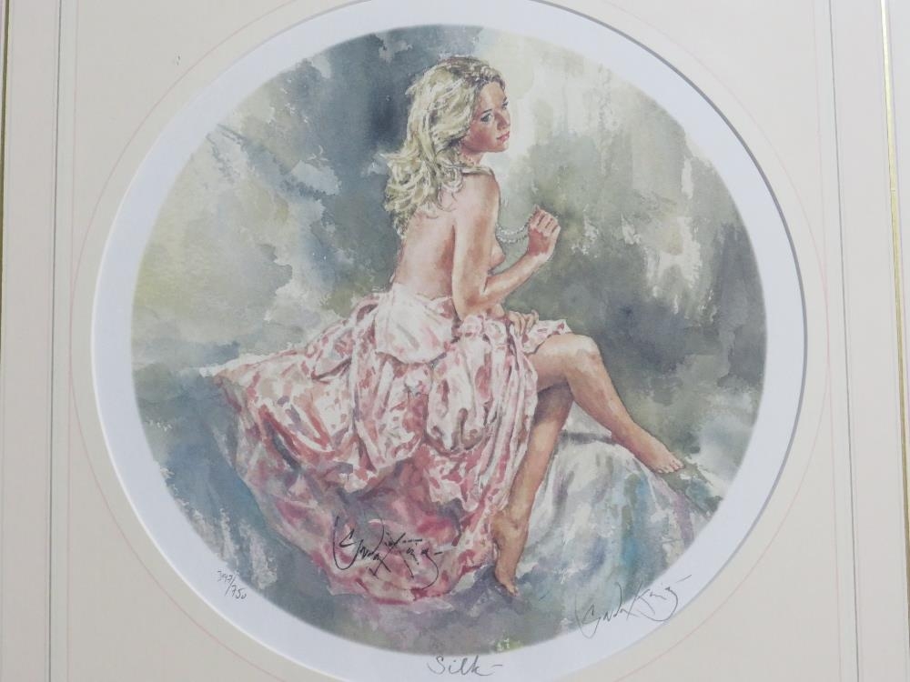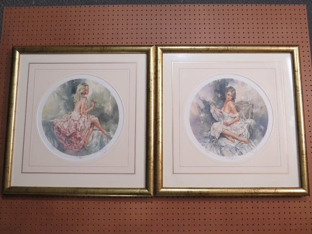 GORDON KING (b.1939). A pair of circular semi-nude female studies 'Silk & Lace', signed in pencil lower right, coloured limited edition prints on paper, with guild stamps and certificates of authenticity, 397 / 750, framed and glazed, Dia. 29 cm (2)