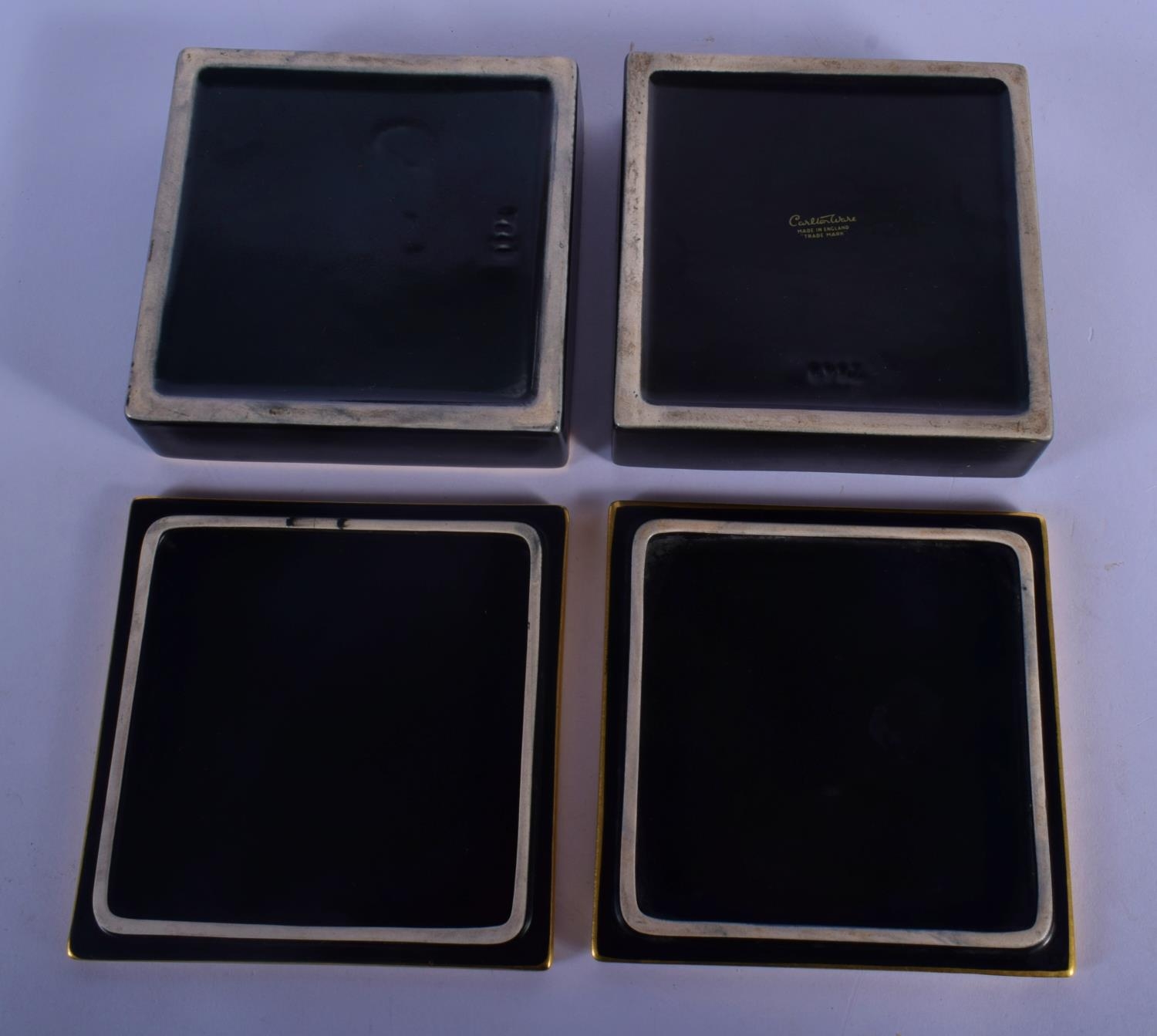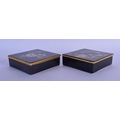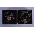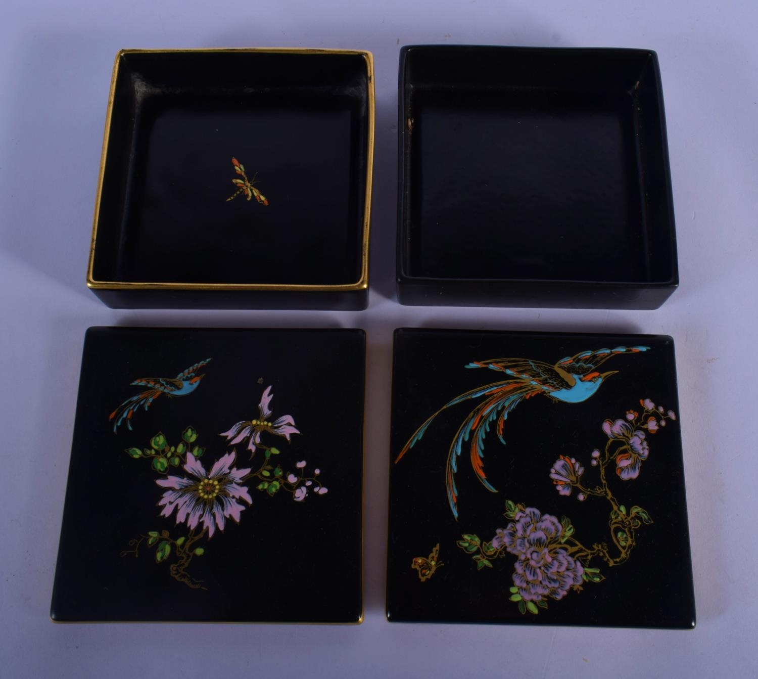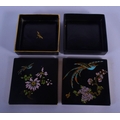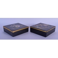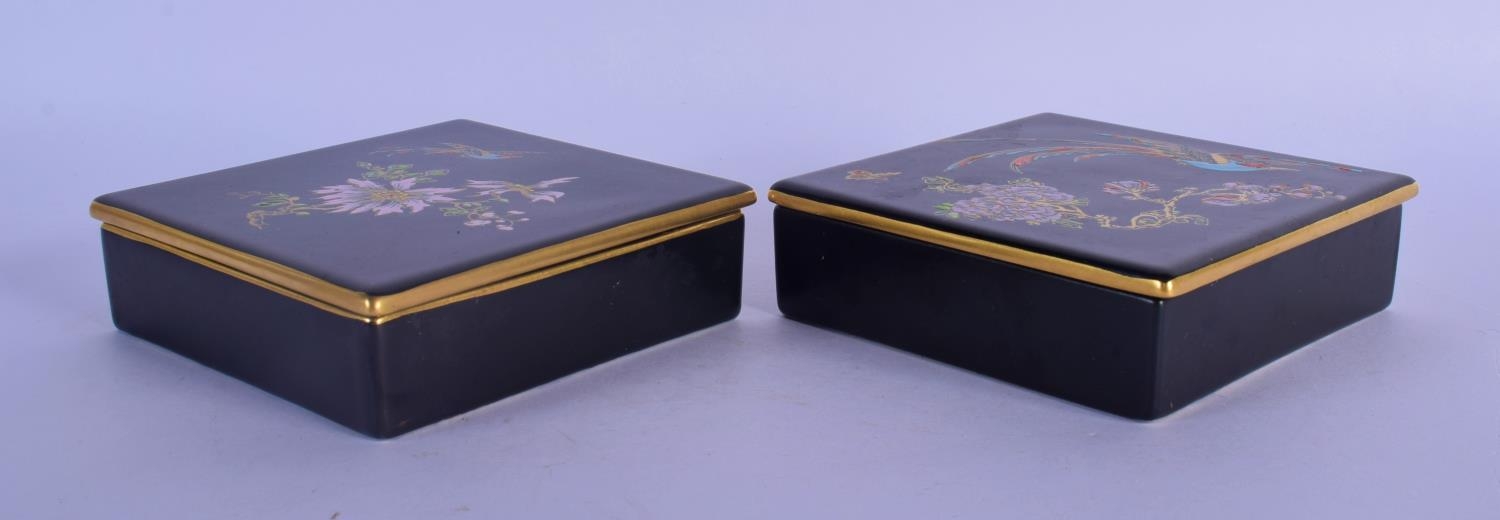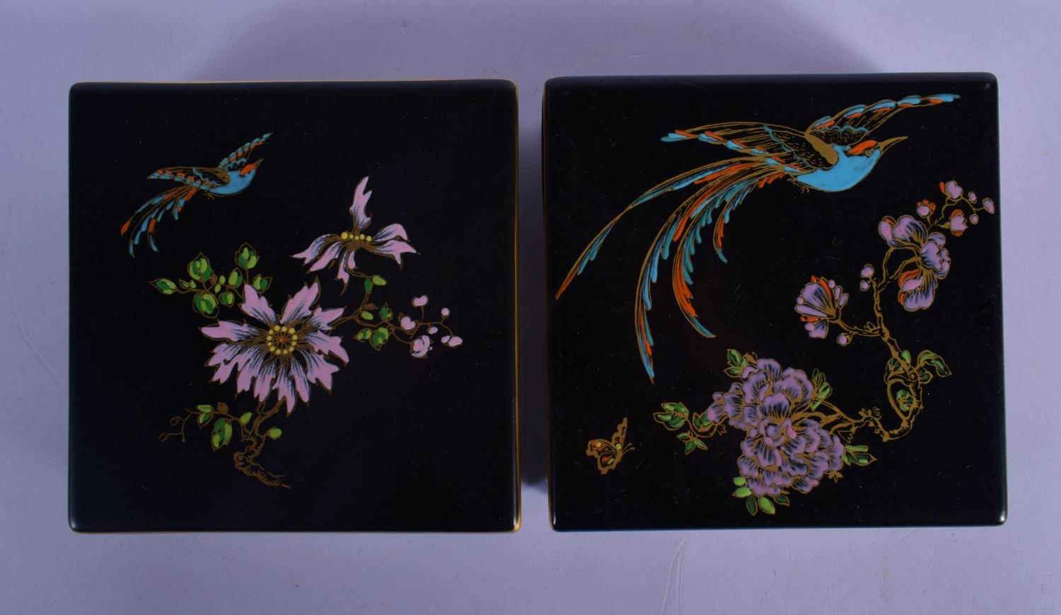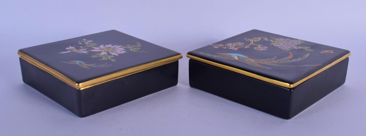 A PAIR OF CARLTONWARE BLACK GROUND PORCELAIN BOXES AND COVERS painted with birds and flowers. 11.5 cm square.