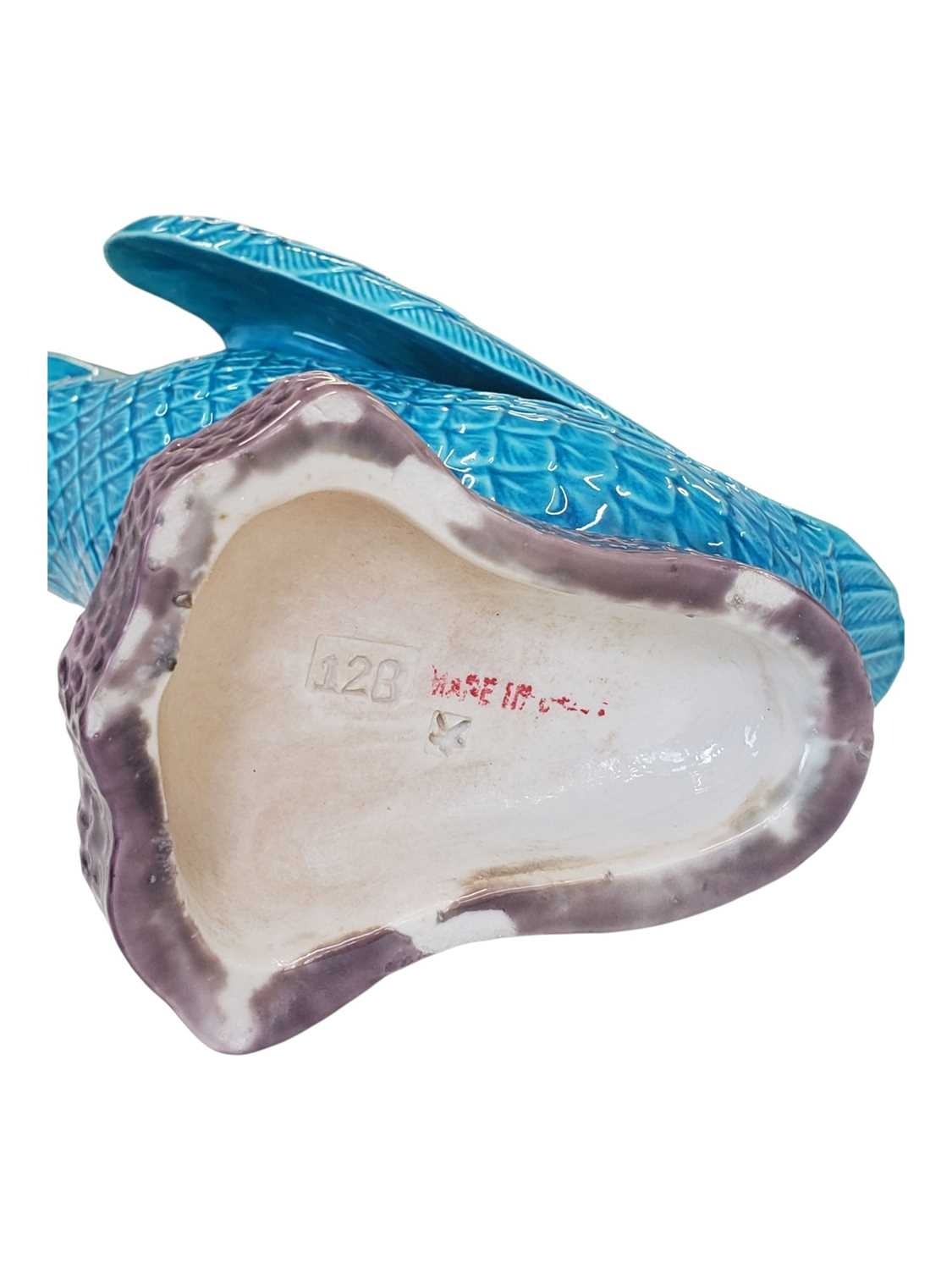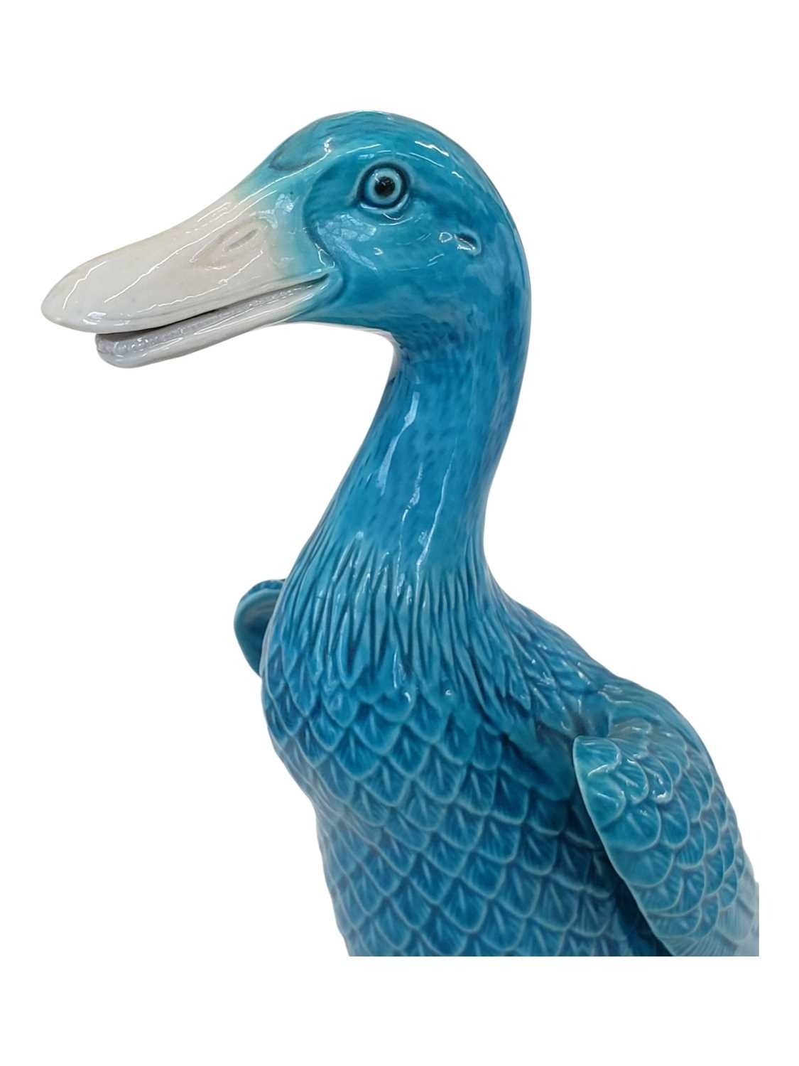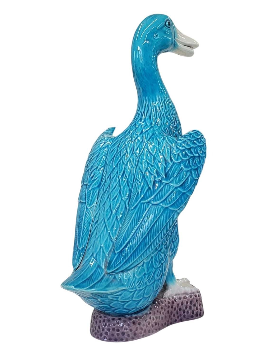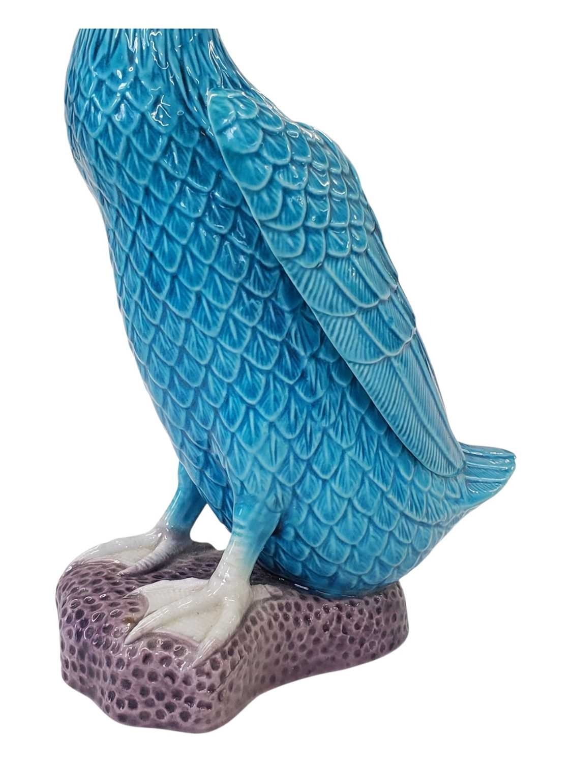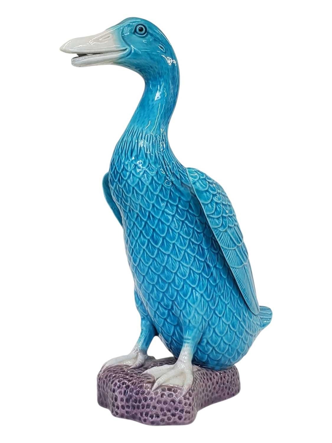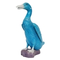 Early 20th century Chinese porcelain duck figurine. Having fish scale style feathers blue colourway with webbed feet. Standing on a purple base with maker's mark to underisde. Herend manner.