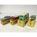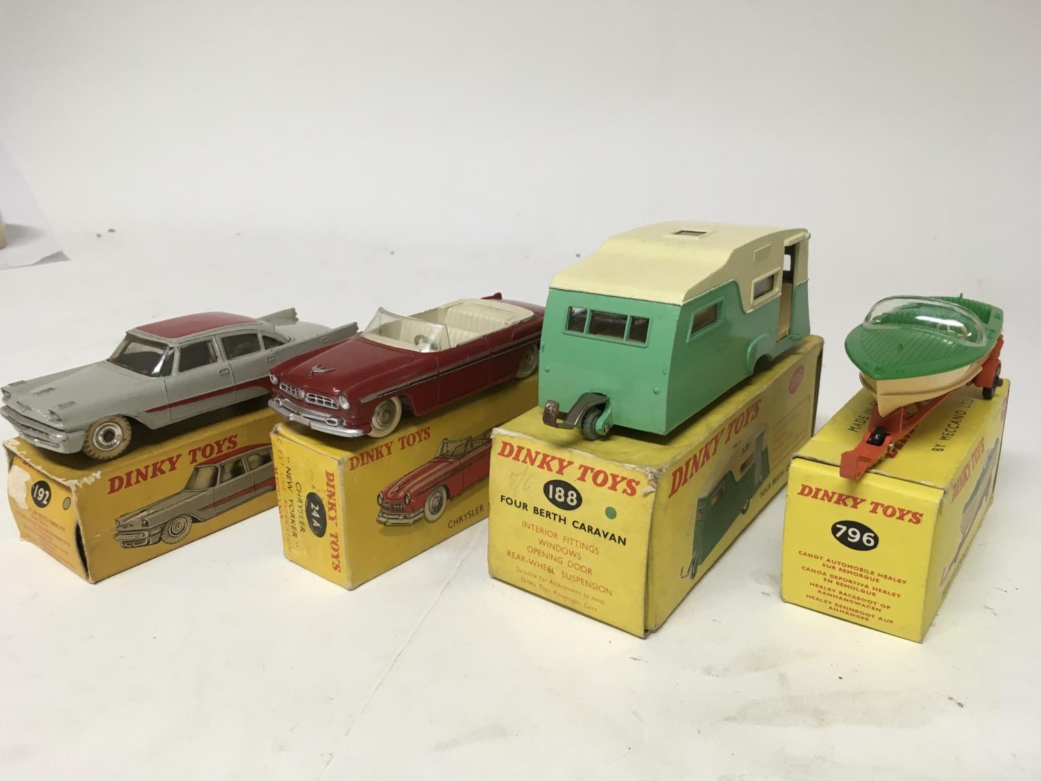 Dinky toys, #192 De Soto Fireflite sedan, #24A Chrysler New Yorker, #188 Four berth caravan and #796 Healey sports boat on trailer, boxed