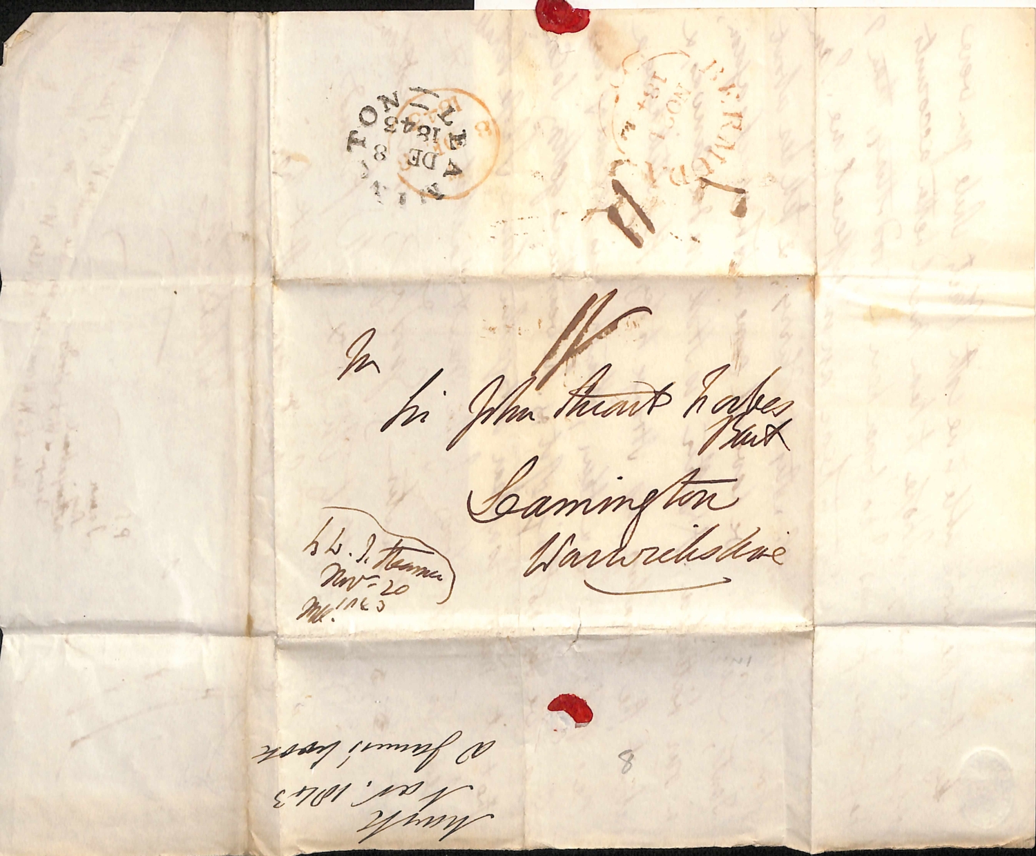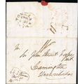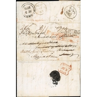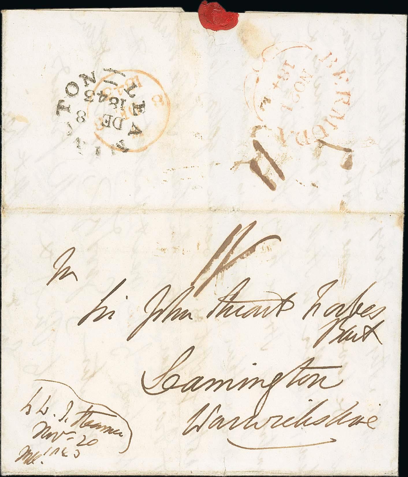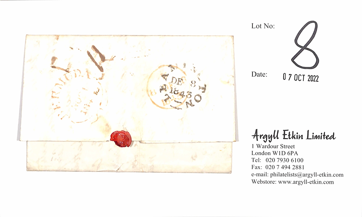1843 (Nov 21) Entire letter (first page missing) to England charged 1/-, backstamped with the large "BERMUDA" fleuron in red, unusually fine, uncommon in red. Photo on Page 6.