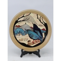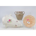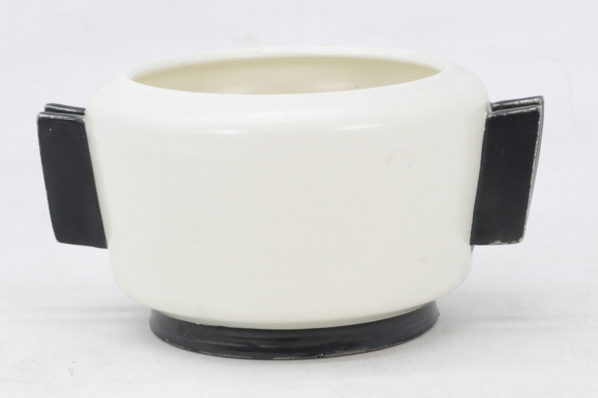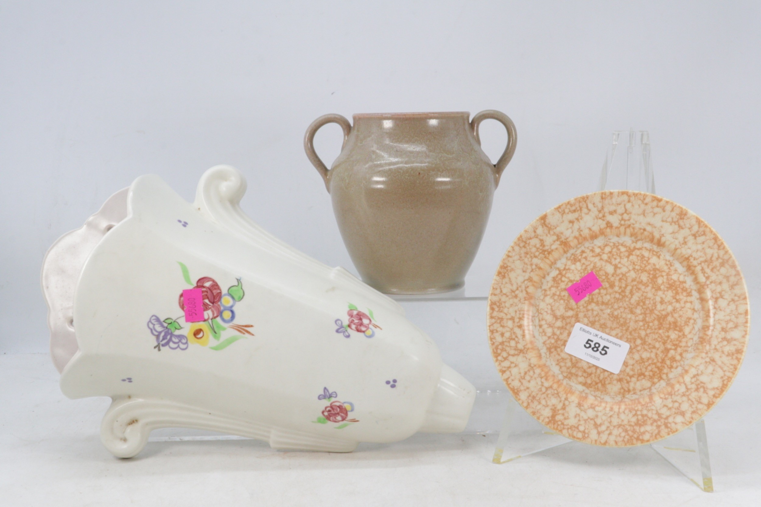 Poole Pottery Art Deco plane wear (approx. 9cm tall, 17cm diameter including handles) together with Poole Pottery 1930s Sylvan plate supplied to Heals of London two glaze trial numbers, together with a two handled sylvan vase and a floral wall pocket.