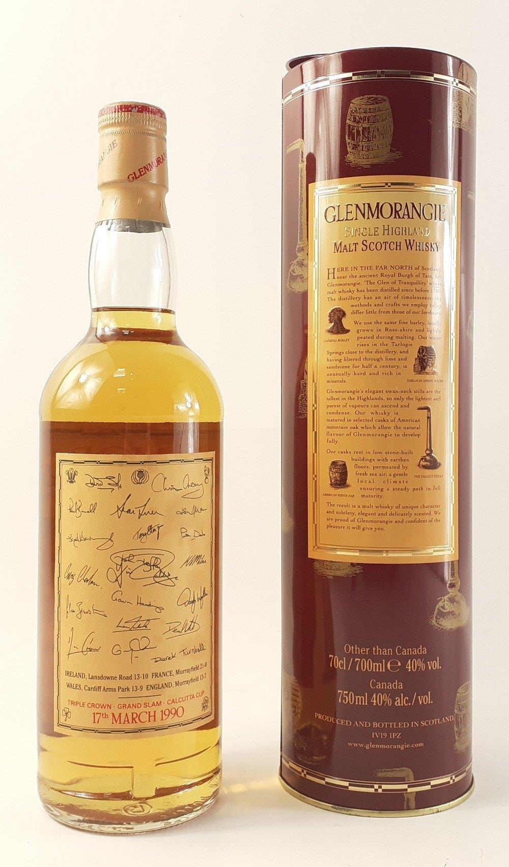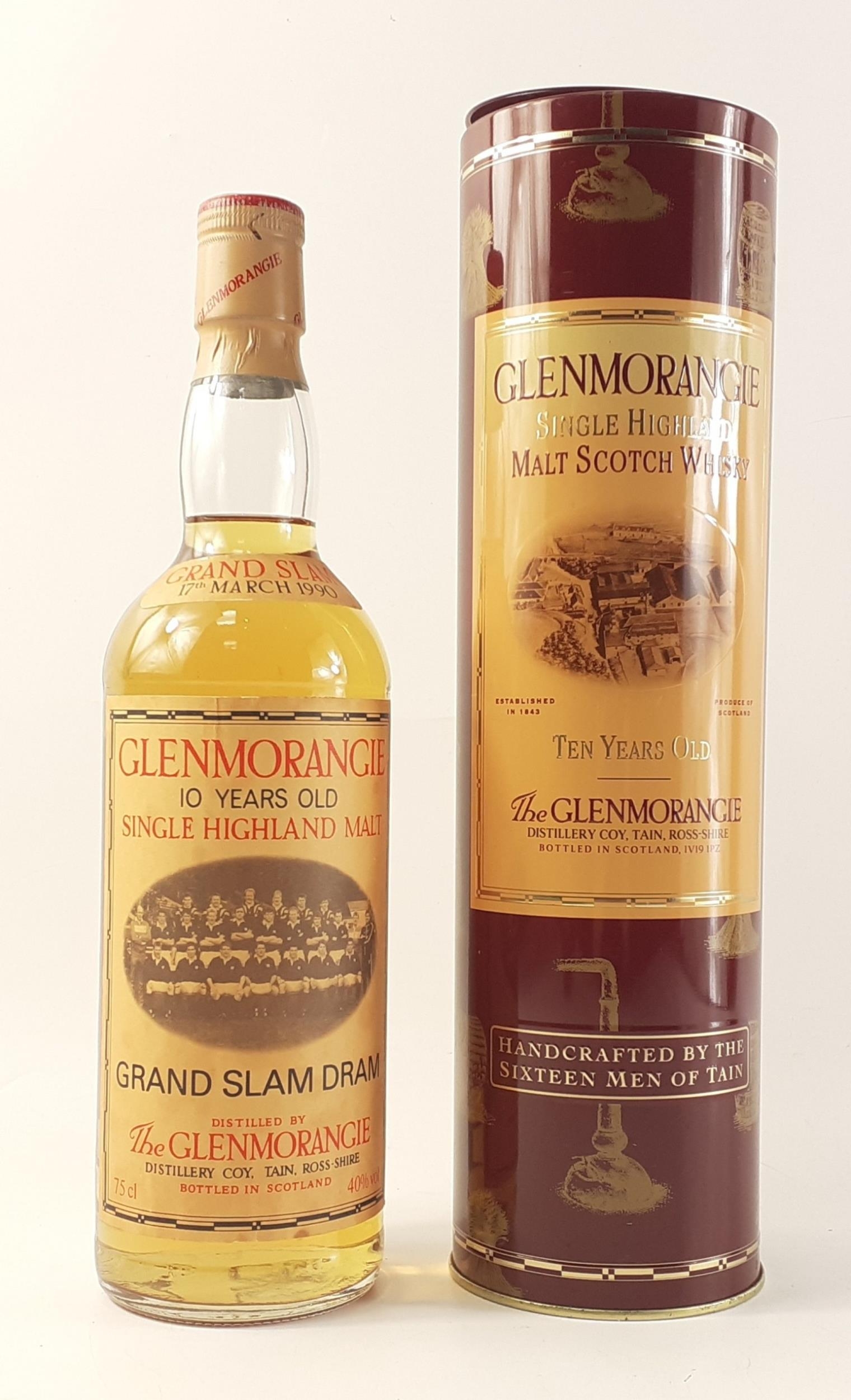 A 75cl bottle of GRAND SLAM DRAM (17th March 1990) GLENMORANGIE 10 year old Highland single malt in tin