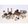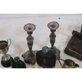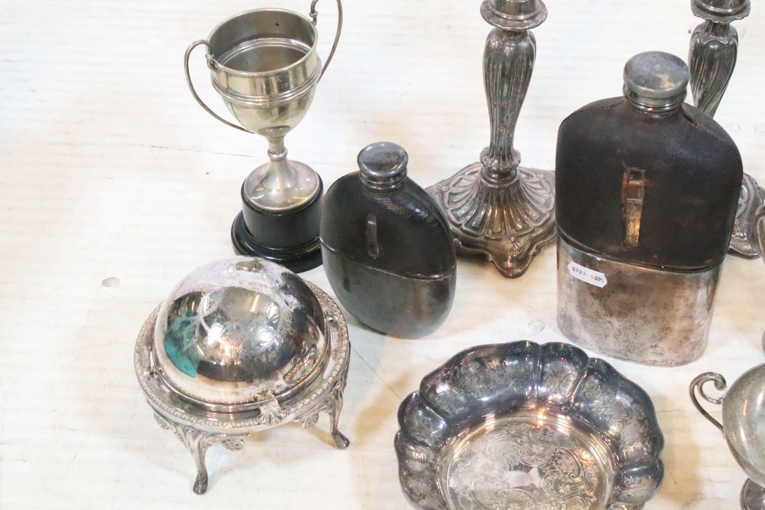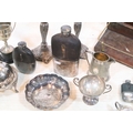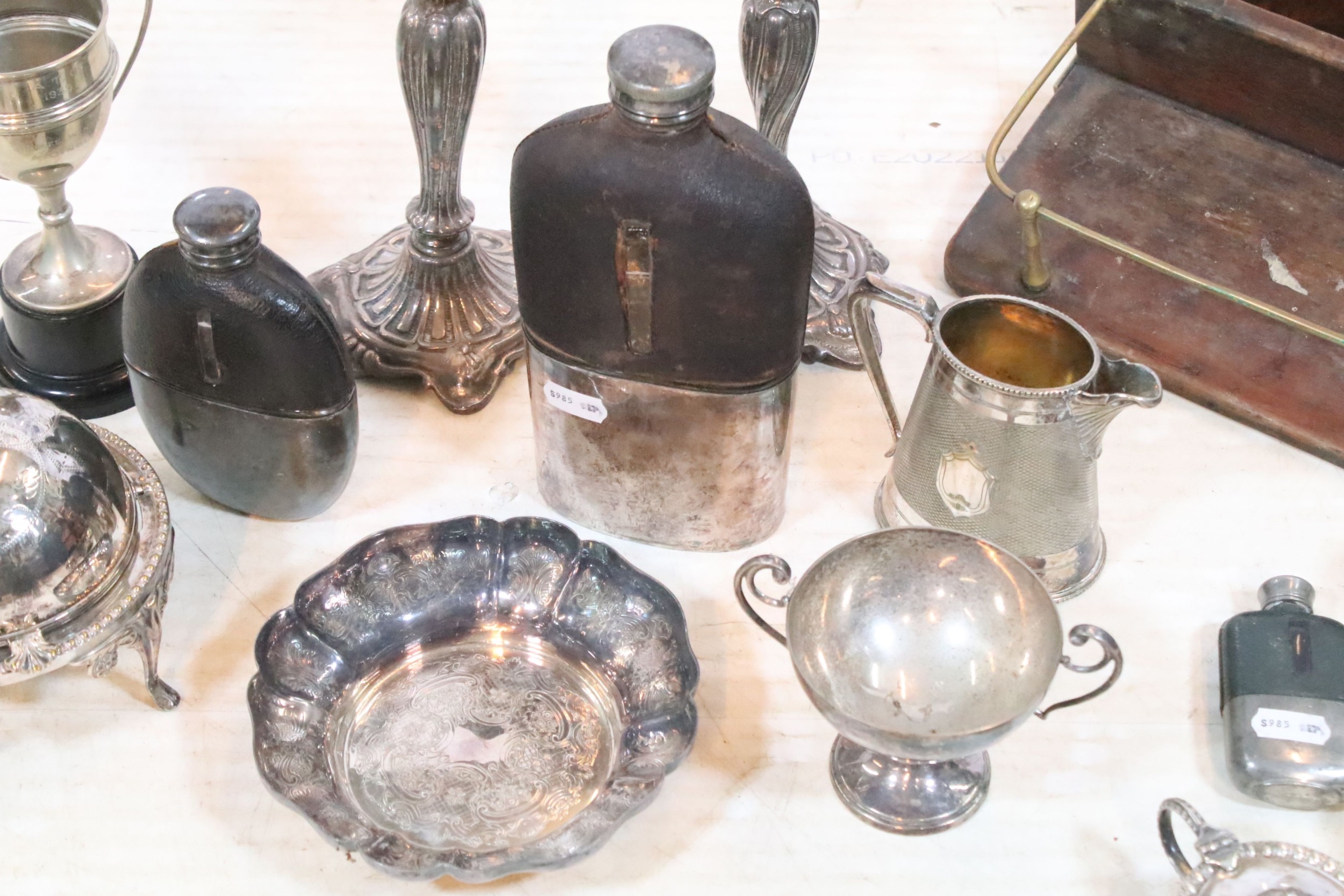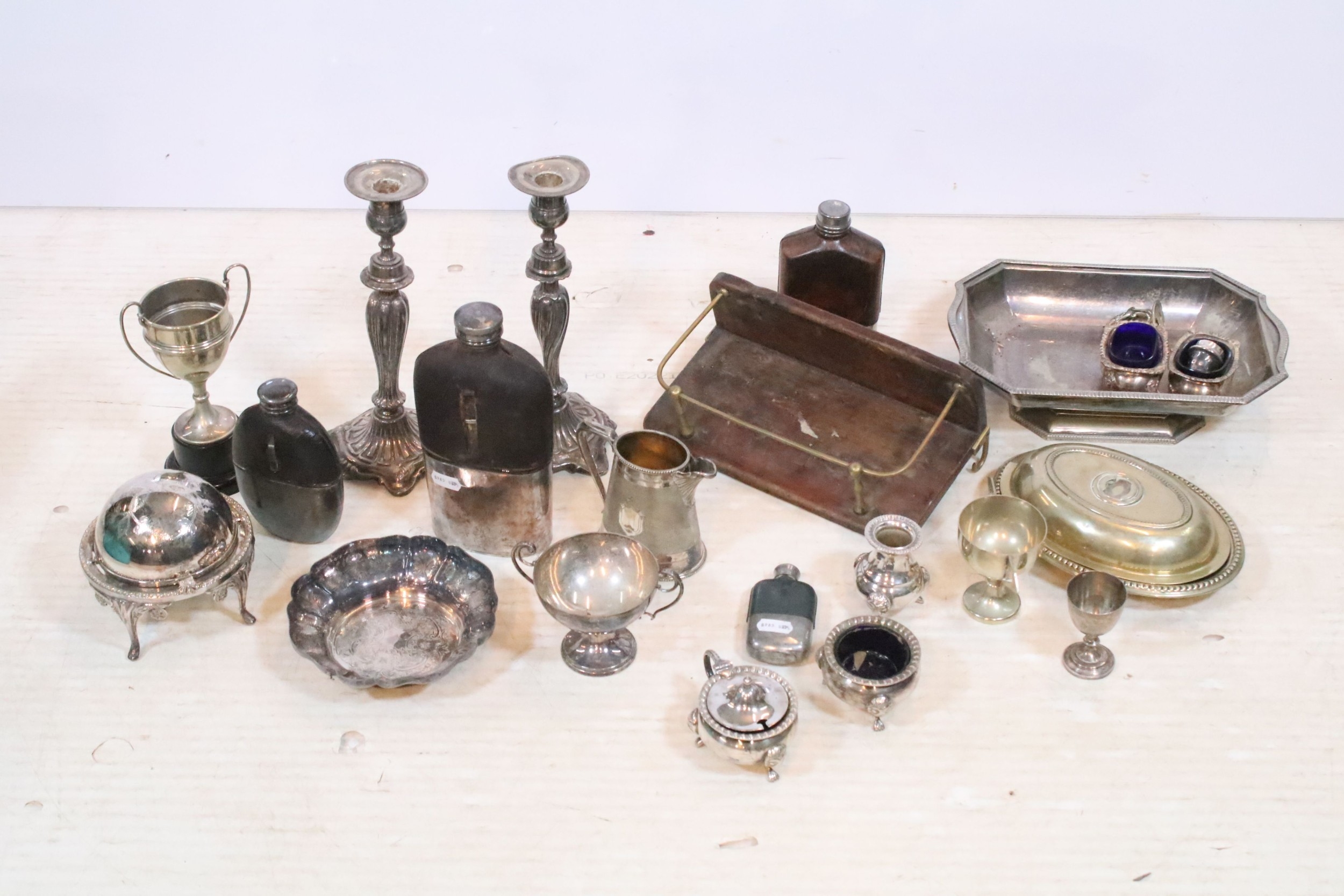Collection of silver plate, to comprise a pair of candlesticks, hip flasks, trophies, jugs, etc. together with a small brass and wooden desk stand (one box)