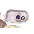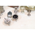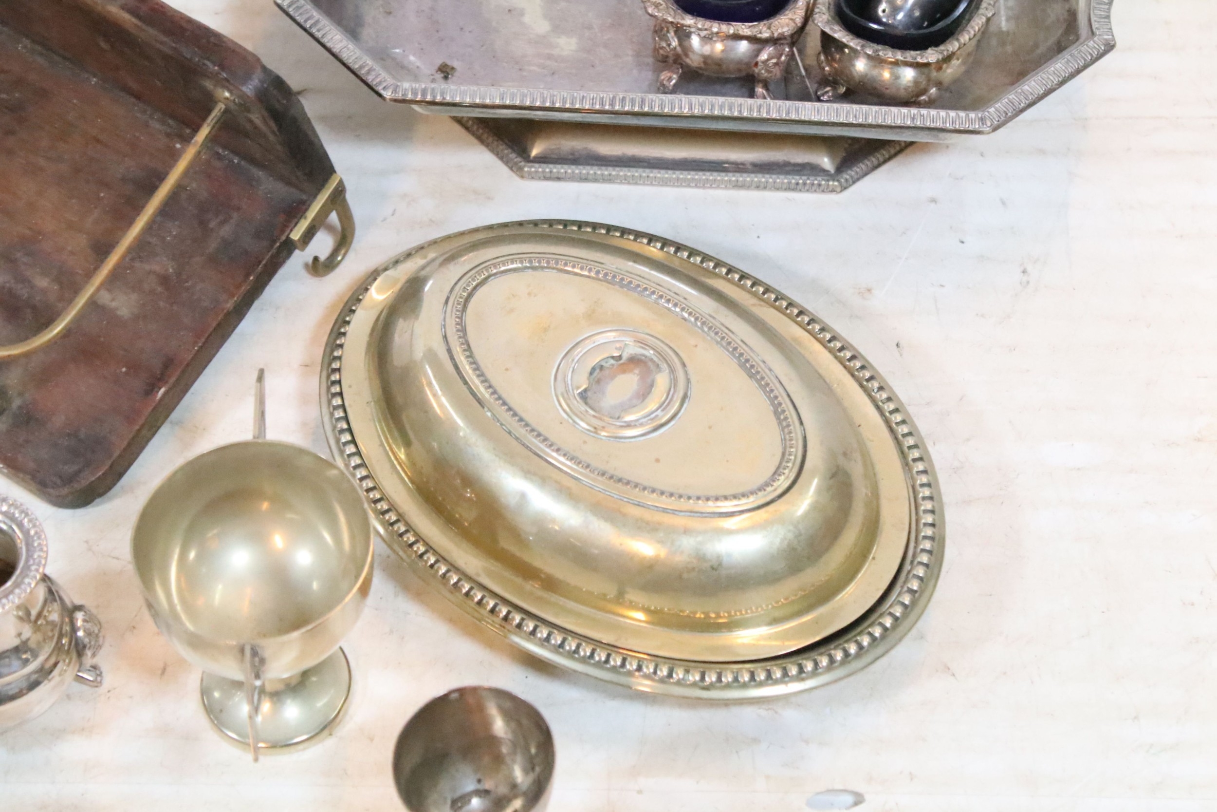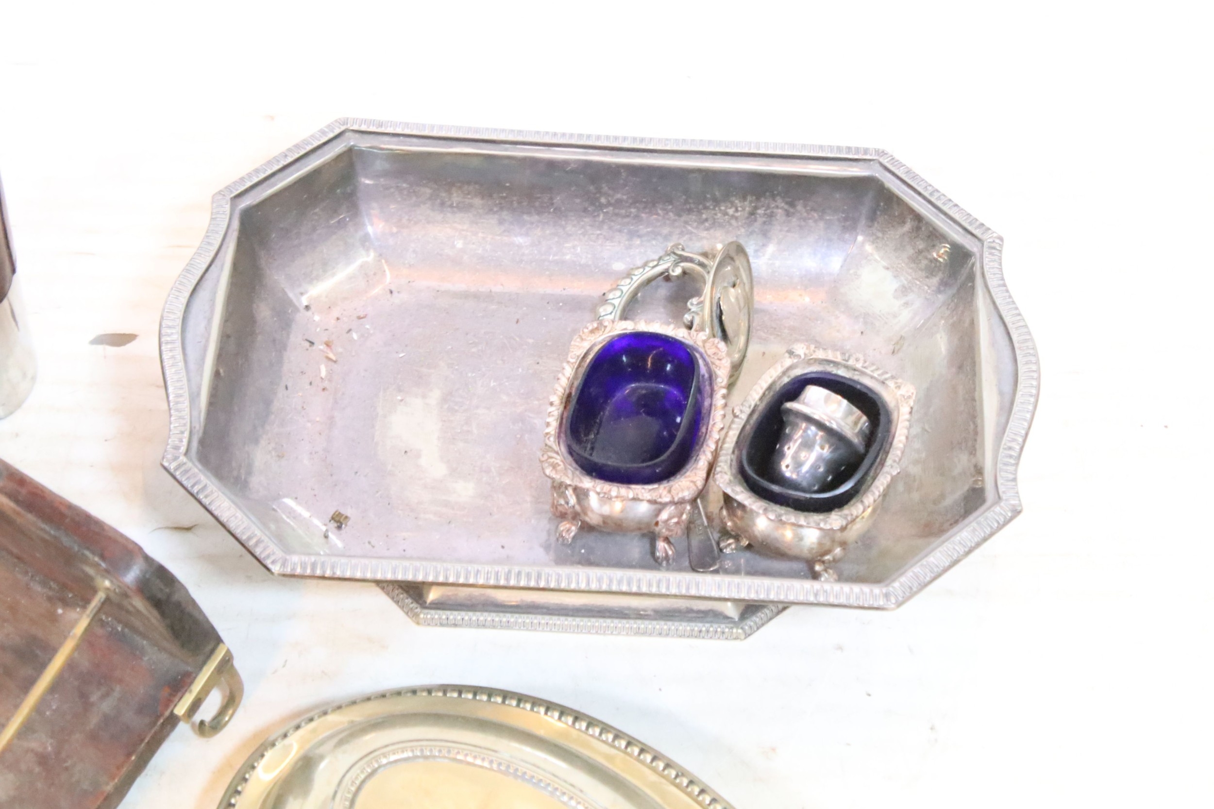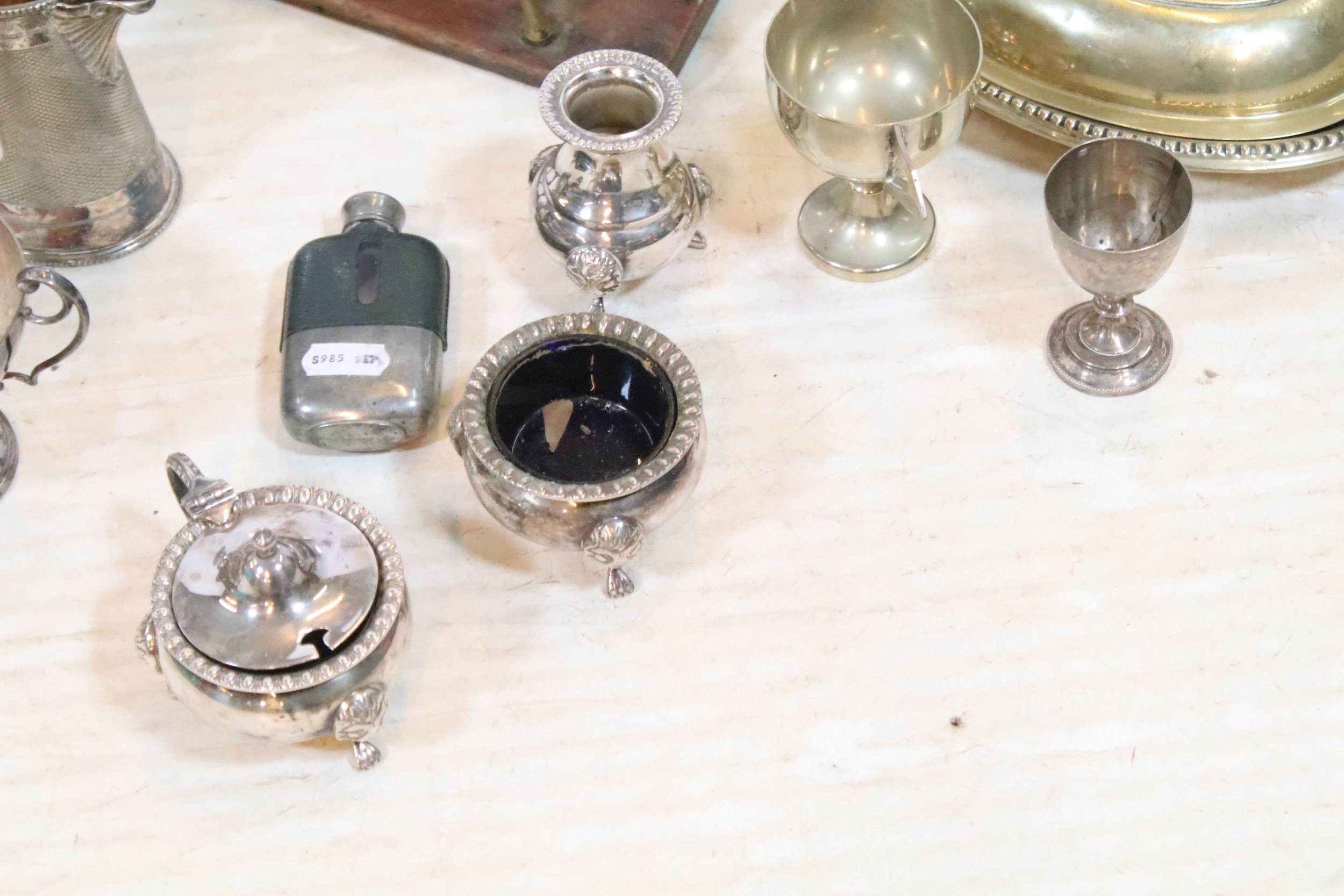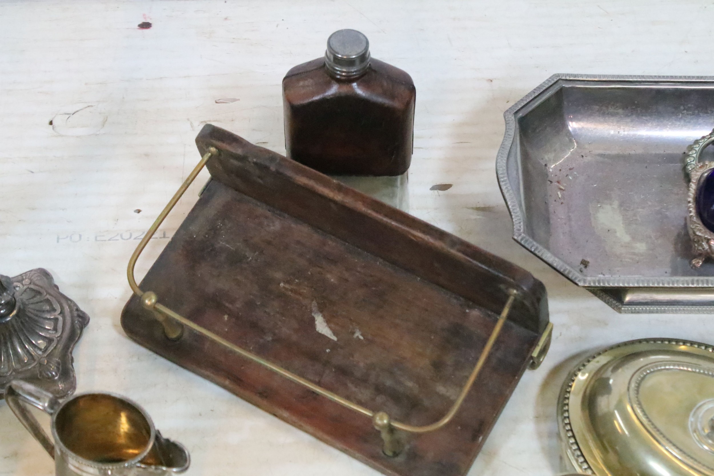 Collection of silver plate, to comprise a pair of candlesticks, hip flasks, trophies, jugs, etc. together with a small brass and wooden desk stand (one box)