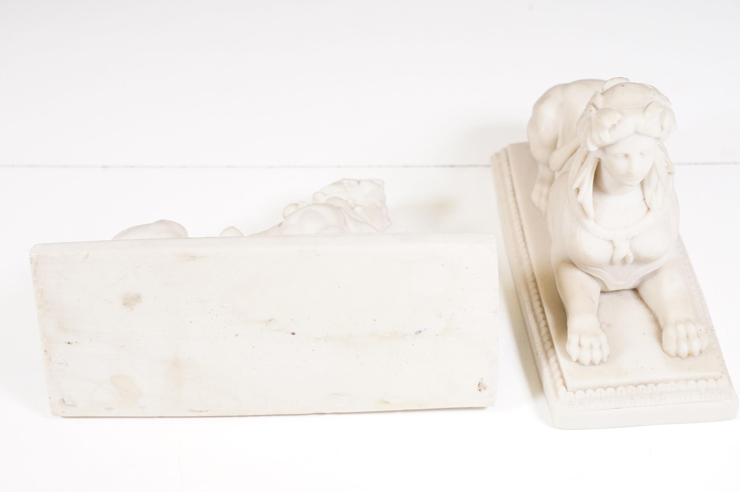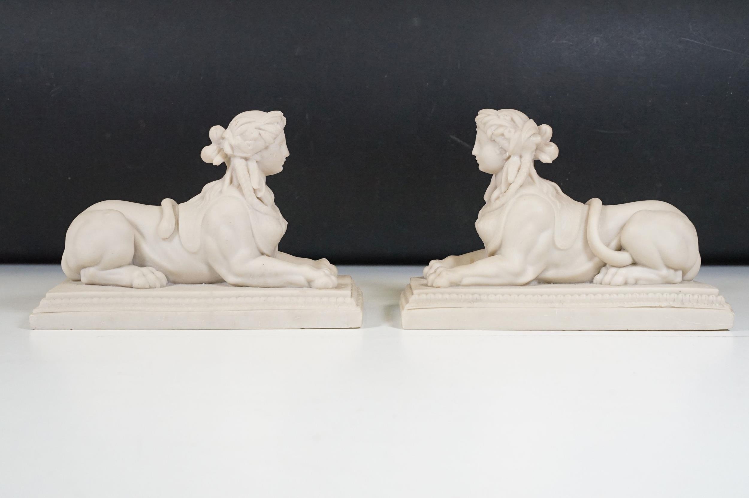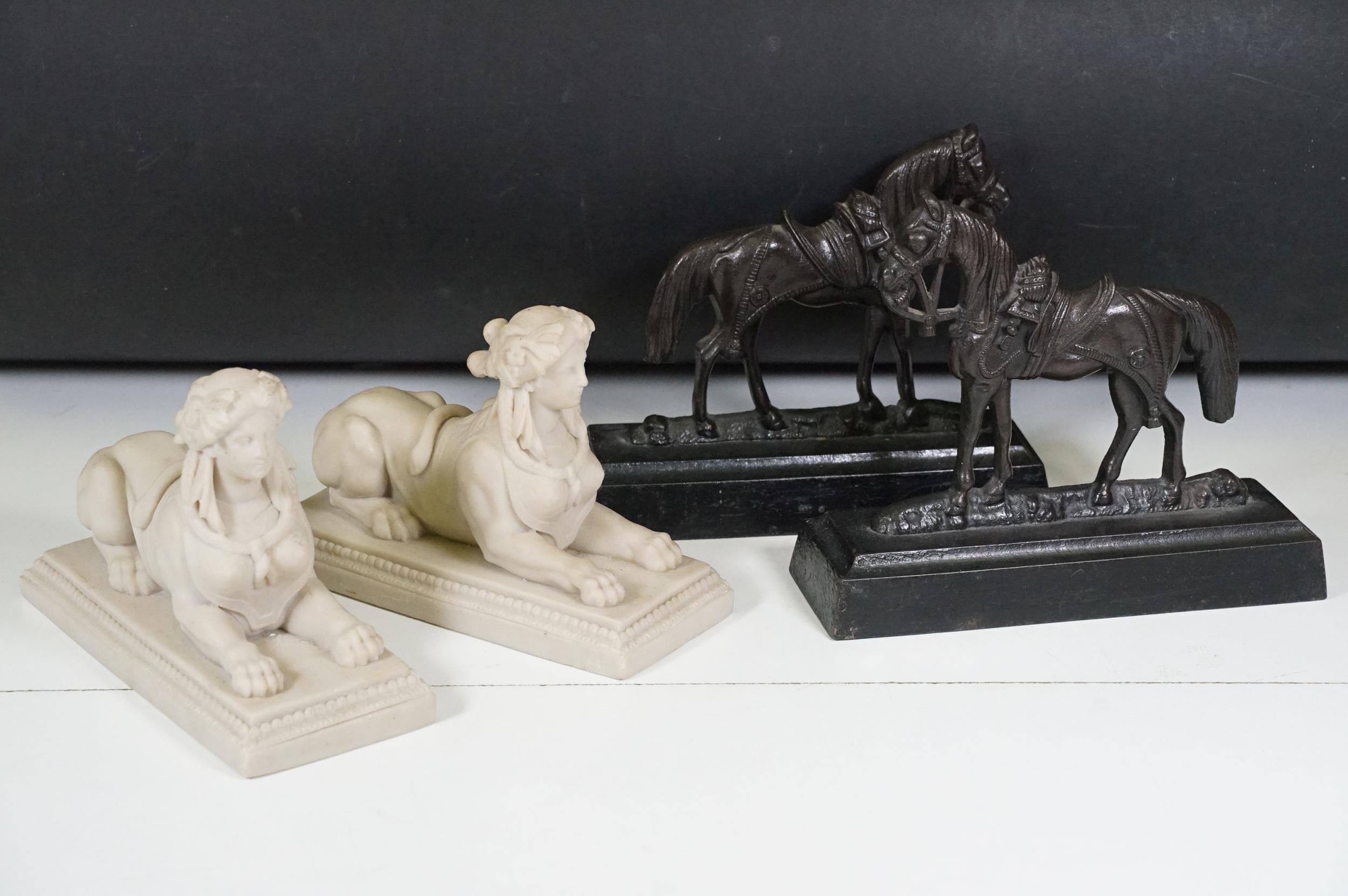 Two pairs of chimney ornaments to include pair of cast iron horse examples and pair of parian ware style sphinx with the head of a Roman / Greek woman and the body of a lion