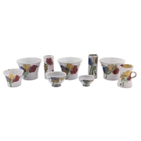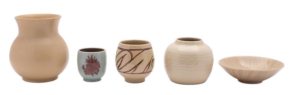 *Agnete Hoy for Buller Pottery four white stoneware vases and a dish, of various forms and decoration, incised and impressed marks to bases, tallest vase 15cm high. [5]