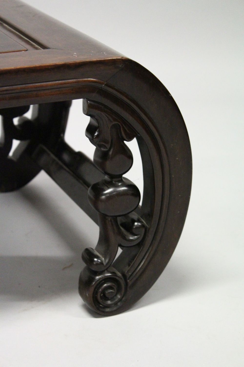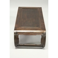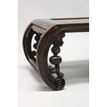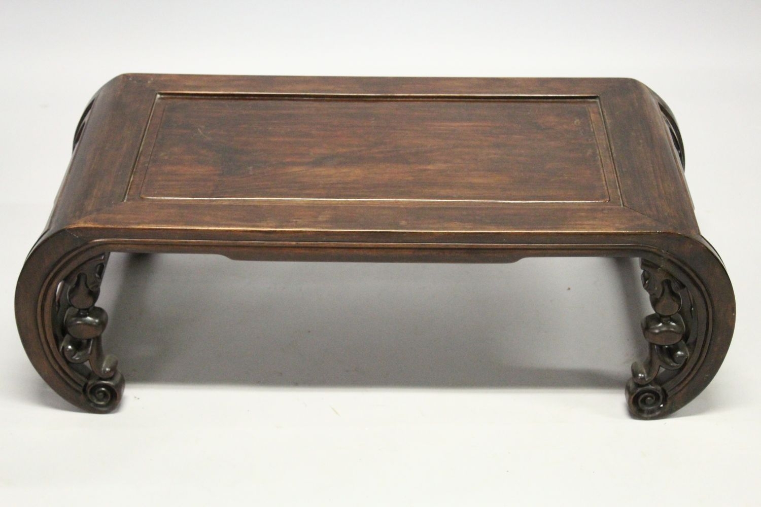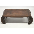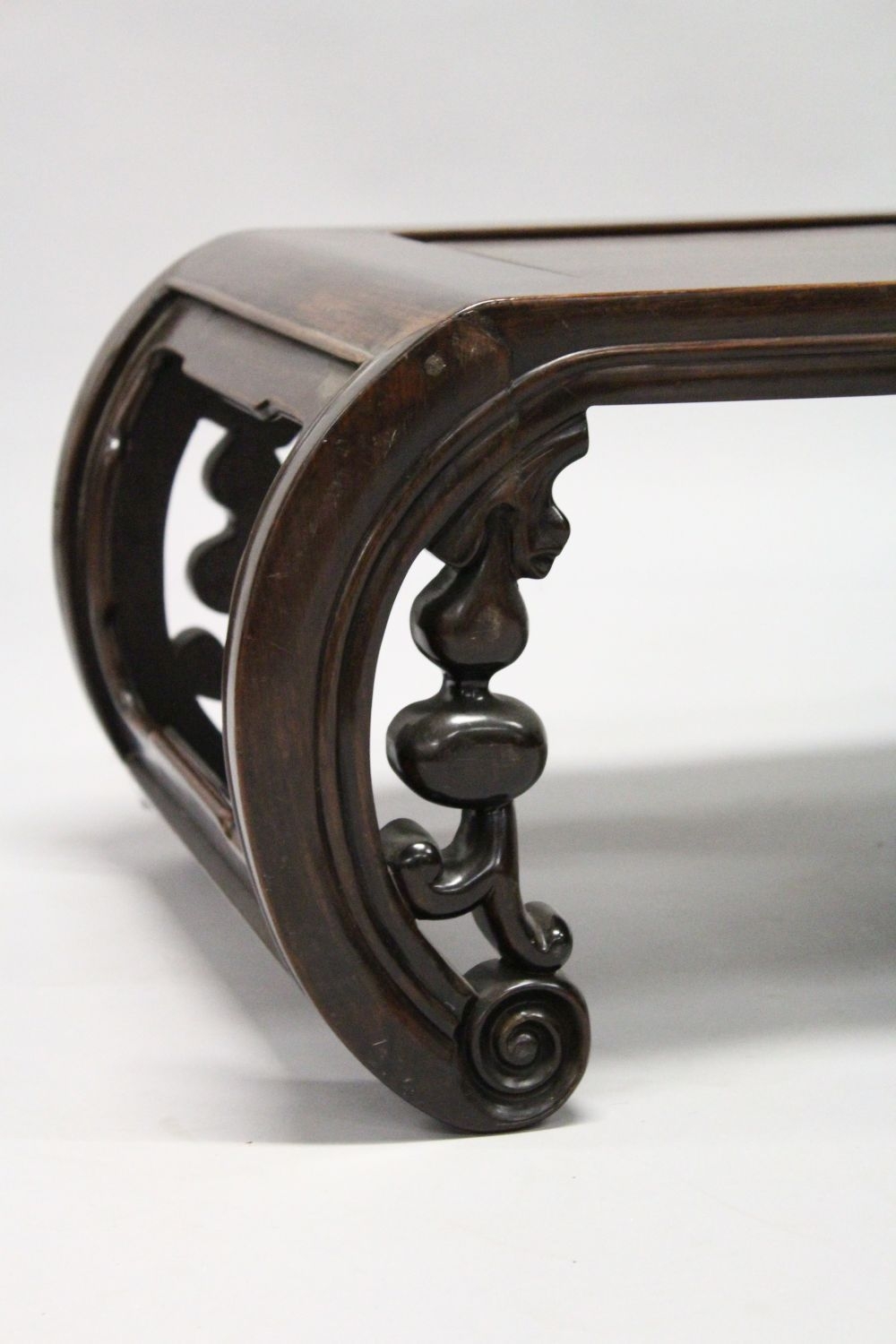 A CHINESE ROSEWOOD LOW TABLE WITH PANELLED TOP, supported on curving ends with pierced and carved brackets, overall length 100cm, 32cm high.