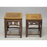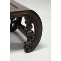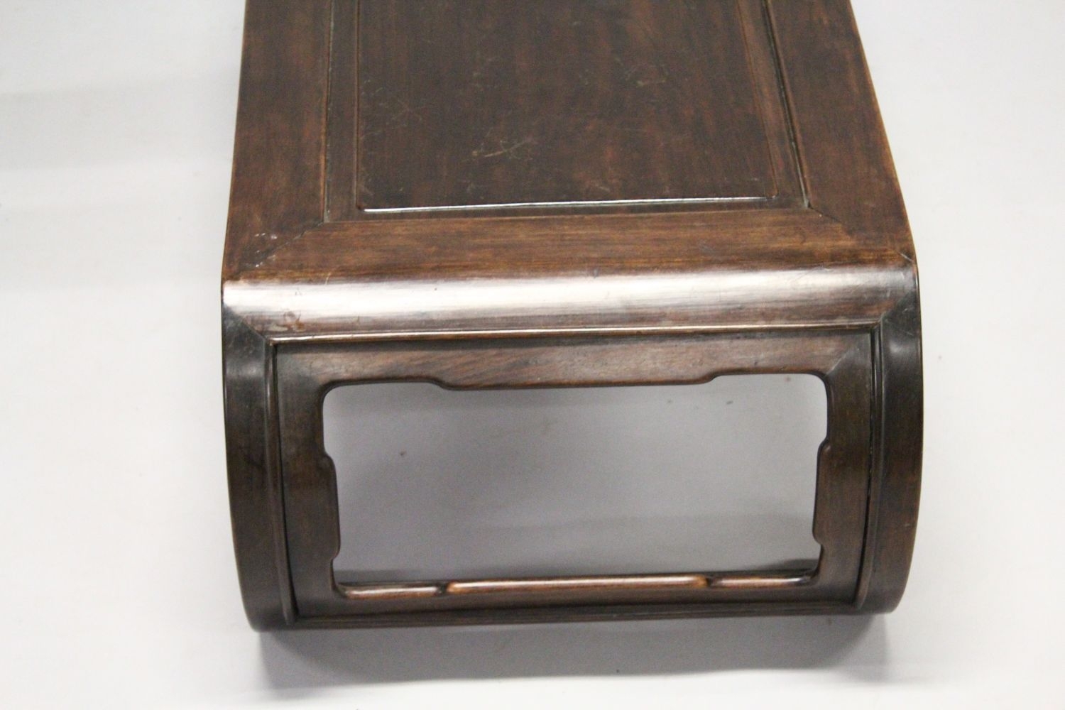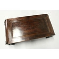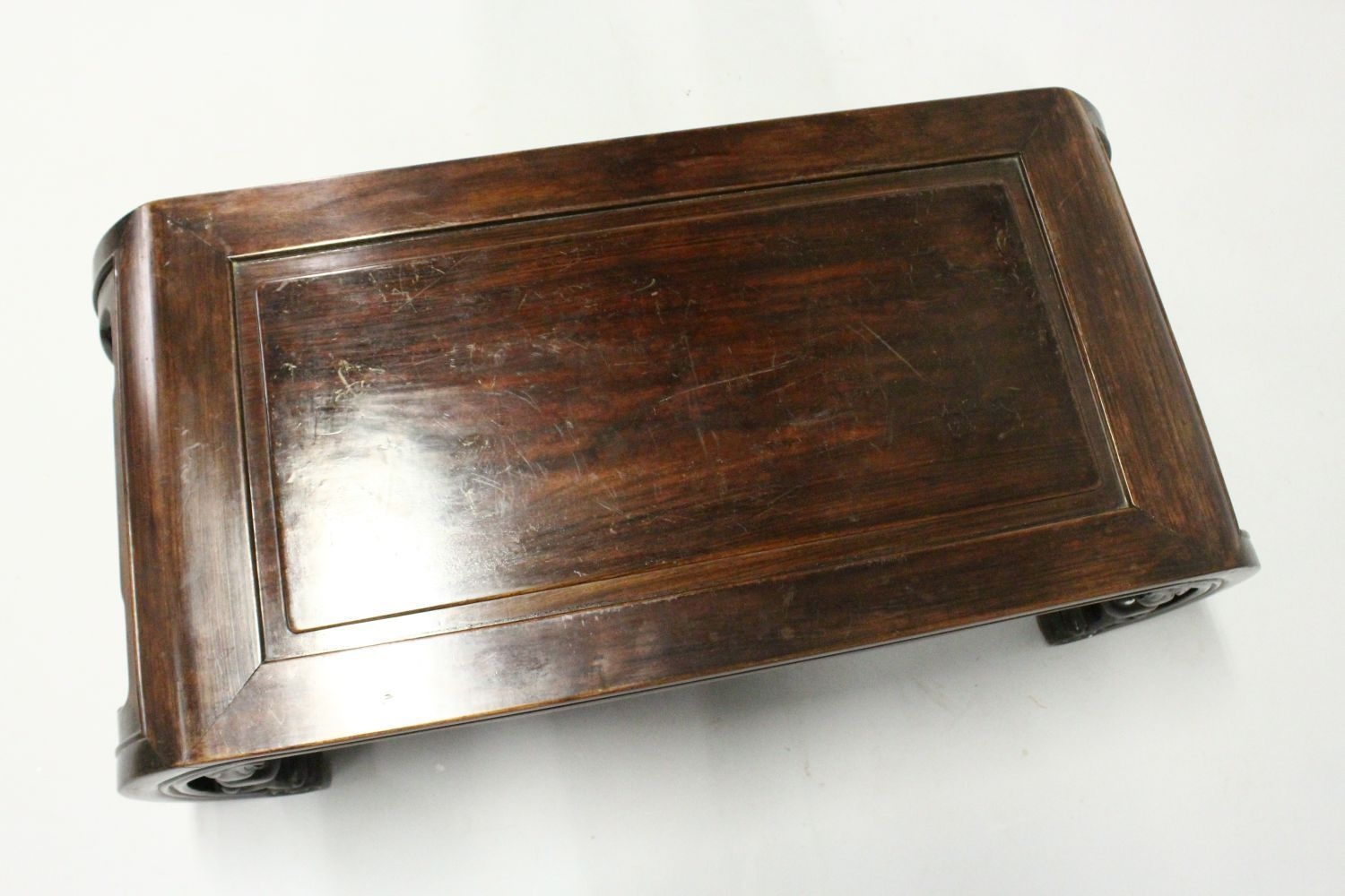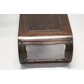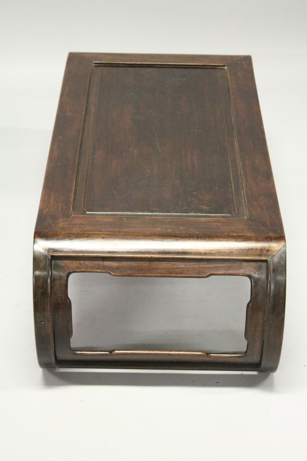 A CHINESE ROSEWOOD LOW TABLE WITH PANELLED TOP, supported on curving ends with pierced and carved brackets, overall length 100cm, 32cm high.