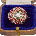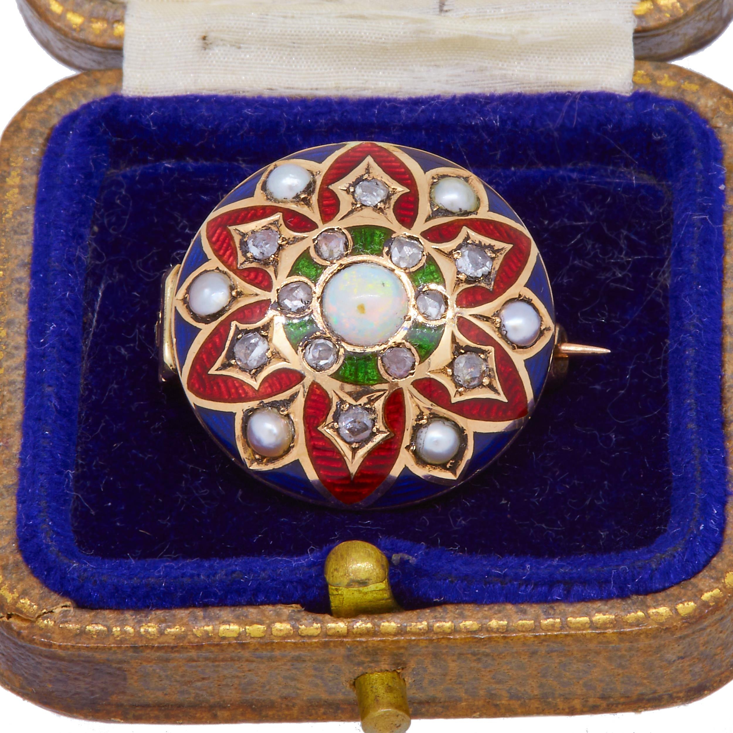 ANTIQUE ENAMEL, DIAMOND, PEARL AND OPAL BROOCH, of round design with floral motifs. Set with an opal to the centre, flanked with diamonds and pearls. Decorated with Green, red and blue enamel. Locket back. Diam. 2.1 cm. 7.1 grams.