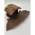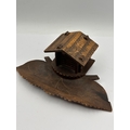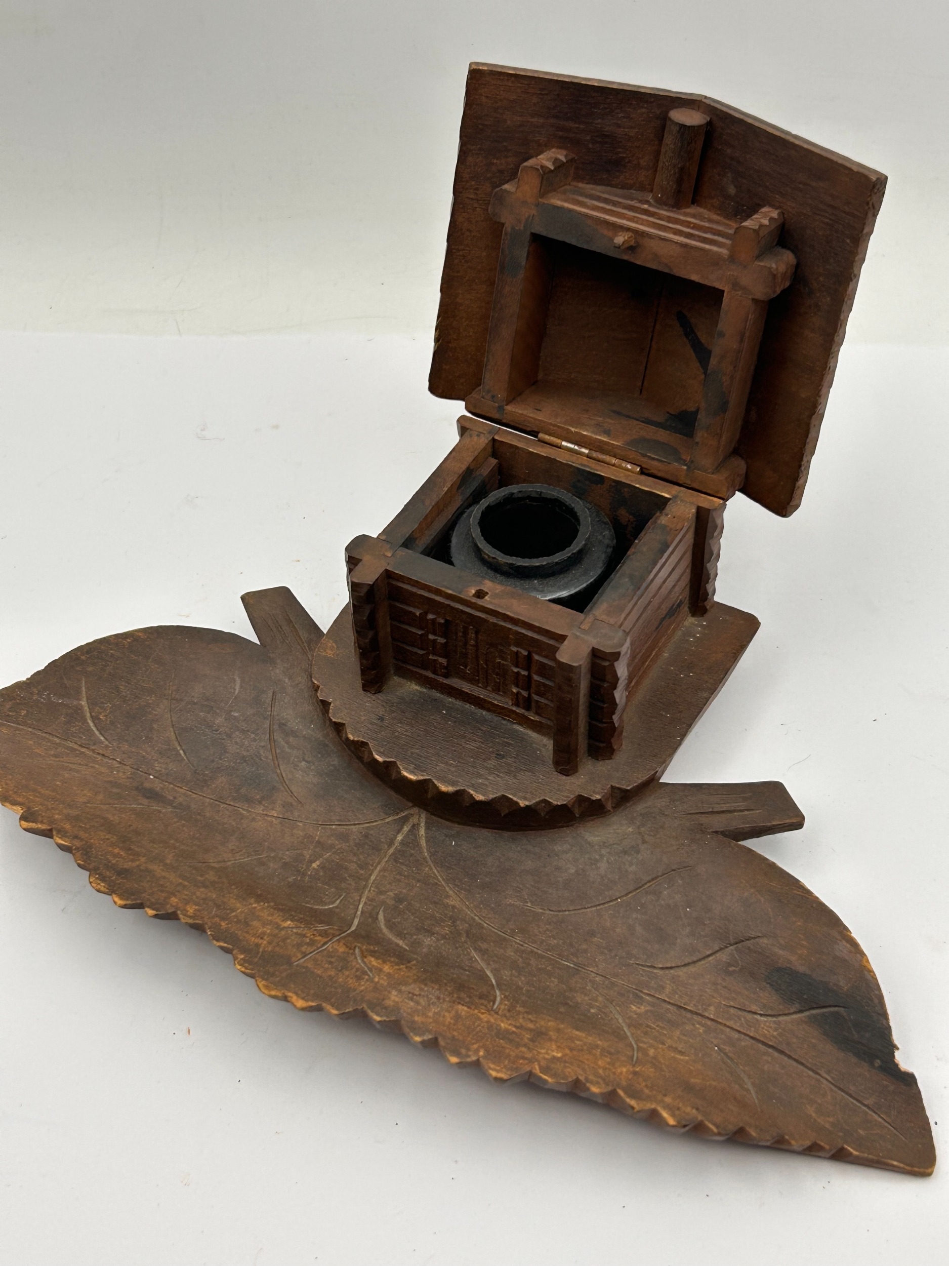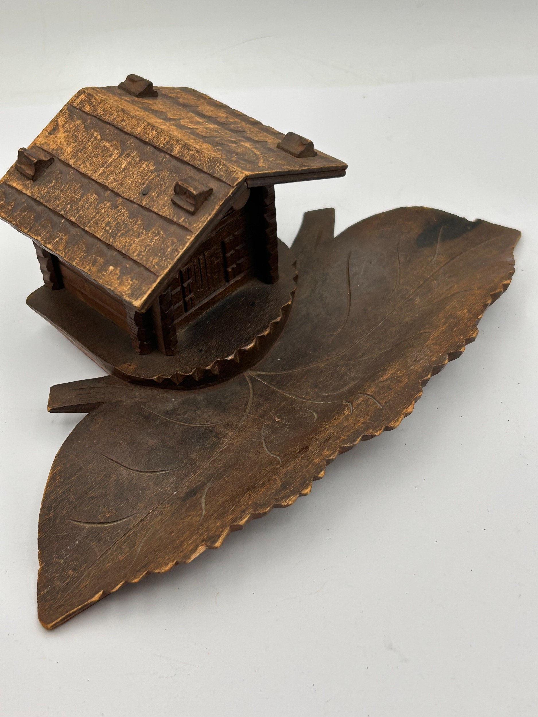 A carved wood novelty desk accessory, identified in the market as being in the Black Forest style and functioning as an inkwell and pen rest. The piece is carved entirely from dark brown wood, featuring a large, naturalistic leaf-shaped tray base with carved vein details and serrated edges, which serves as the pen rest. Mounted centrally on the base is a miniature rustic cabin or house, constructed with plank-style walls and a hinged plank roof. The hinged roof opens to reveal a single, removable black ceramic or glass insert designed to hold ink. The overall aesthetic is consistent with naturalistic folk art carvings. No visible manufacturer markings or inscriptions are present.