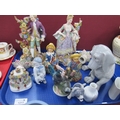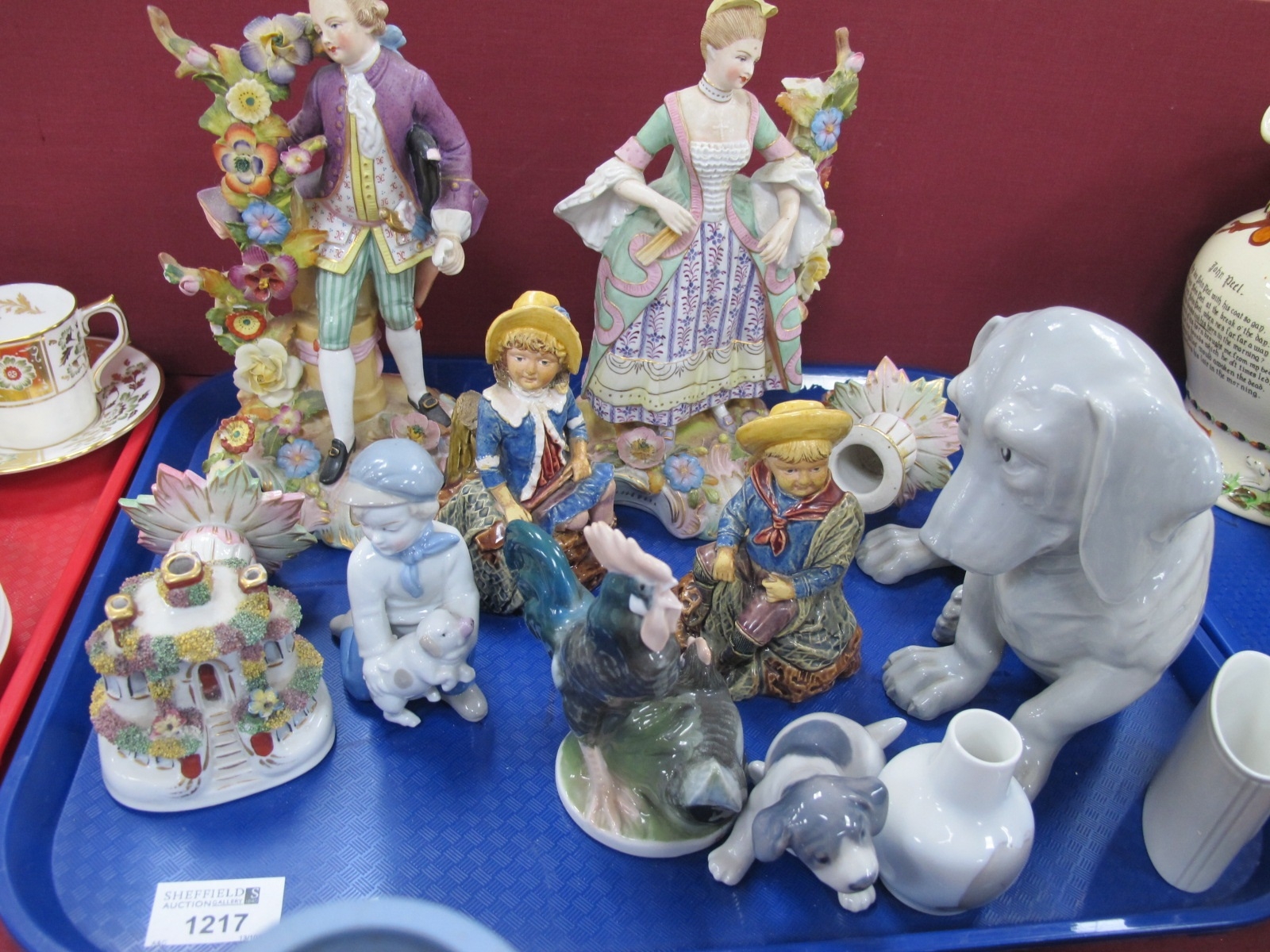 XIX century pair of continental figures, Royal Copenhagen figure of a dog etc. 1 Tray.