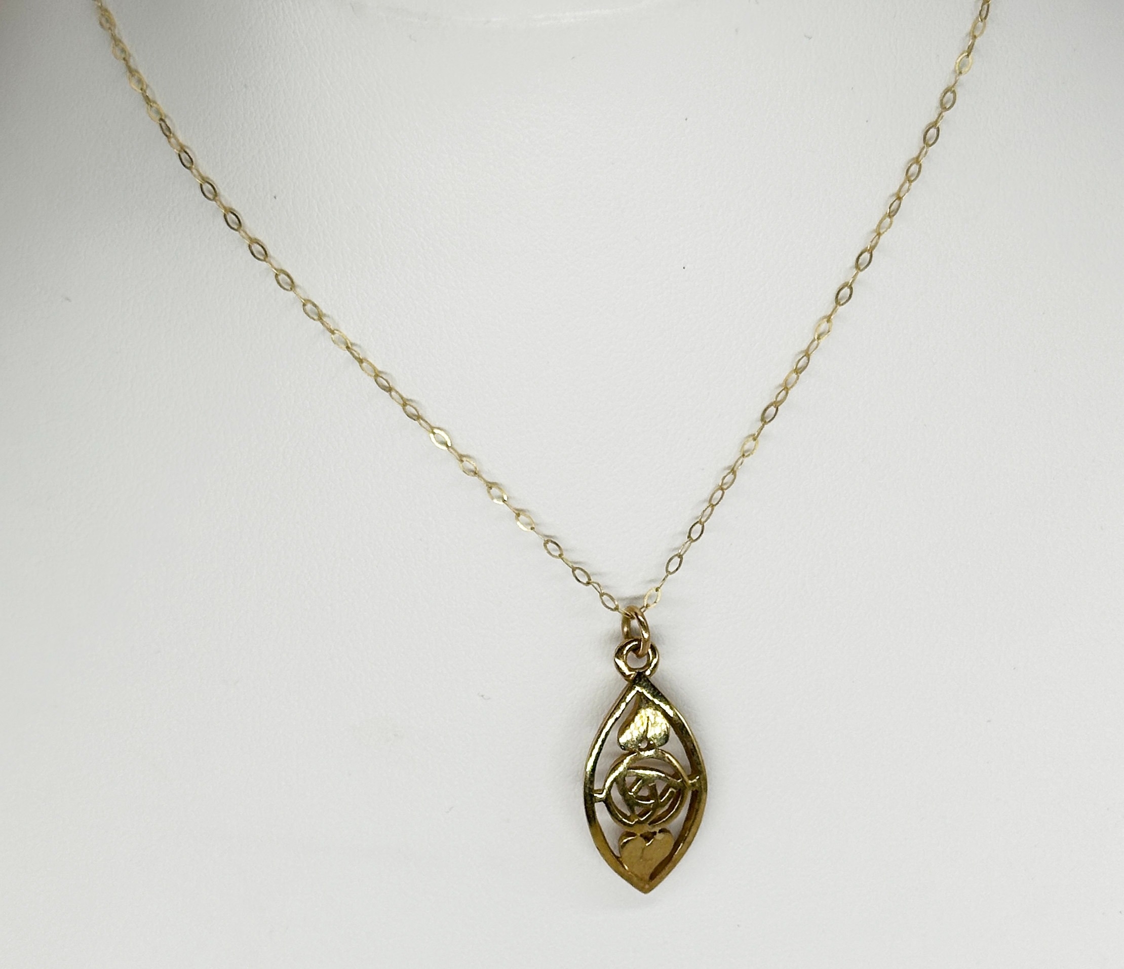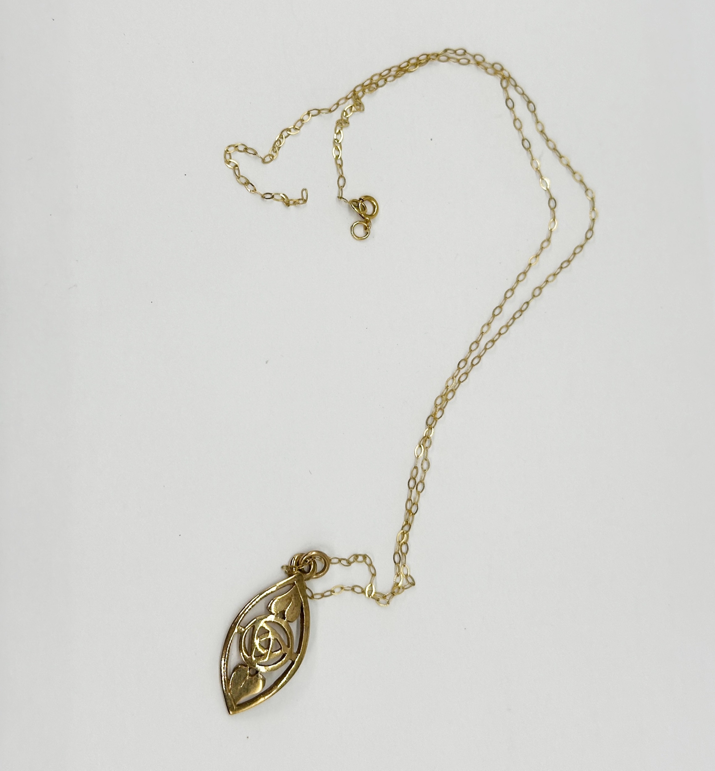 A 9ct yellow gold pendant & chain, Rennie McKintosh design pendant, chain is 16 inches long and needs a solder repair, weight 2.2 grams approx