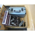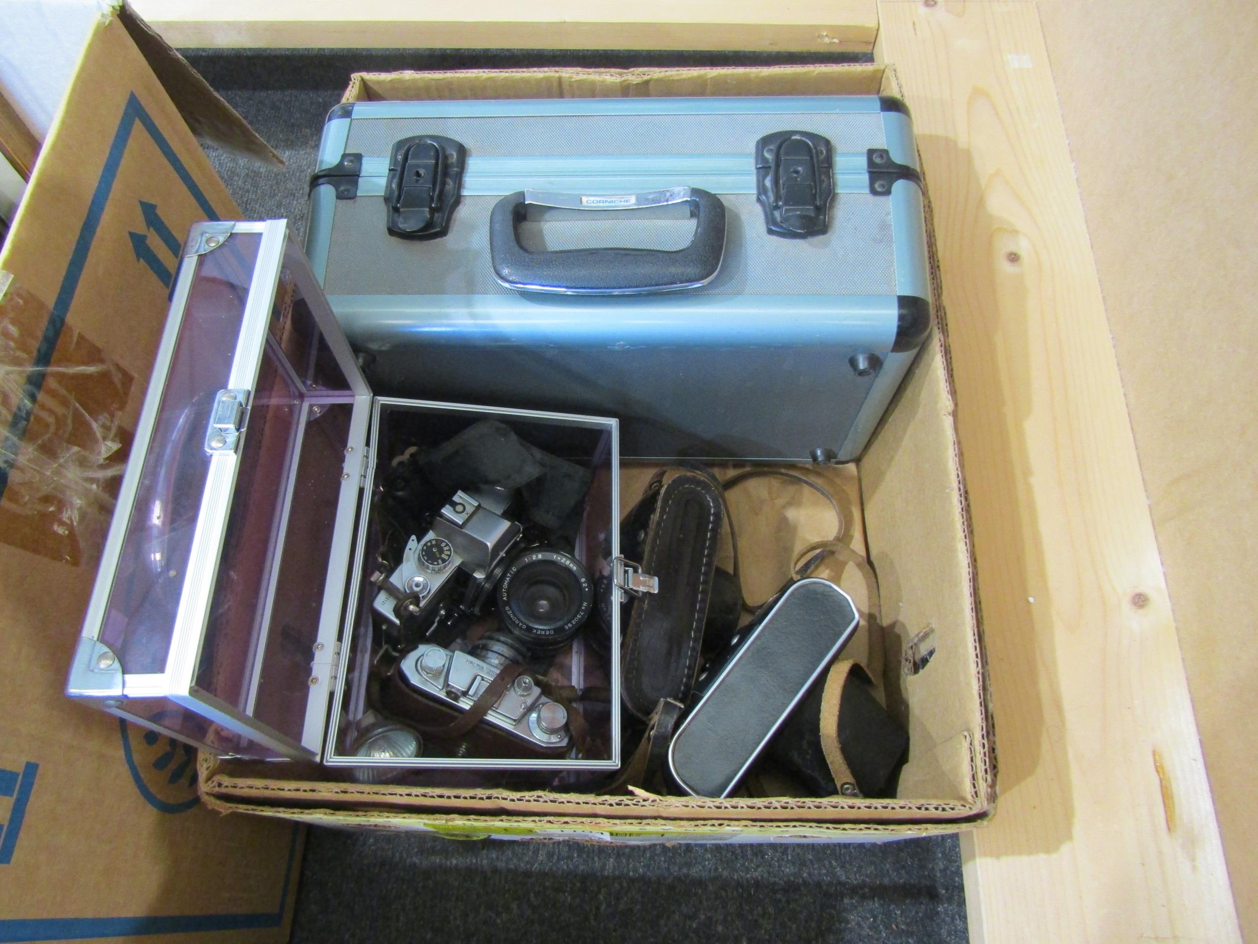 A box of camera equipment including Minolta SRT 101b, Halina 35X, Zenit-E Zorki 4 and a Panasonic NV-R50 VHS C movie camera