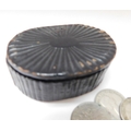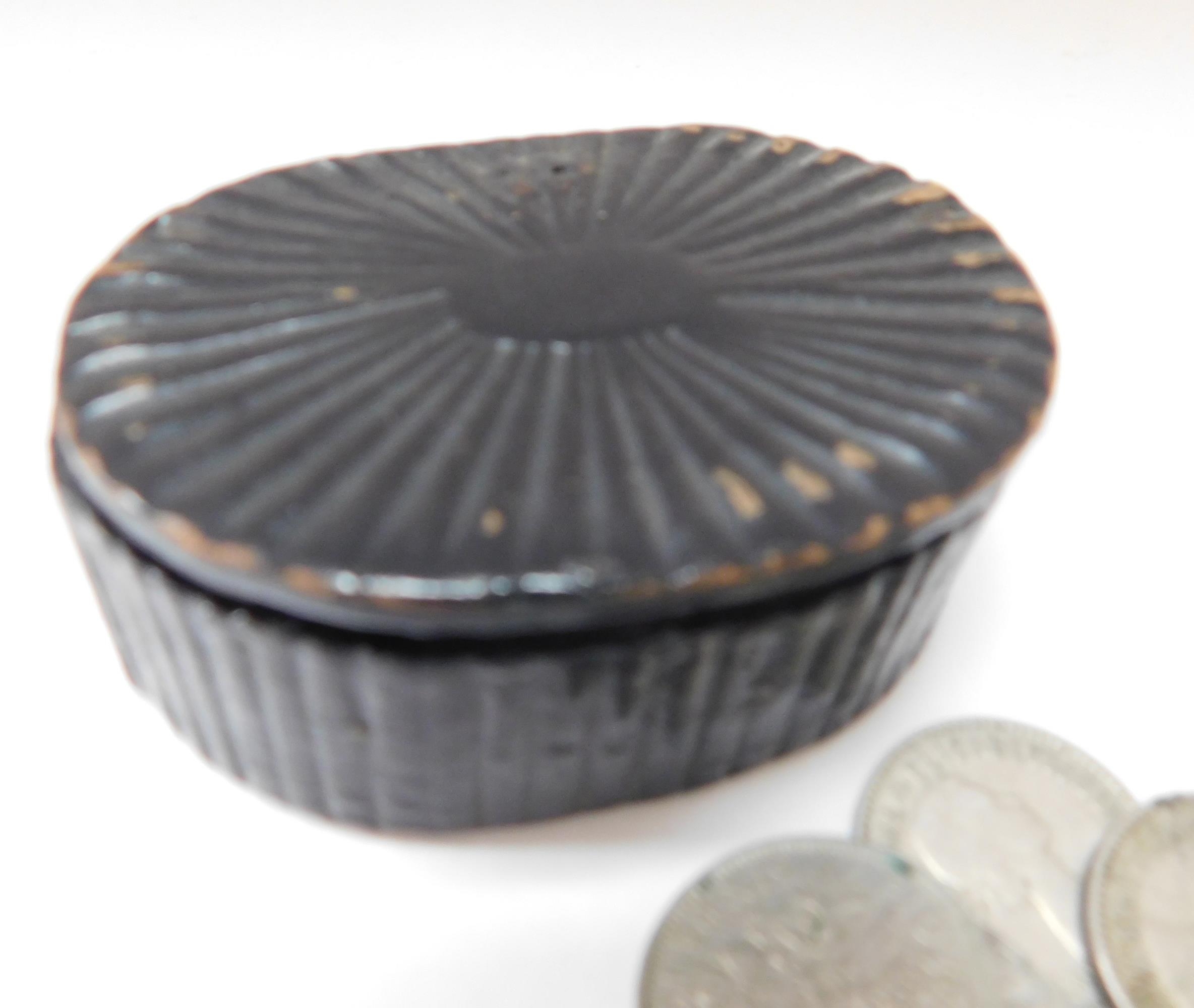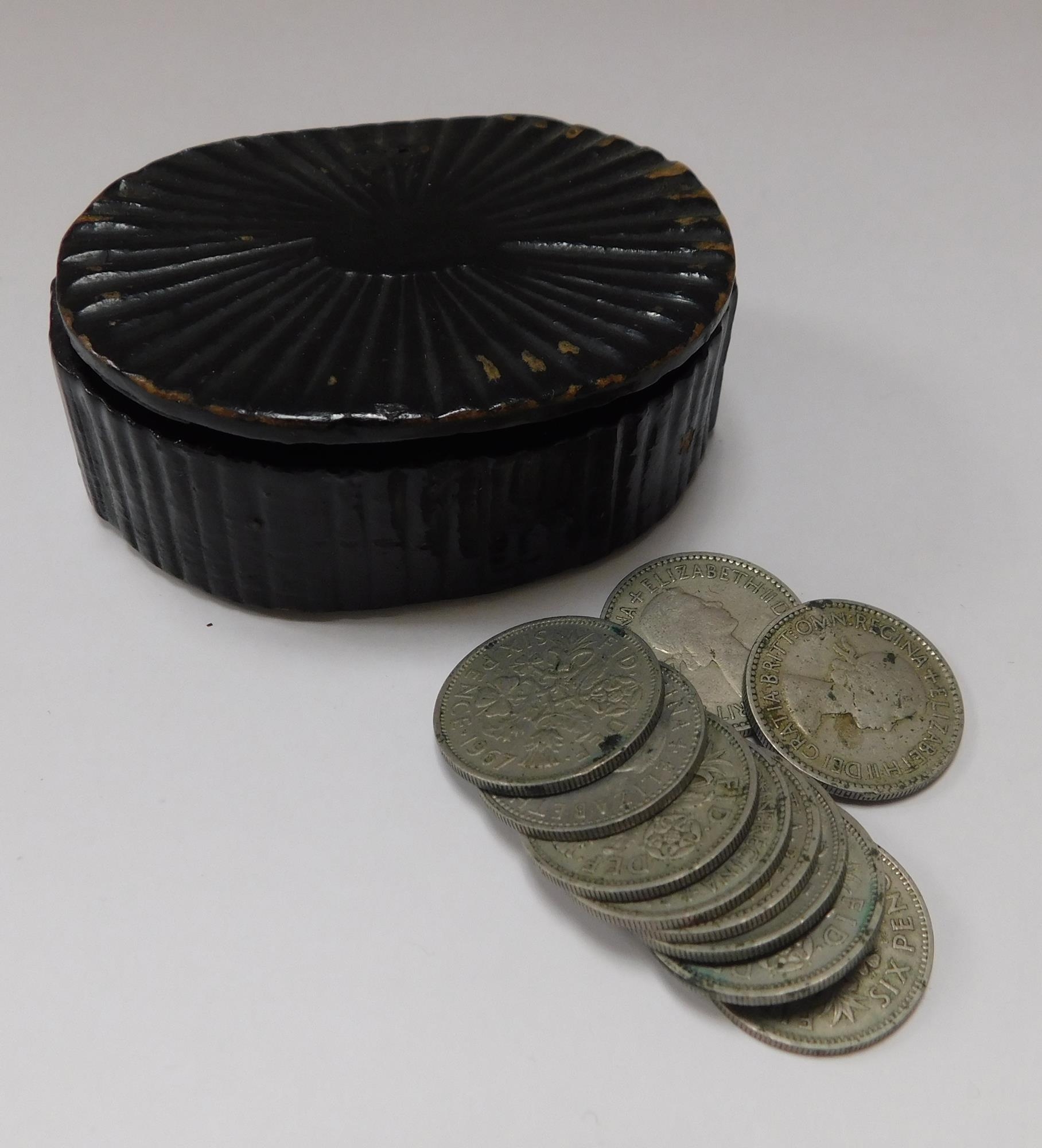 Victorian paper mache snuff box with six pences inside