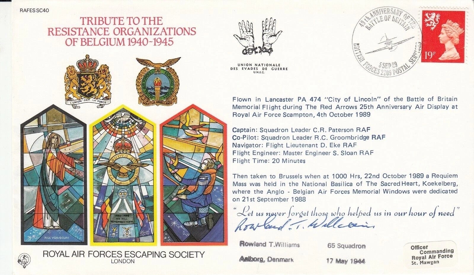 ES40 Belgium Resistance Signed by R T Williams Shot Down Aalborg Denmark. 5 Sep 89 BFPS 2209 49th Anniversary of the Battle of Britain. Royal Air Forces Escaping Society RAF FDC. Tribute Resistance Organizations of Belgium 1940 to 1945. L'Armee Secrete cachet on the front. Flown in Lancaster PA 474 Battle of Britain Memorial flight during The Red Arrows 25th Anniversary Air Display at RAF Scampton. Let us never forget those who helped us in our hour of need. Personally Signed by R T Williams 65 Sqn Aalborg Denmark Shot Down 17 May 44 Backstamped Royal Air Force St Mawgan 15 Sep 1989 and The Red Arrows 25th Anniversary. Only 100 Signed. ( 9 different Signed Covers issued ) . Single Vendor RAF cover collection. Good condition. All autographs come with a Certificate of Authenticity. We combine postage on multiple winning lots and can ship worldwide. UK postage from £5.99, EU from £7.99, Rest of World from £9.99