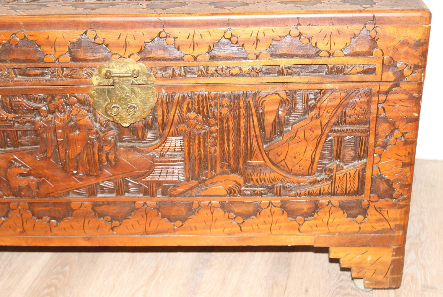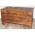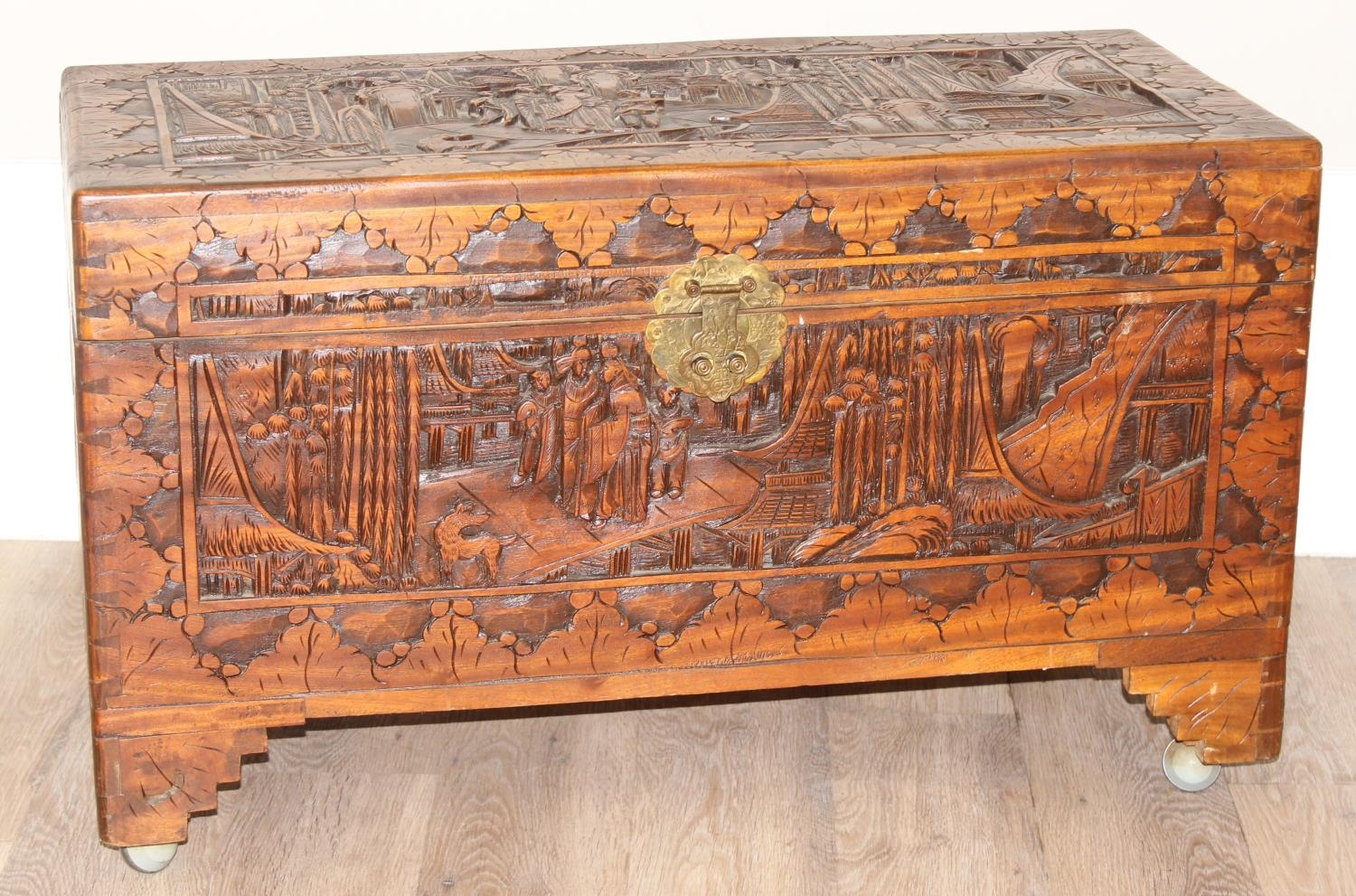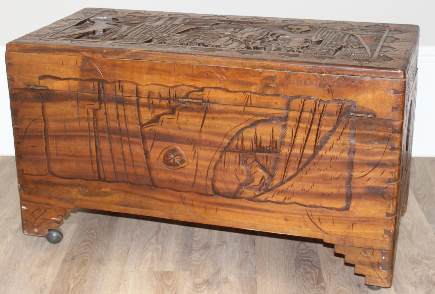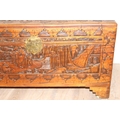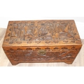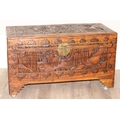 An Oriental carved camphorwood chest, early-mid 20th century, approx 88cm wide x 44cm deep x 52cm tall