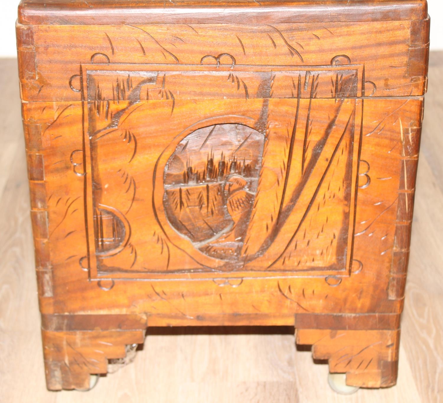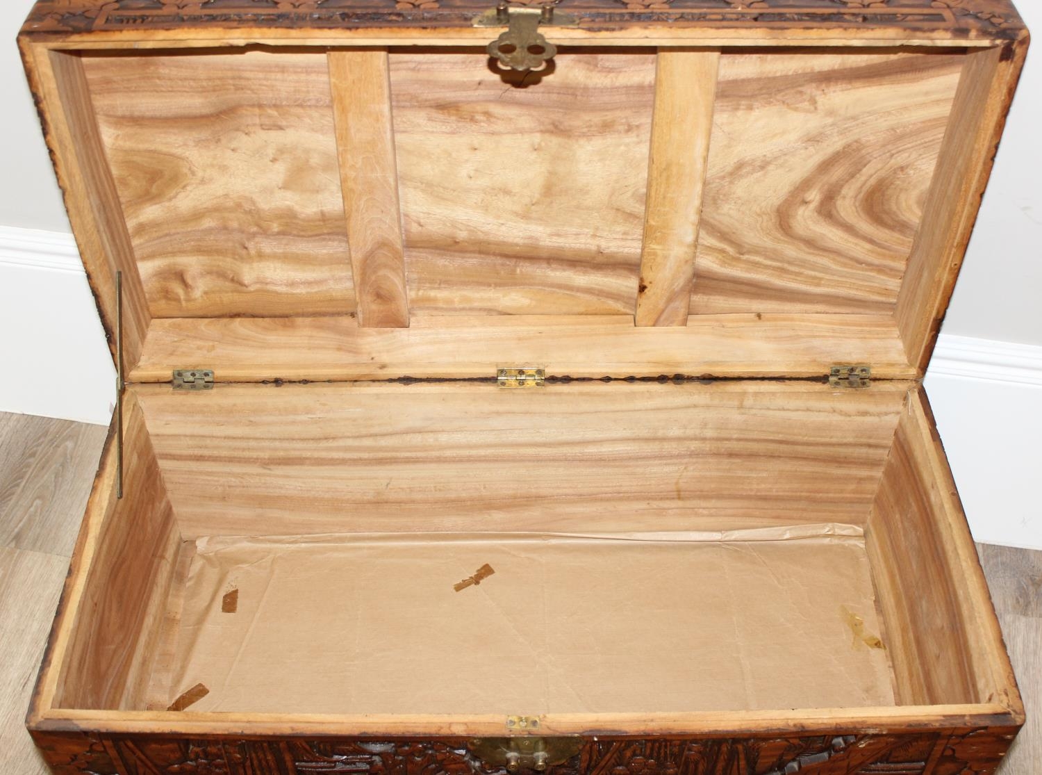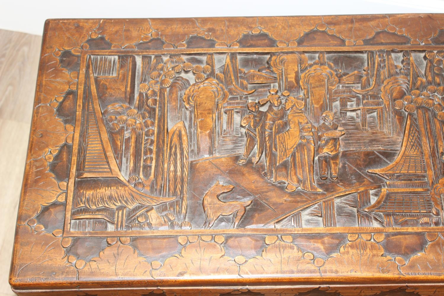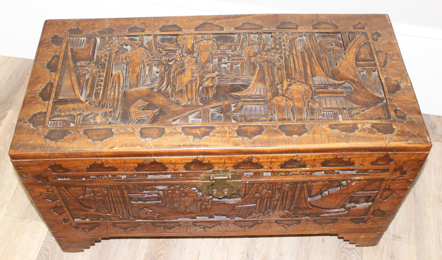 An Oriental carved camphorwood chest, early-mid 20th century, approx 88cm wide x 44cm deep x 52cm tall