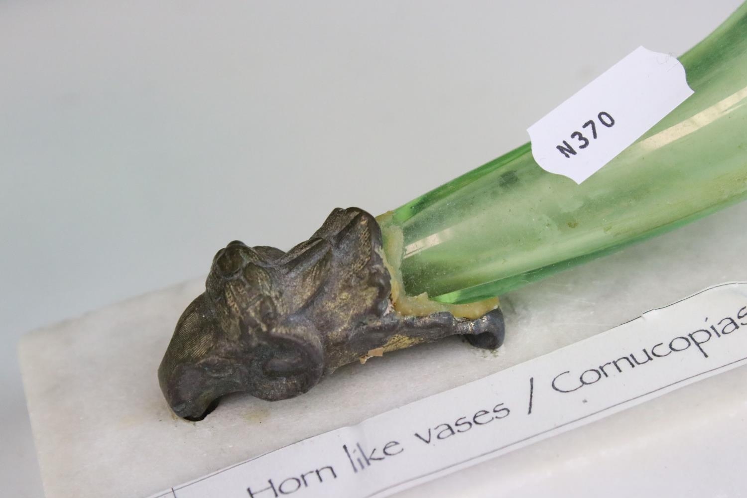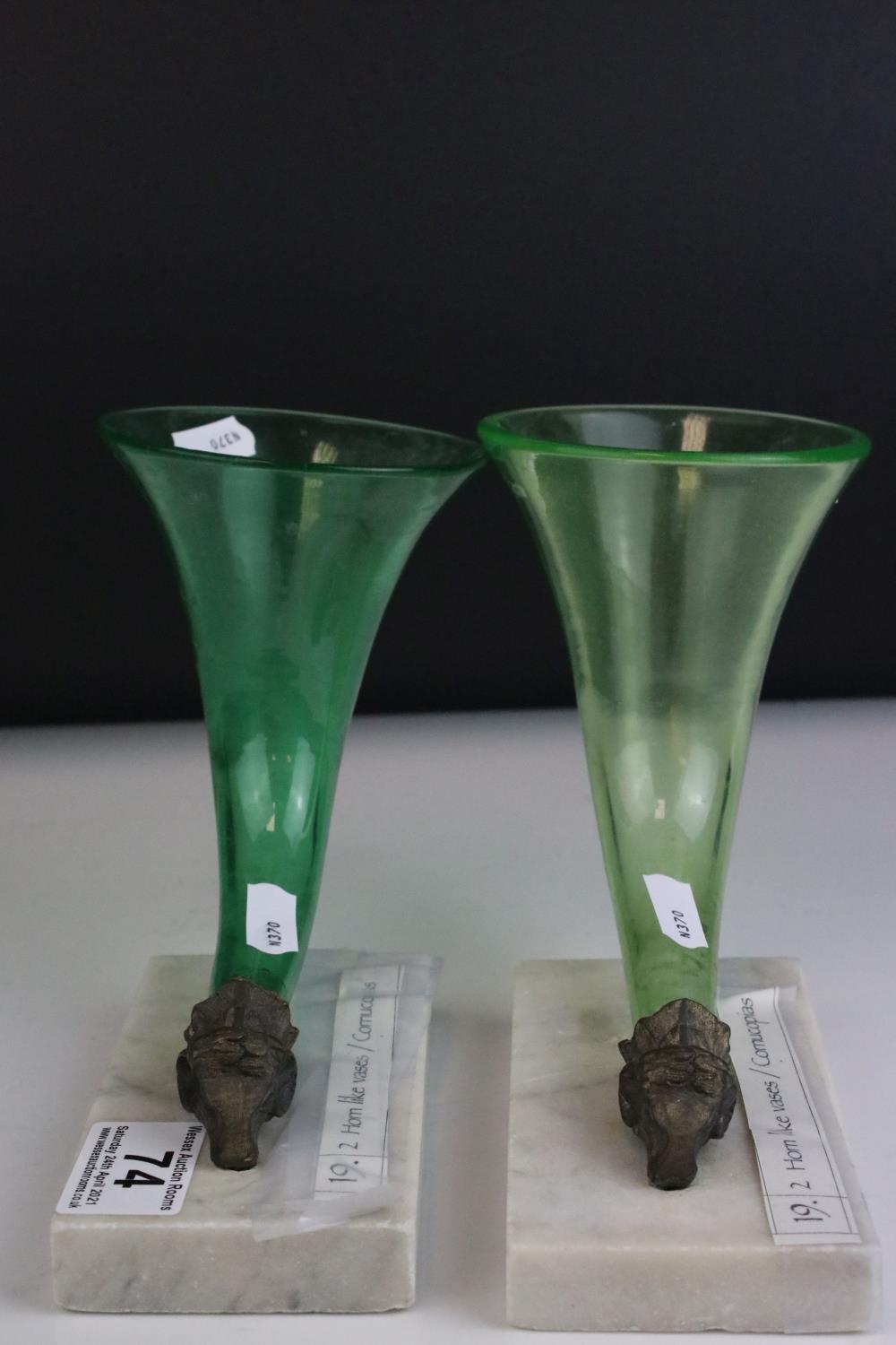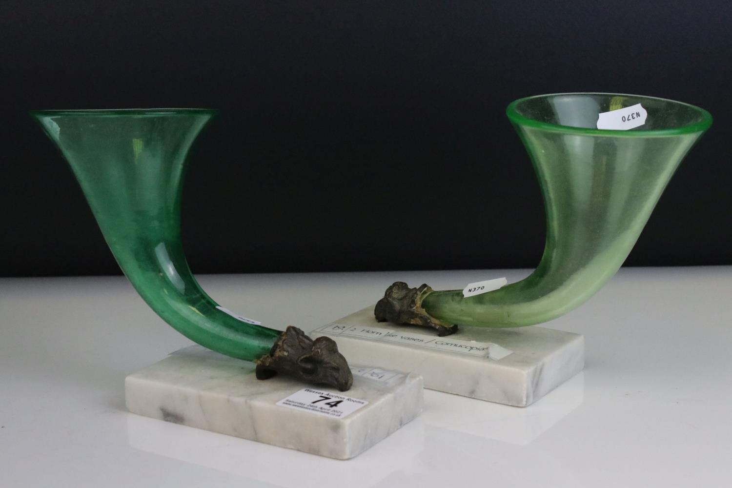 Pair of Green Glass Cornucopia Vases held in Gilt Metal Rams stood on White Marble Plinths, 15cms high
