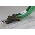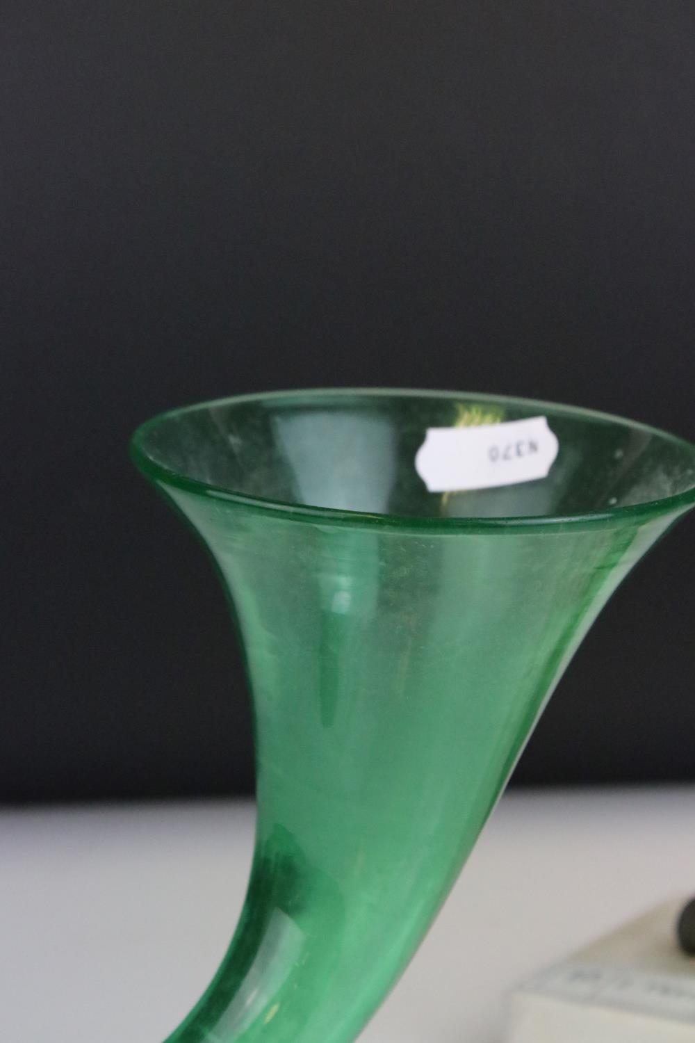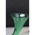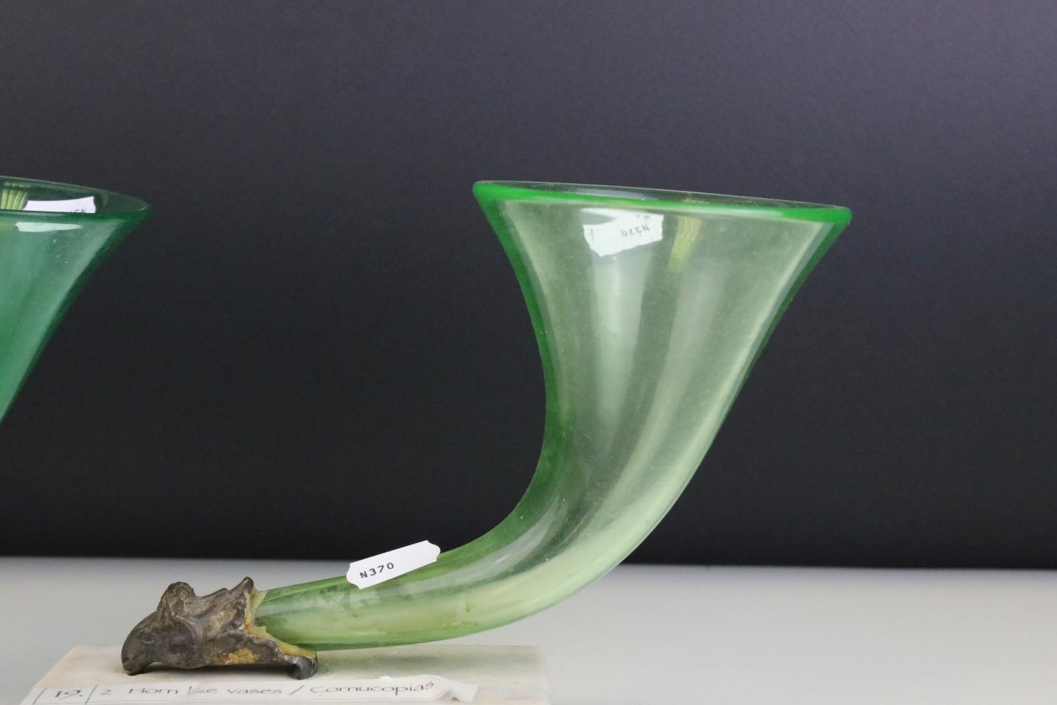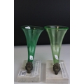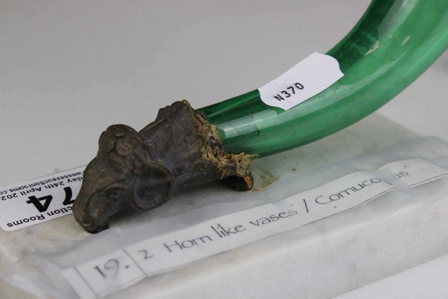 Pair of Green Glass Cornucopia Vases held in Gilt Metal Rams stood on White Marble Plinths, 15cms high