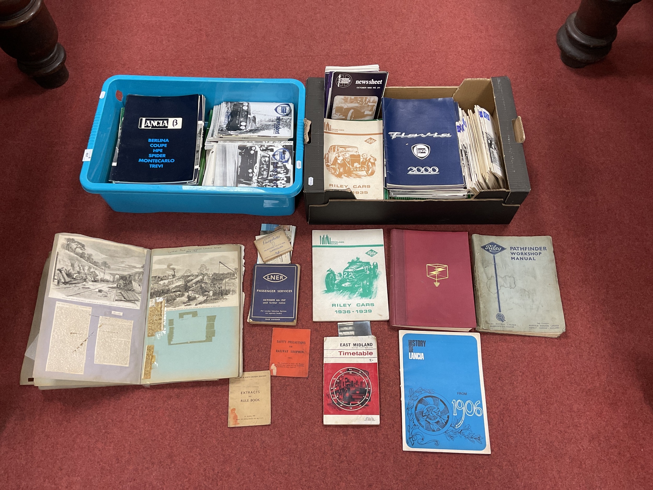 A Quantity of Motorsport Magazines, Motoring Publications to include Lancia and Riley interest. Together with a collection of mainly railway themed publications including LNER Passenger Services Timetable 1947, OO Gauge Model Blue Prints, Newspaper Cuttings (circa 1860's) within scrapbook. (Two Boxes).