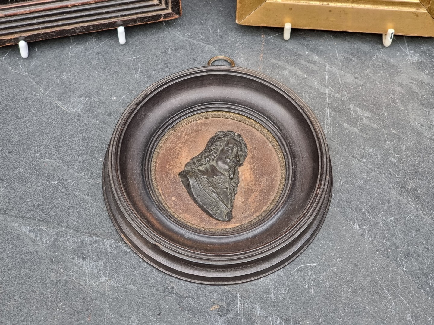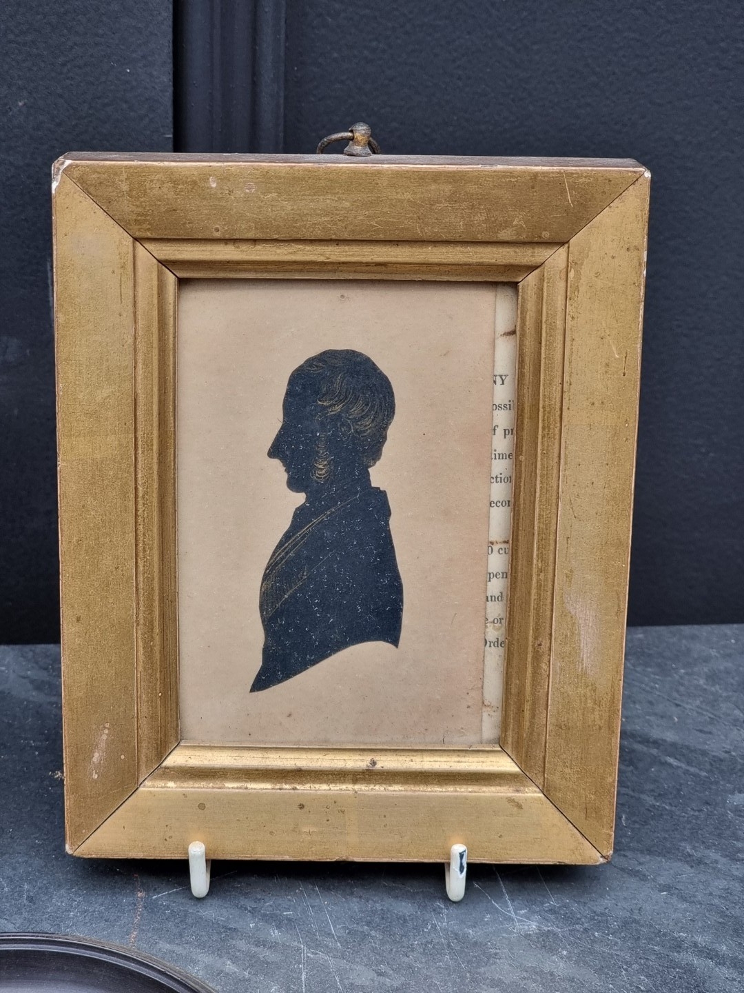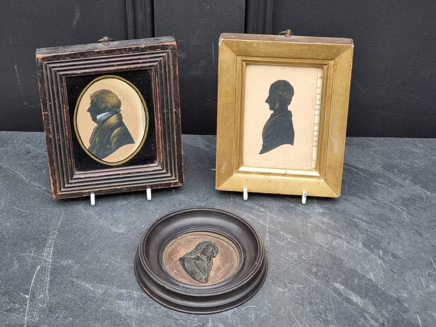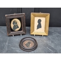Two 19th century portrait miniature silhouette profiles, each with gilt highlights; together with a relief plaque of Charles I, the whole 12.2cm diameter. (3)