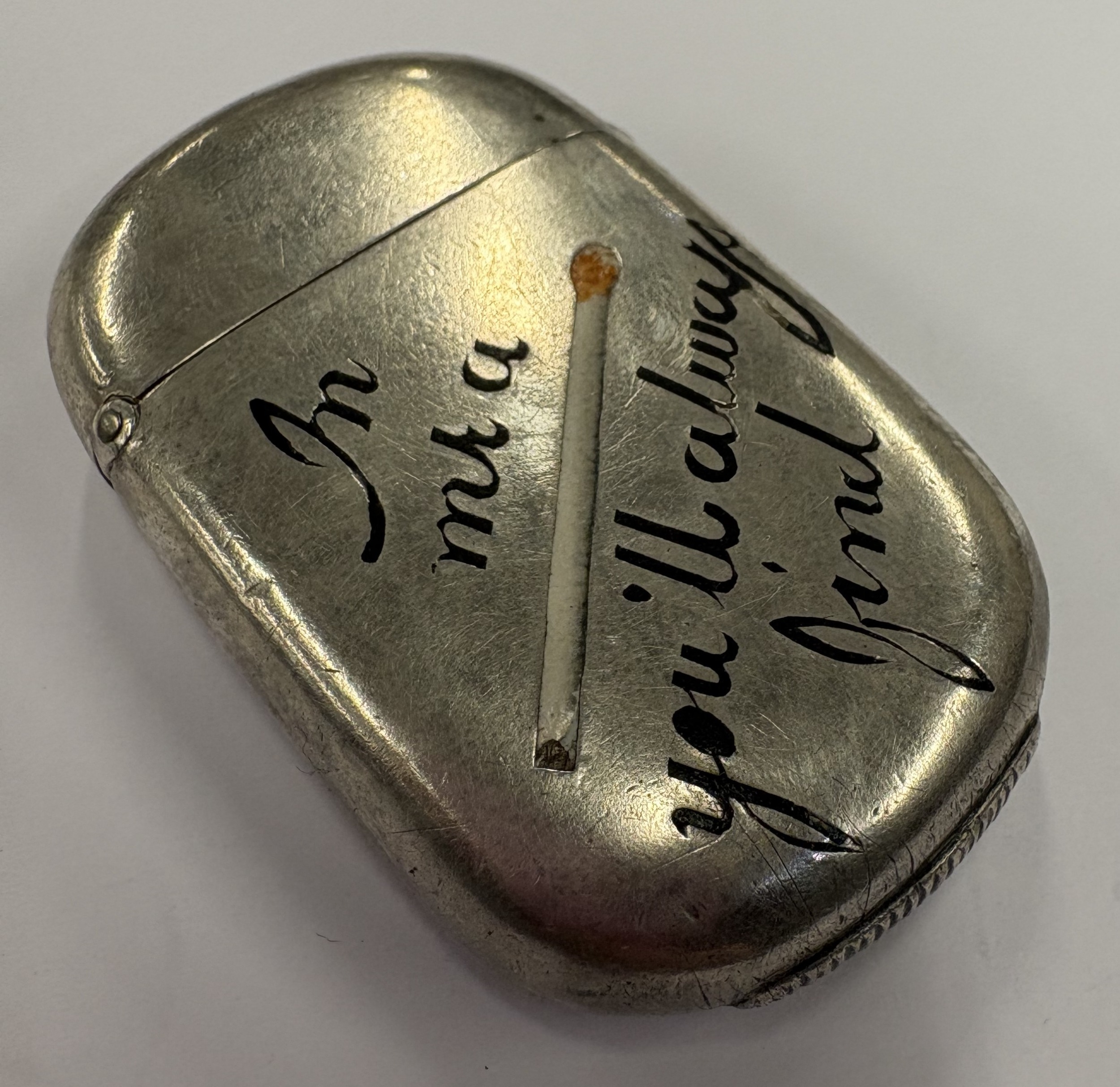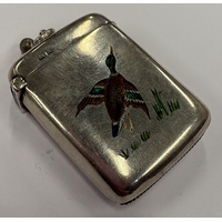 A Victorian silver and enamelled vesta case decorated with a pictorial pun 'In Me A (Match) You'll Always Find'. Birmingham 1886. By S Blanckensee & Son Ltd. Approx. 36 grams. Est. £200 - £300.