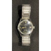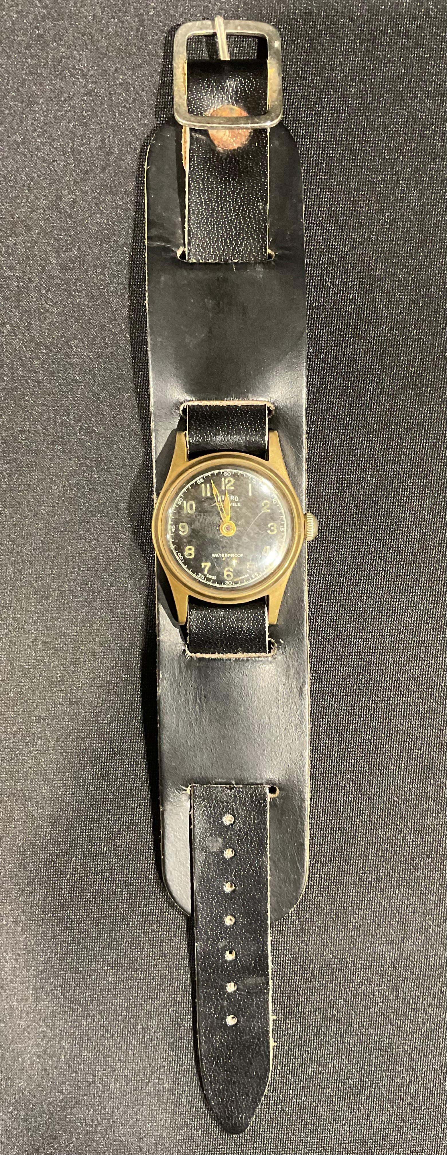 An Apero military style wristwatch, dated 1945, blackened dial with luminous Arabic numerals, 15 jewel movement, 30mm case