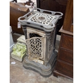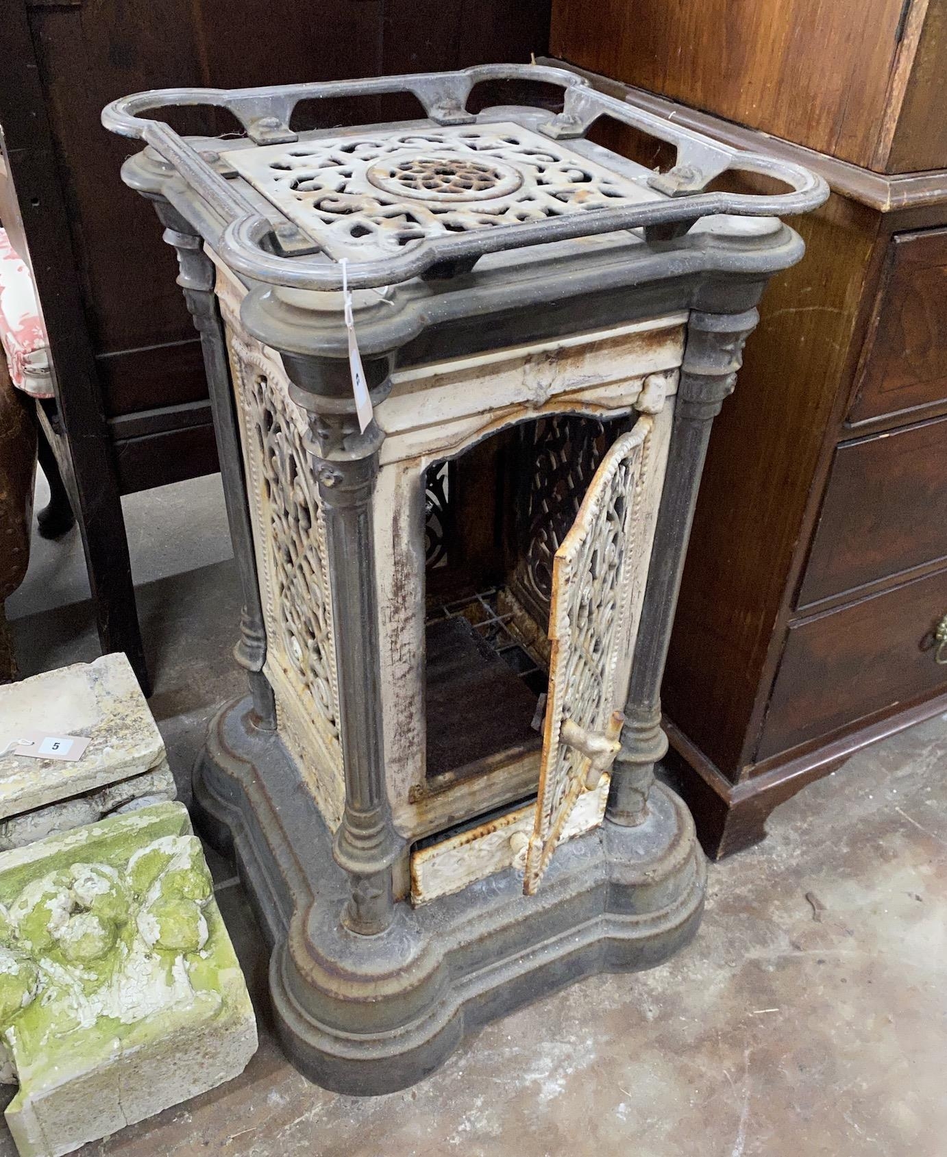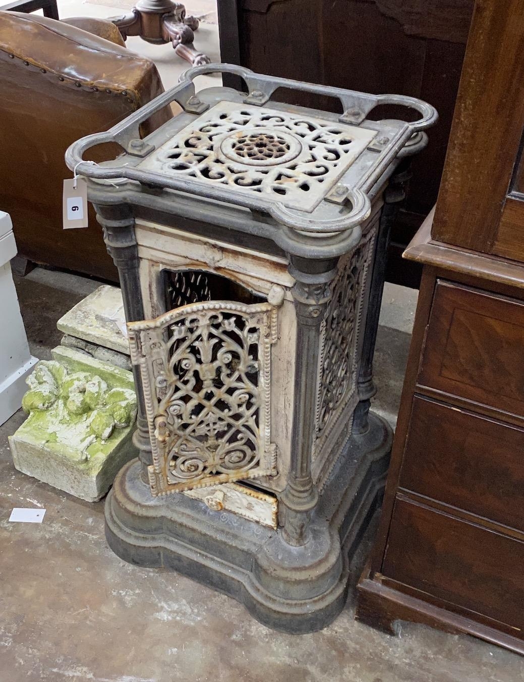 A 19th century French enamelled cast iron conservatory heater, lacking burner, width 44cm, height 85cm