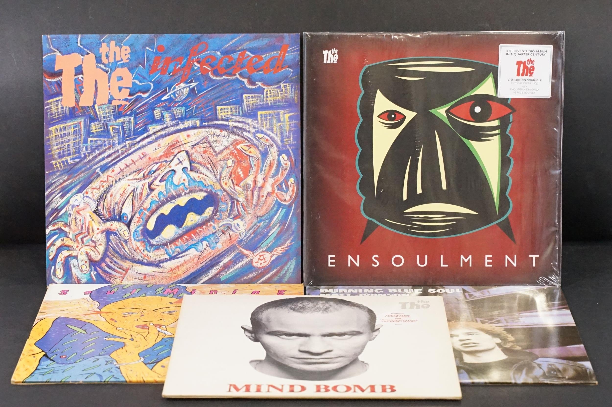 Vinyl - 5 The The LP’s to include: Ensoulment (Ear Music – 0219535EMU, UK 2024 double clear vinyl), Matt Johnson (The The) – Burning Blue Soul (4AD – CAD 113, UK 1984), Soul Mining (Epic / Some Bizzare – EPC 25525 / Epic – XPR 1250, UK 1983 limited edition double with 12”), Infected (Epic – EPC 26770, UK 1986), Mind Bomb (Epic – 463319 1, UK 1989 with hype sticker). Condition EX overall