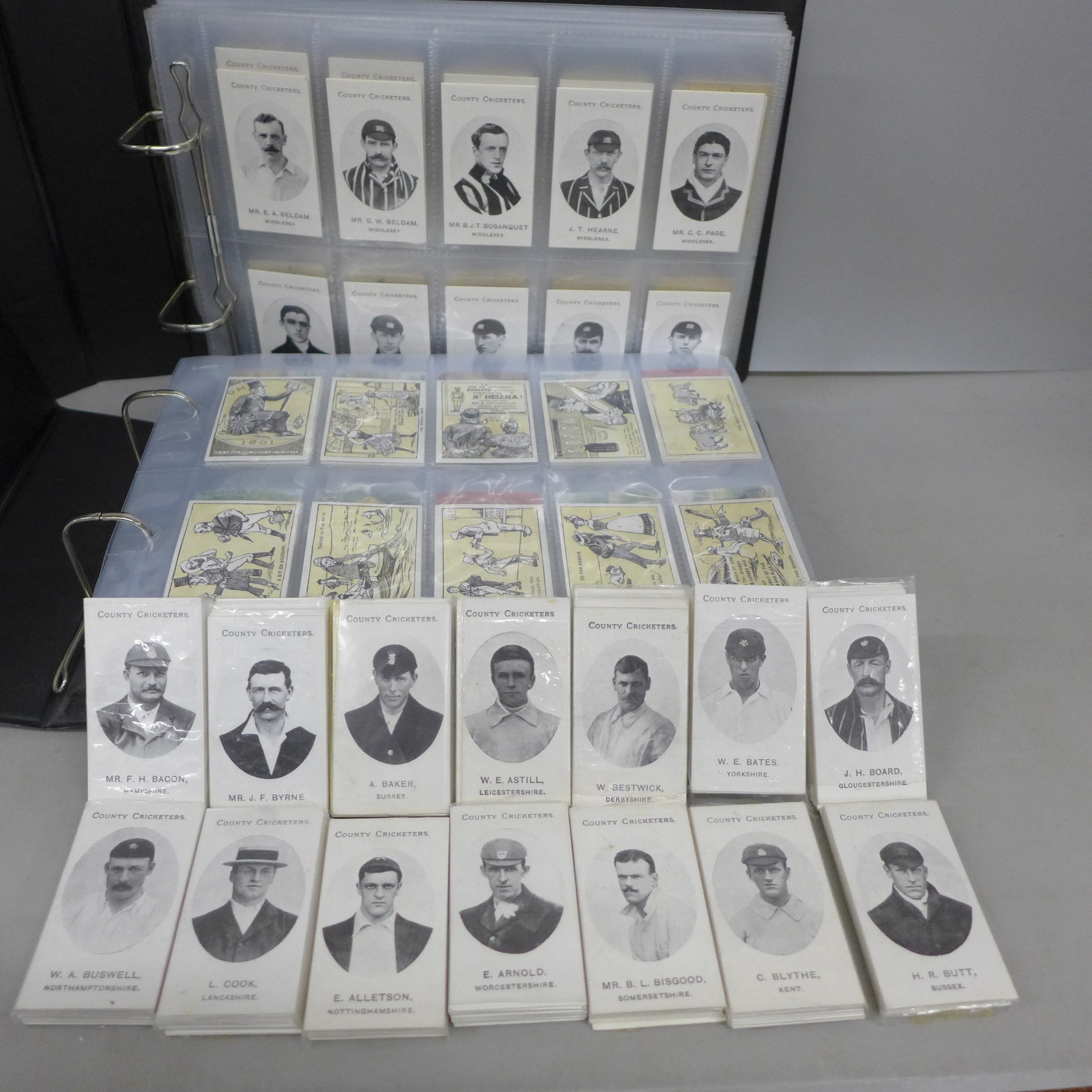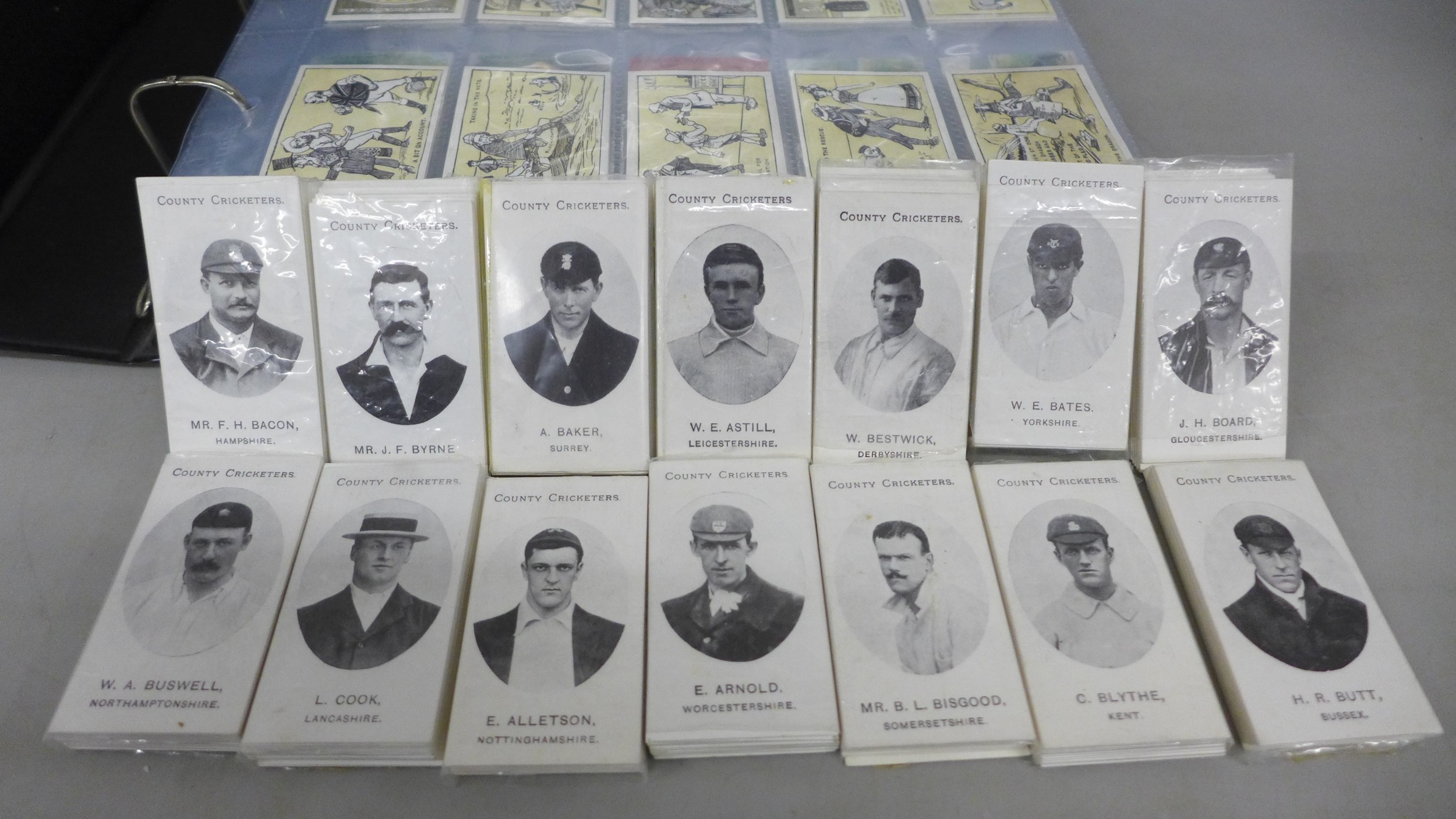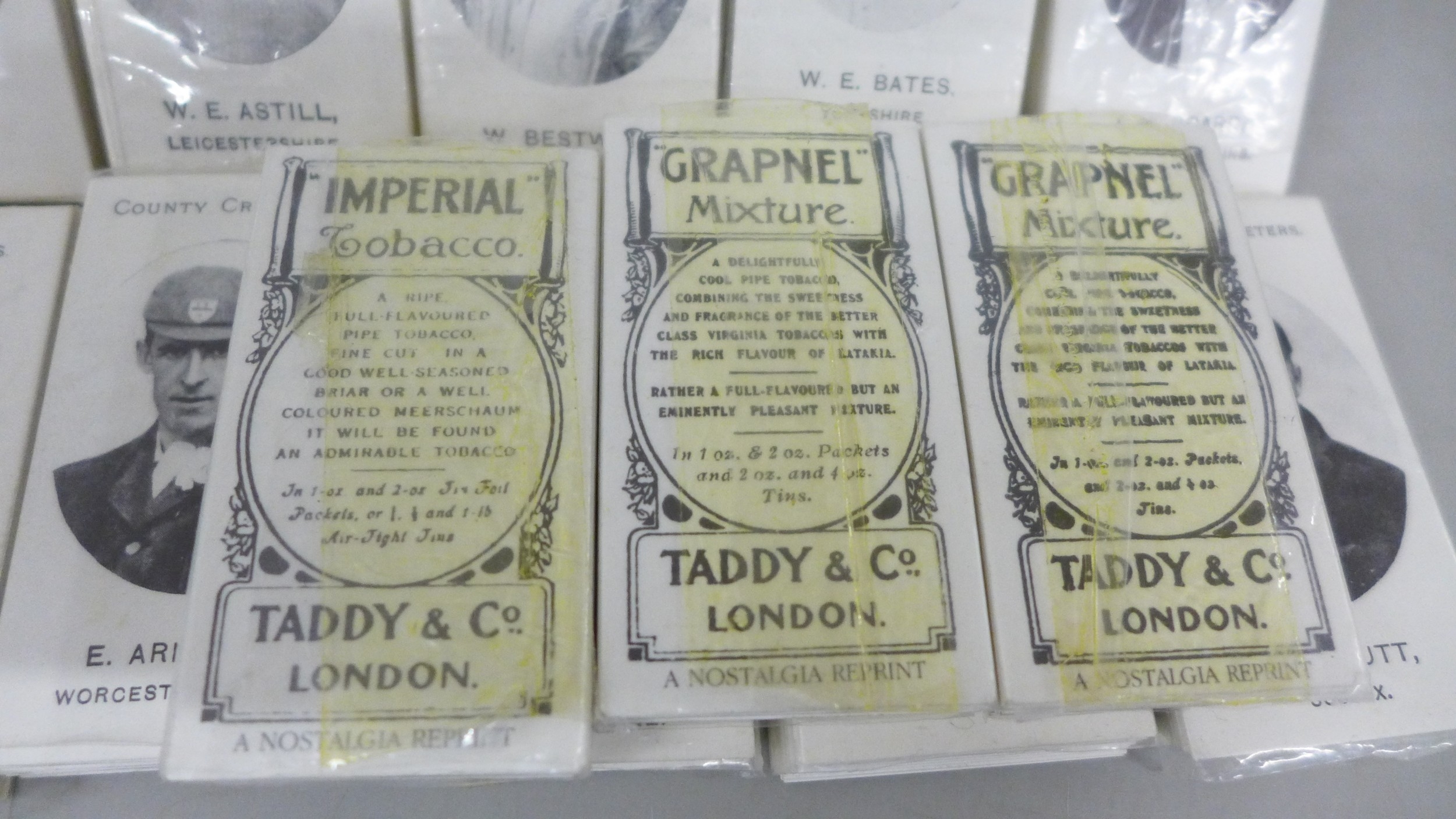 A collection of forty-five complete reproductions of early 1900s cigarette card sets in two albums and some individual sealed County Cricket sets, totalling over 1300 cards, brands include, Myrtle Grove, Ogden's, Bradford's Boston, Taddy & Co., etc., covering many themes