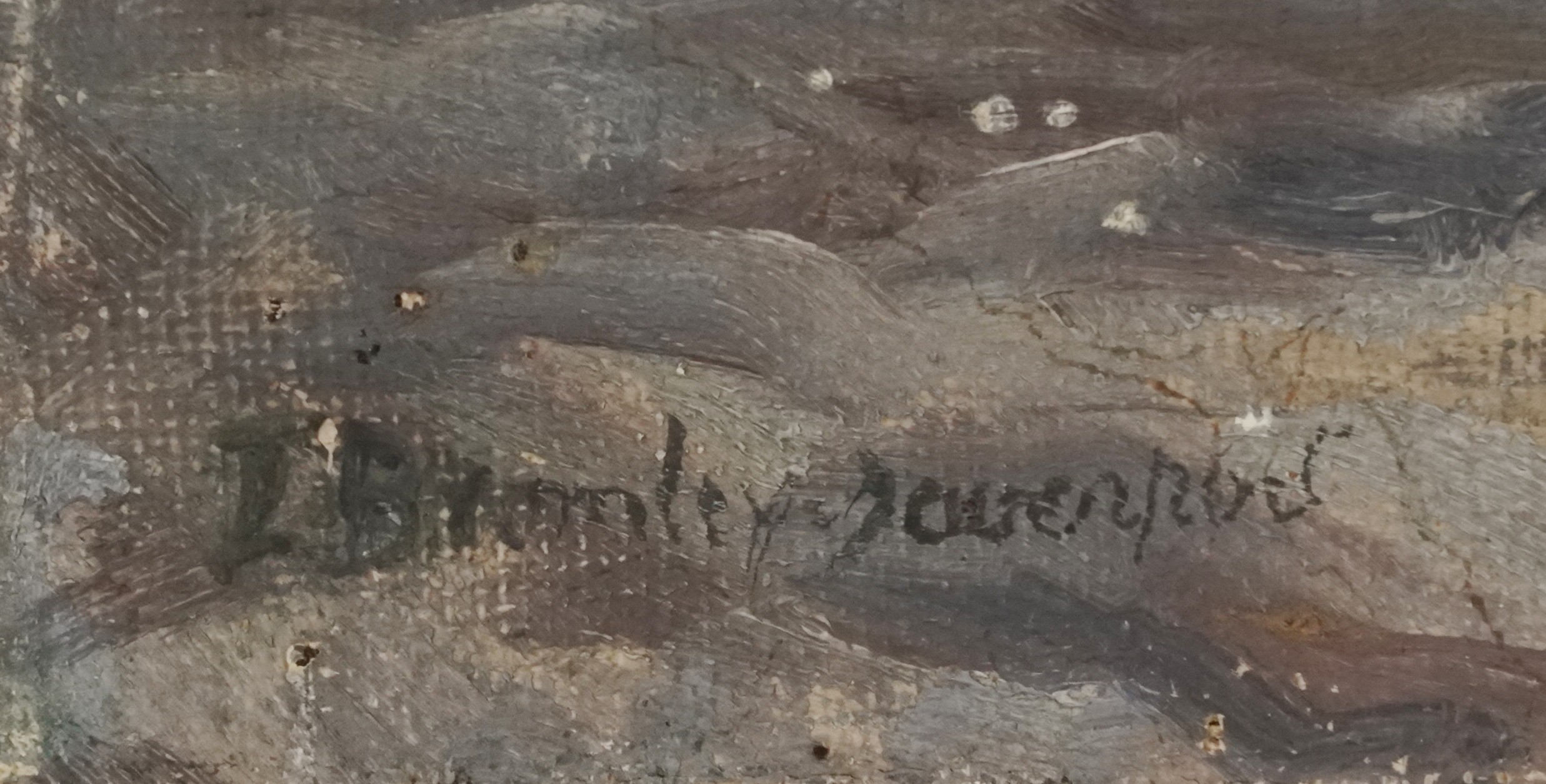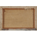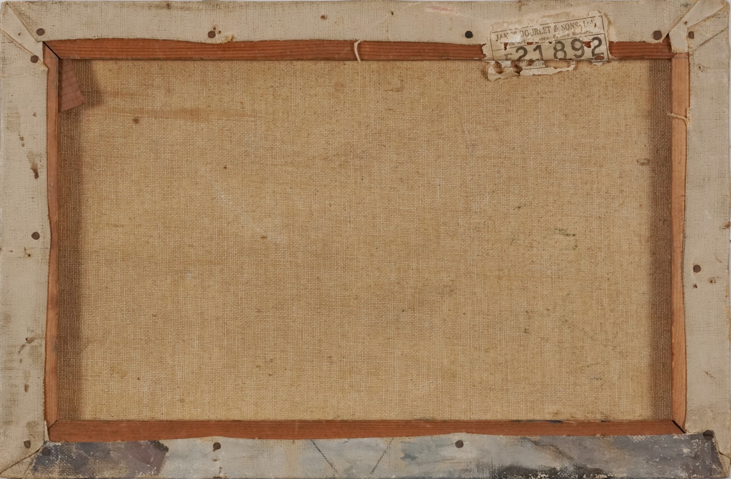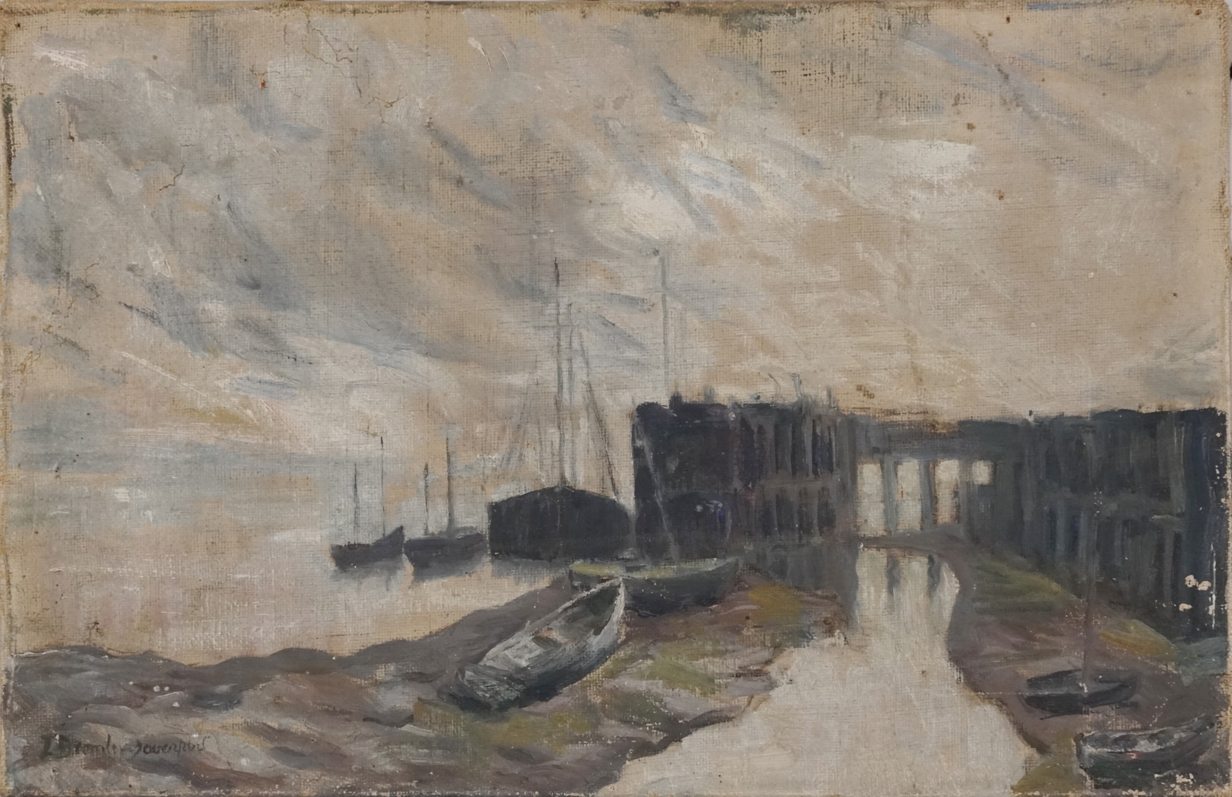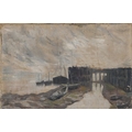 Boatyard, early 20th century British school oil on canvas, indistinctly signed, unframed, 26cm x 41cm.