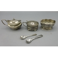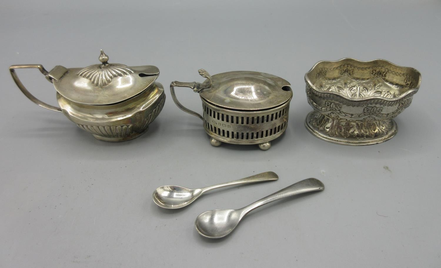 Victorian silver salt on a pedestal foot, decorated with repoussé ribbon swag by Sibray, Hall & Co, Sheffield 1882, a George V silver mustard in oval form, stood on four ball feet and pierced body by Ernest Druiff & Co, and another silver mustard, 4.09ozt
