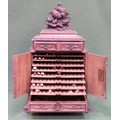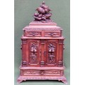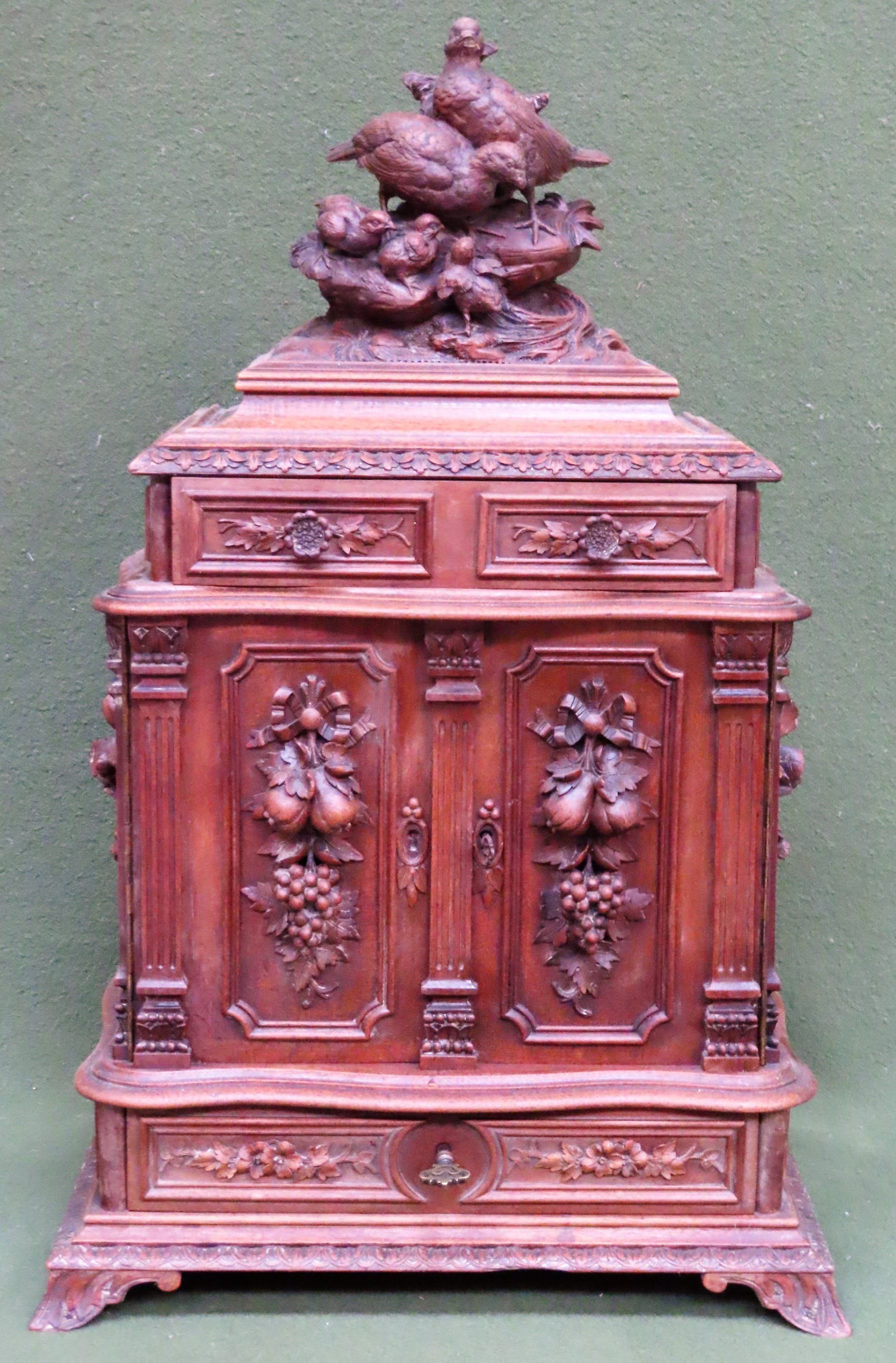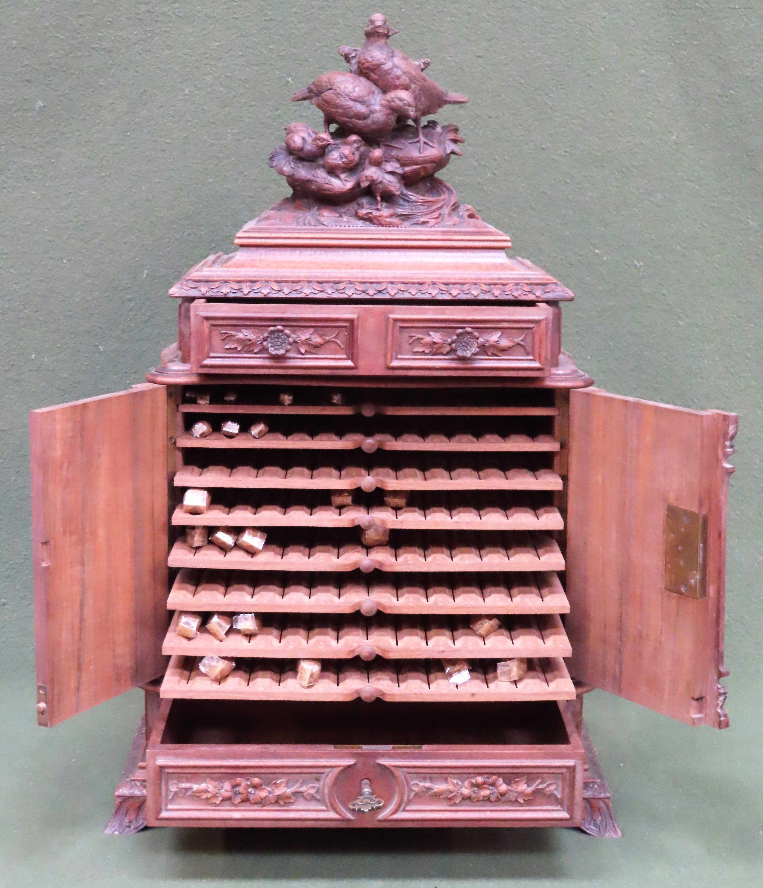 Fine 19th century heavily carved Black Forest table top Cigar humidor, decorated with panels of fruit and foliage and partridges to top, fitted with single drawer to top, single drawer to bottom, two central doors, and eight slide drawers, underside of drawer marked "bought at the Paris exhibition 1883". Approx. 59cm H X 36cm W X 22cm D
