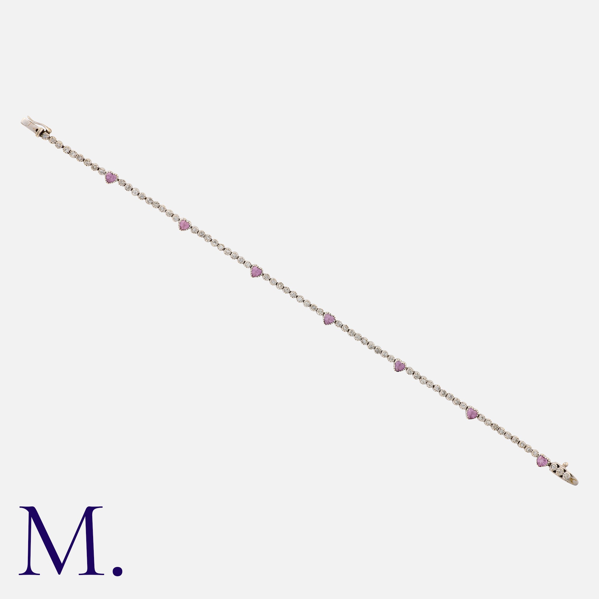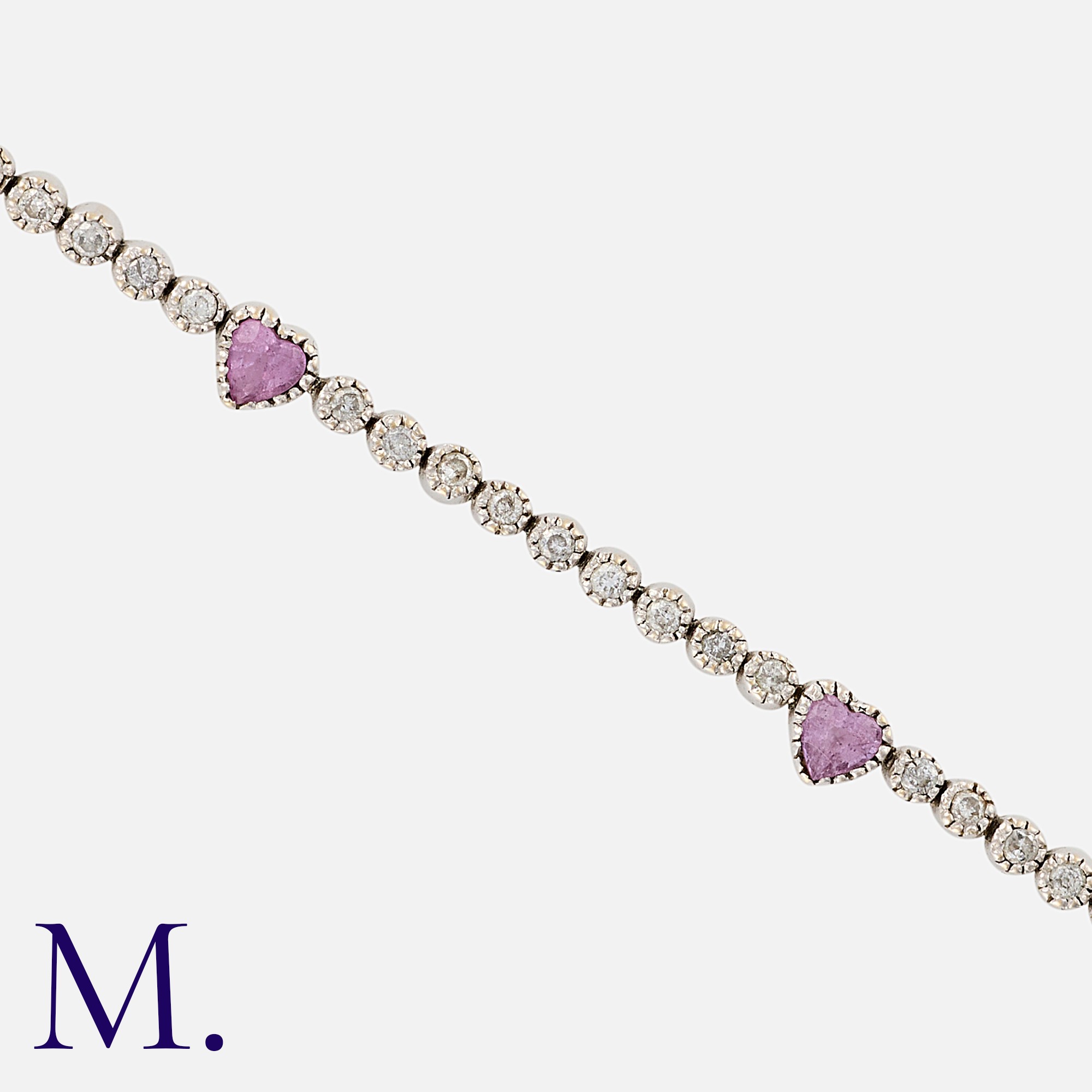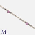 A Diamond and Pink Sapphire Bracelet in 18 carat white gold, comprising a row of round cut diamonds totalling approximately 1.65 carats, punctuated by heart shaped pink sapphires. Marked 18K.