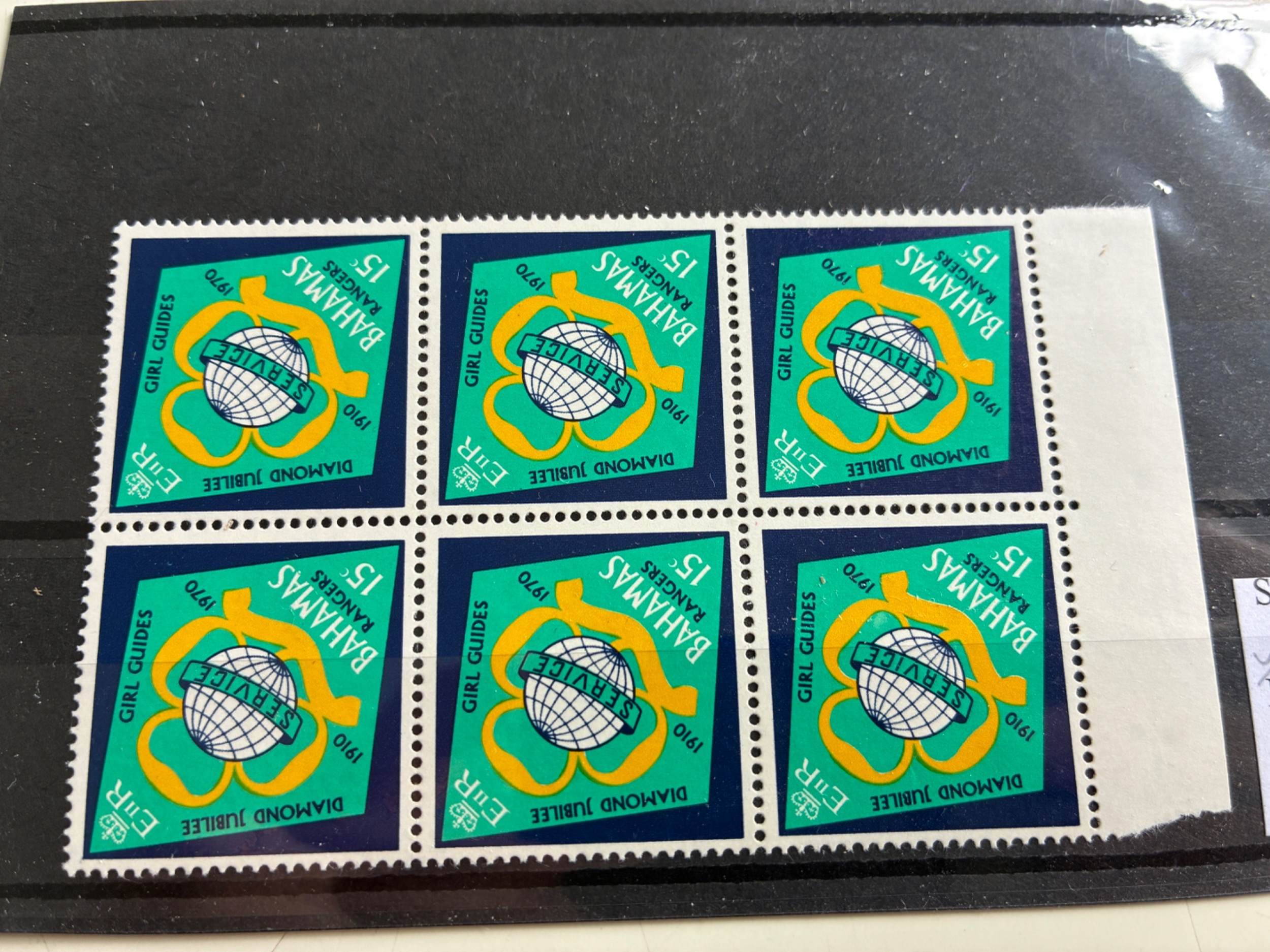 Bahamas 1970 15c Girl Guides marginal block of 6 with inverted wmk., u/m. (SG 344w x 6). Cat £102