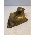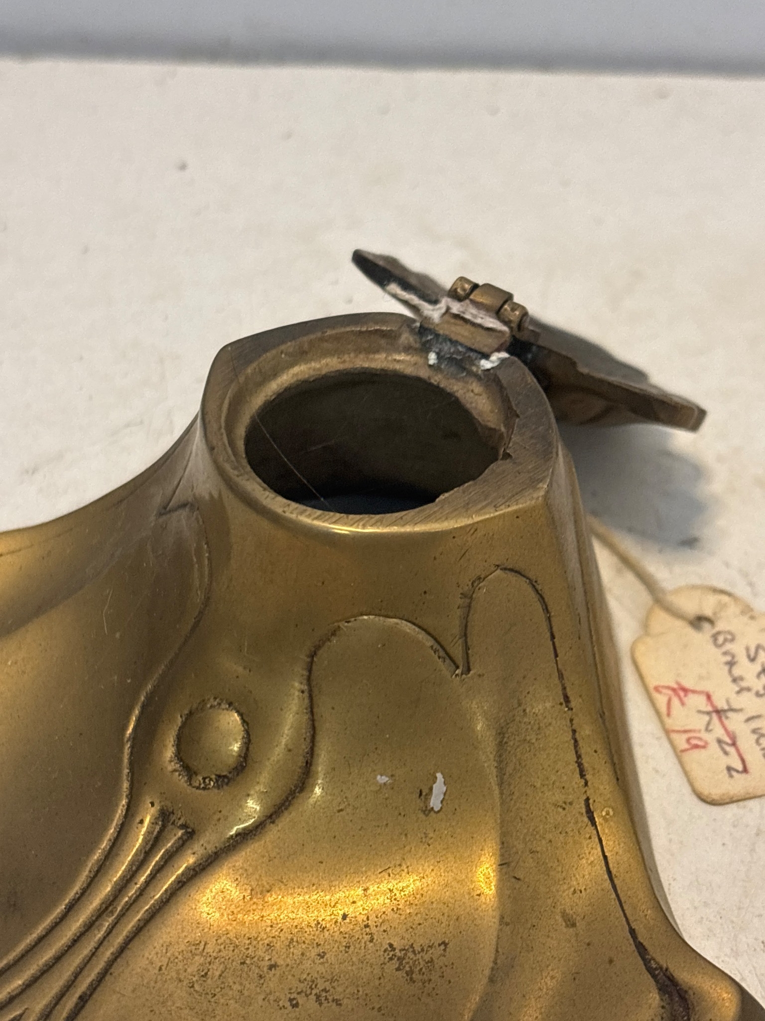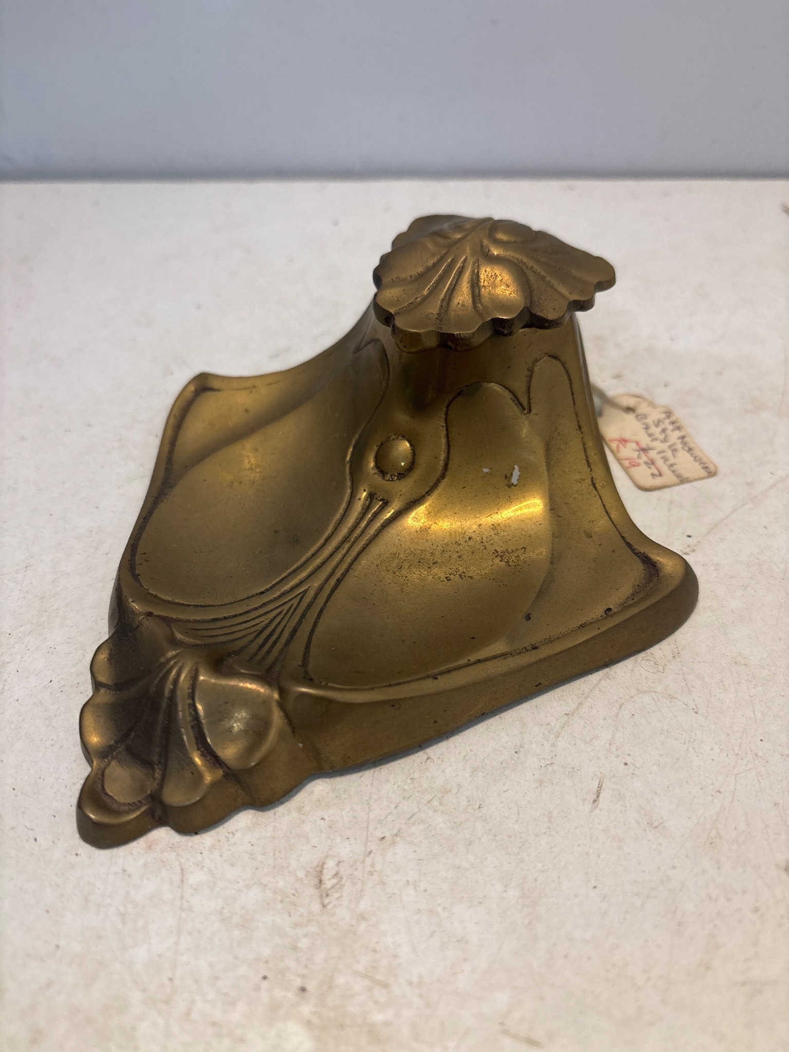 Art Nouveau brass inkwell with ornate floral details and hinged lid. Features wear and patina consistent with age. The inner ink container is missing.