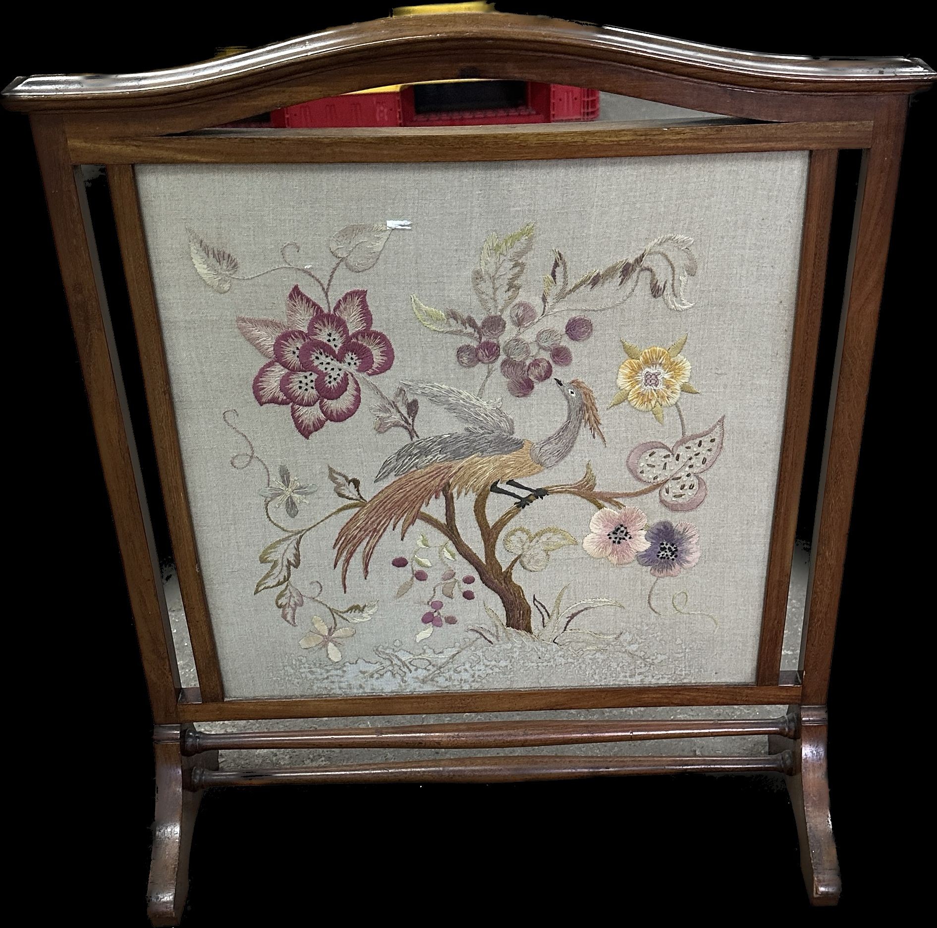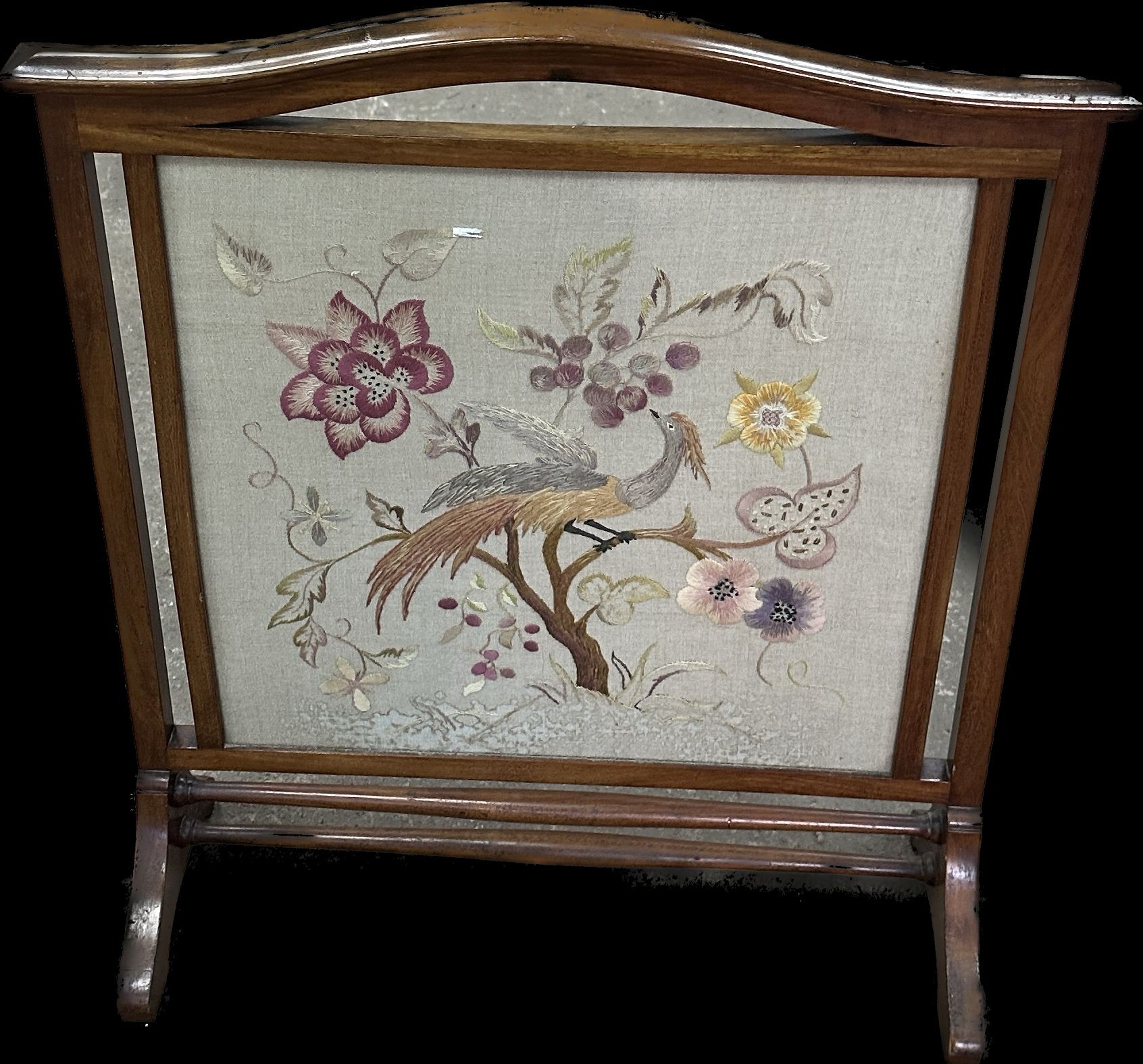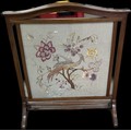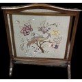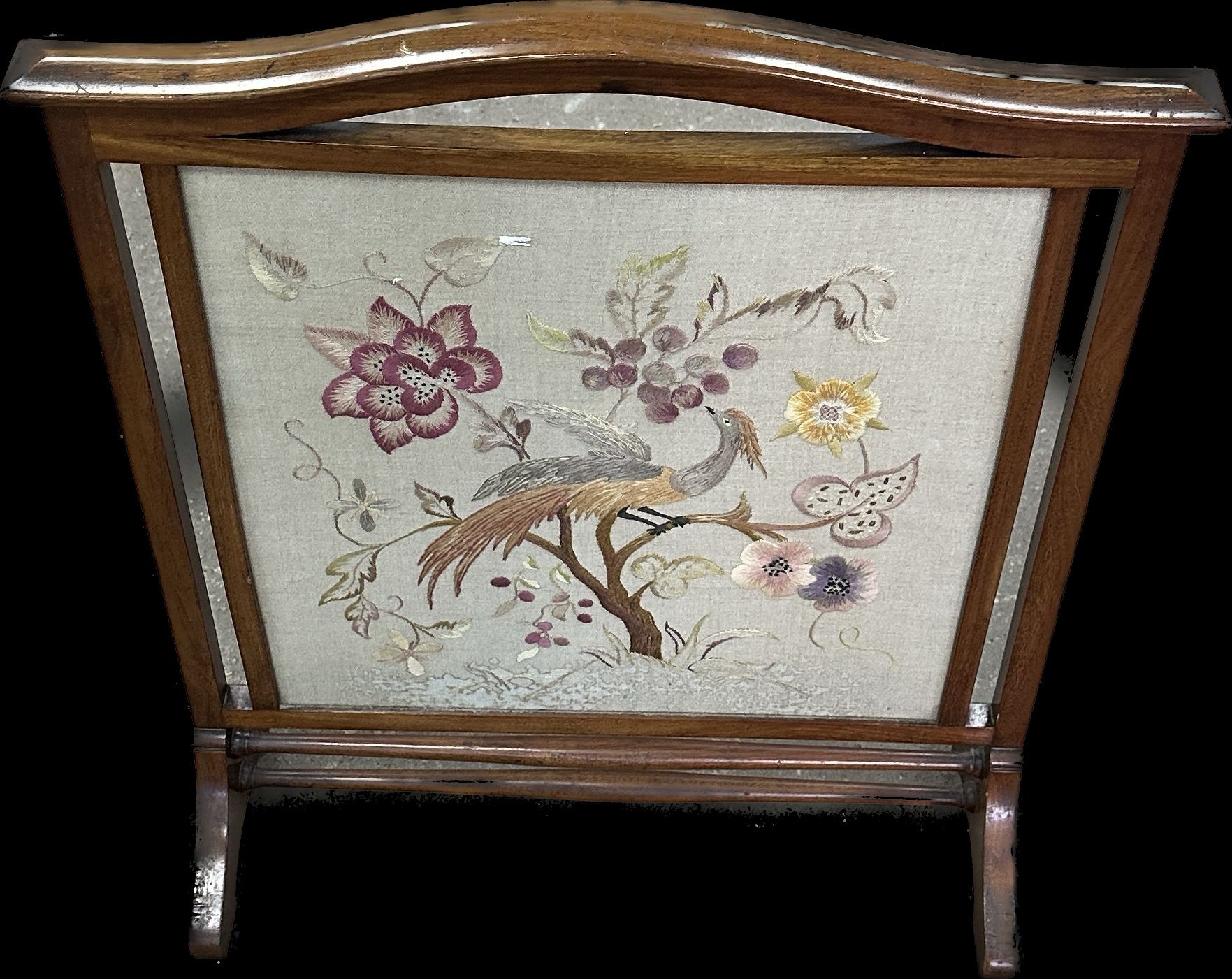 Vintage mahogany framed fire screen with tapestry insert measures approximately 31 inches tall x 26 wide