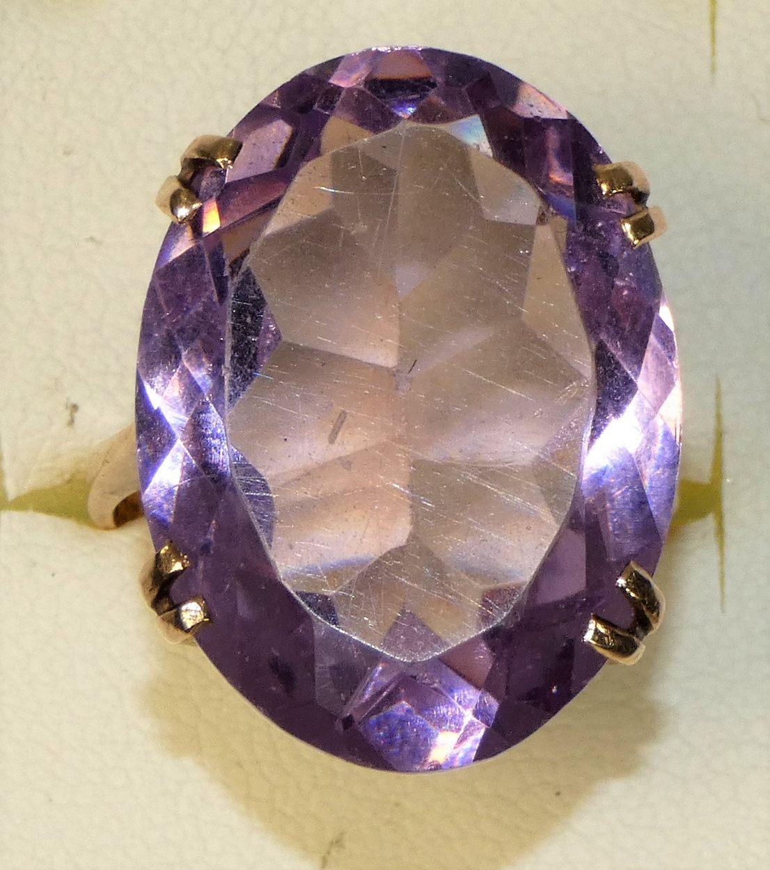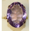 A 9ct rose gold mounted amethyst ring, four claw set with on oval mixed cut stone, 25 x 20 mm, size R.