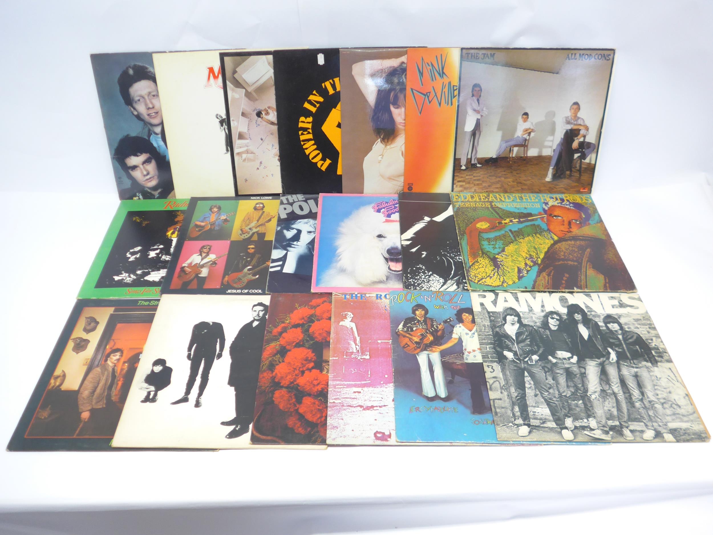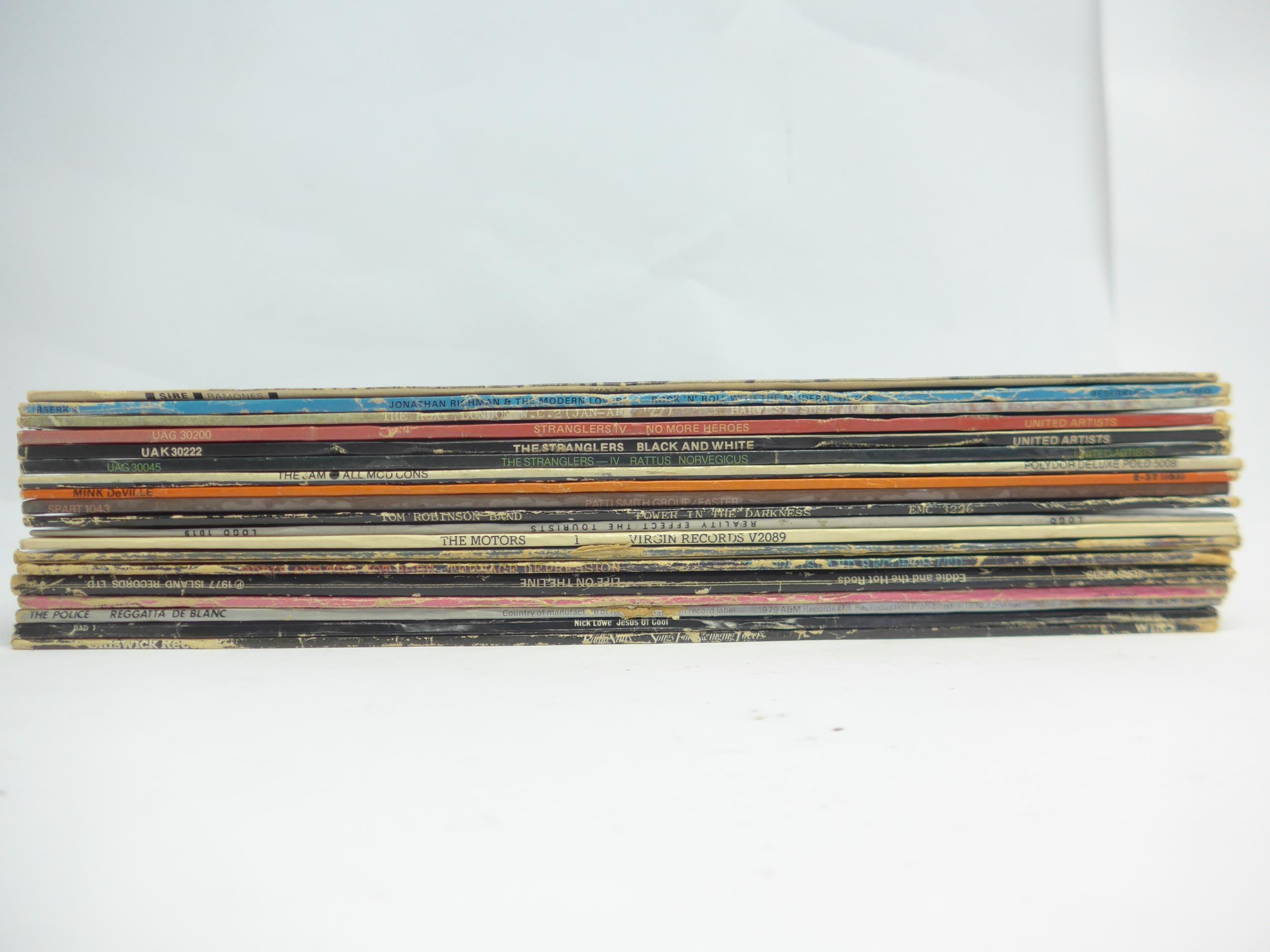 Punk / New Wave - A collection of nineteen LPs to include RAMONES: 'Ramones' original UK pressing (Sire 9103-253, no insert), THE MODERN LOVERS: 'Rock N Roll With The Modern Lovers' (BSERK 9), THE STRANGLERS: 'No More Heroes' (UAG 30200), 'Black And White' complete with bonus 7" on white vinyl and printed card insert (UAK 30222) and 'IV (Rattus Norvegicus)' (UAG 30045), EDDIE AND THE HOT RODS: 'Teenage Depression' with fold-out poster (ILPS 9457) and 'Life On The Line' (ILPS 9509), FABULOUS POODLES: 'Fabulous Poodles' (NSPL 18530), THE POLICE: 'Reggatta De Blanc' (AMLH 64792), NICK LOWE: 'Jesus Of Cool' (RAD 1), THE JAM: 'All Mod Cons' (POLD 5008), RADIO STARS: 'Songs For Swinging Lovers' (Wik5), MINK DEVILLE: 'Cabretta' (E-ST 11631), PATTI SMITH GROUP: 'Easter' with lyric insert (SPART 1043), TOM ROBINSON BAND: 'Power In The Darkness' with stencil insert (EMC 3226, tear to stencil), THE TOURISTS: 'Realing Effect' (LOGO 1019), THE MOTORS: '1' (V 2089) and 'Approved By The Motors' (V2101), and 'The Roxy London WC2 (Jan-Apr 77)' compilation (SHSP 4069) (19, vinyl and sleeves VG-VG+)